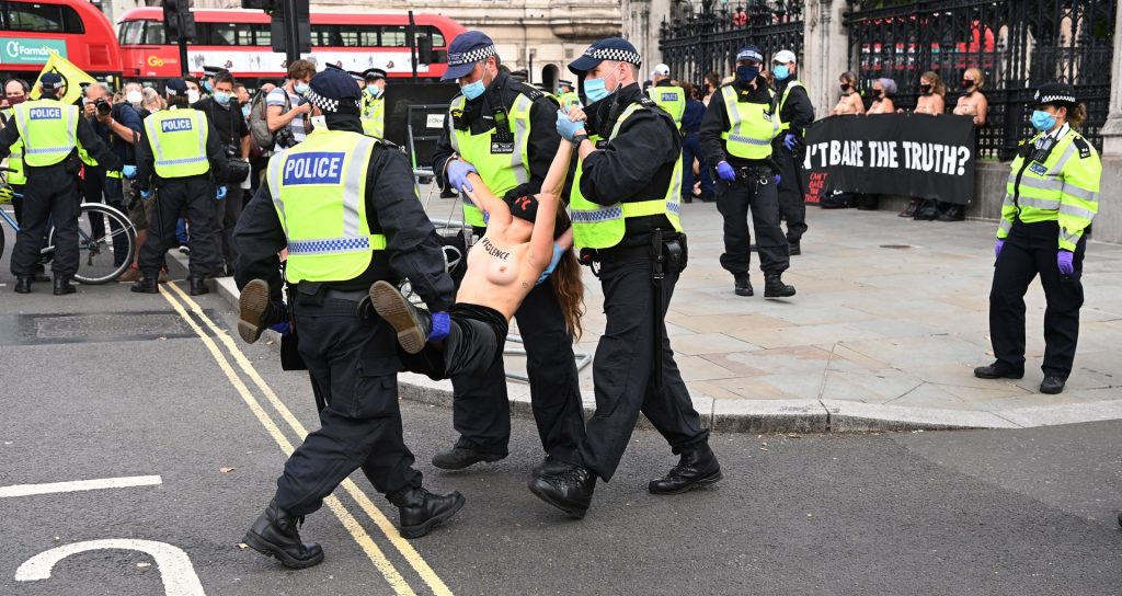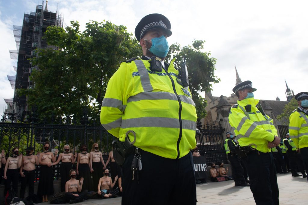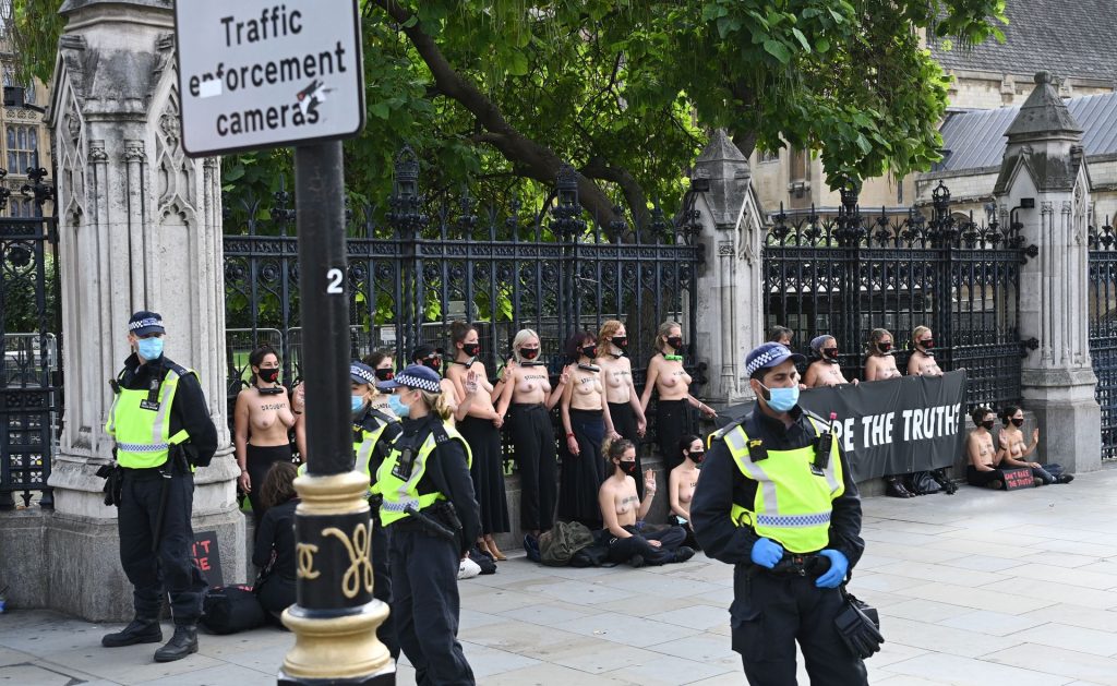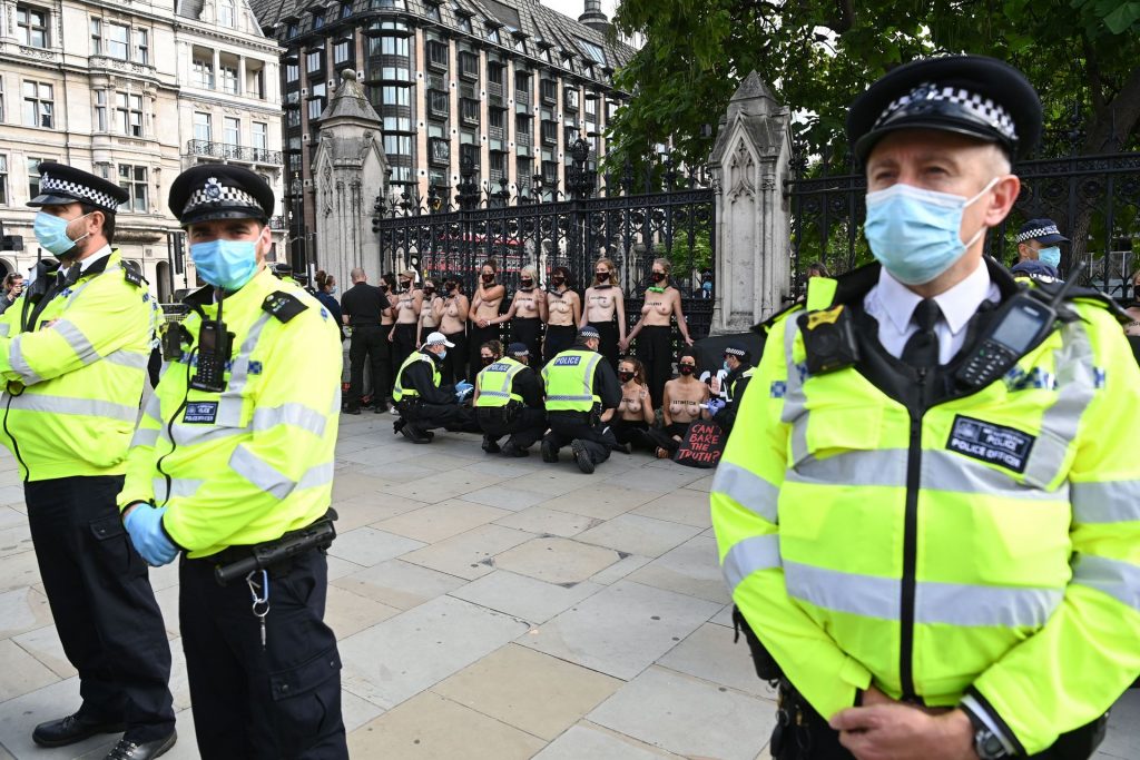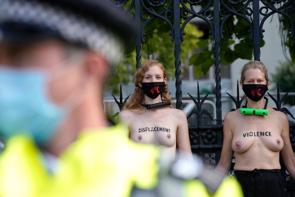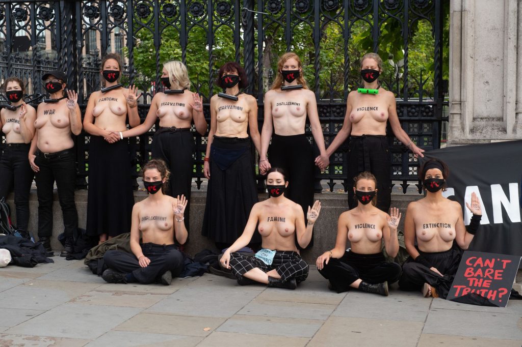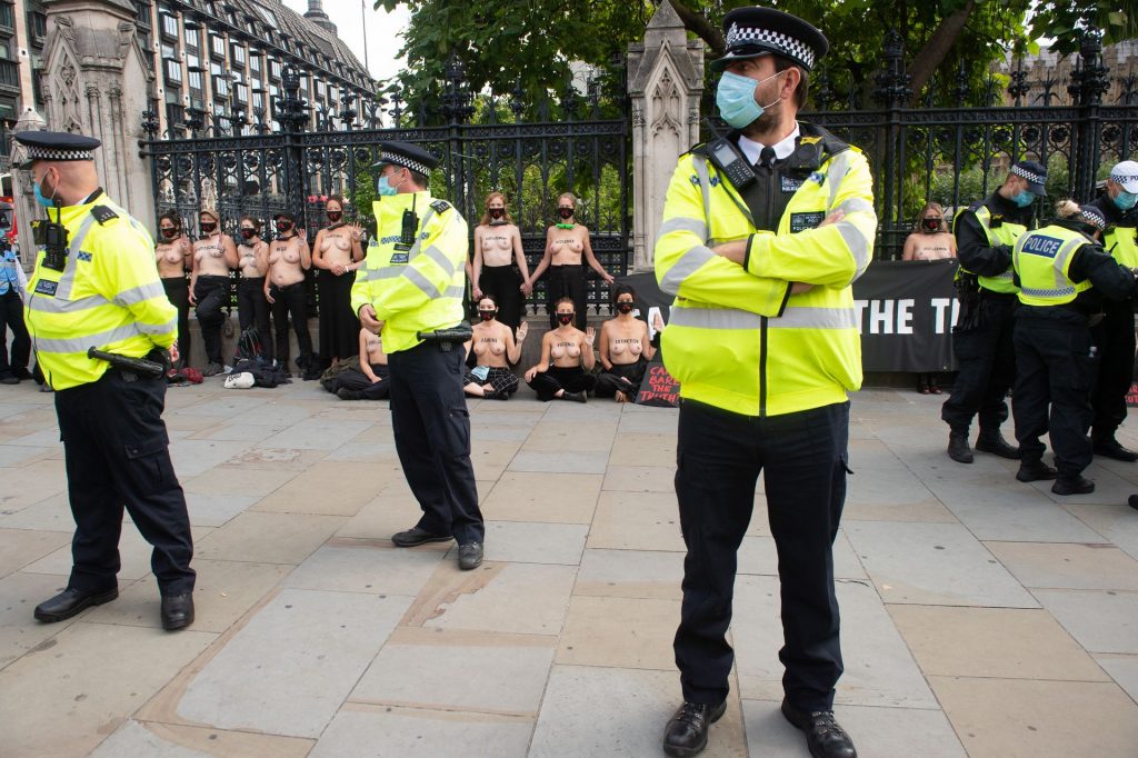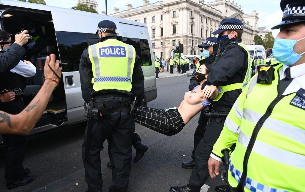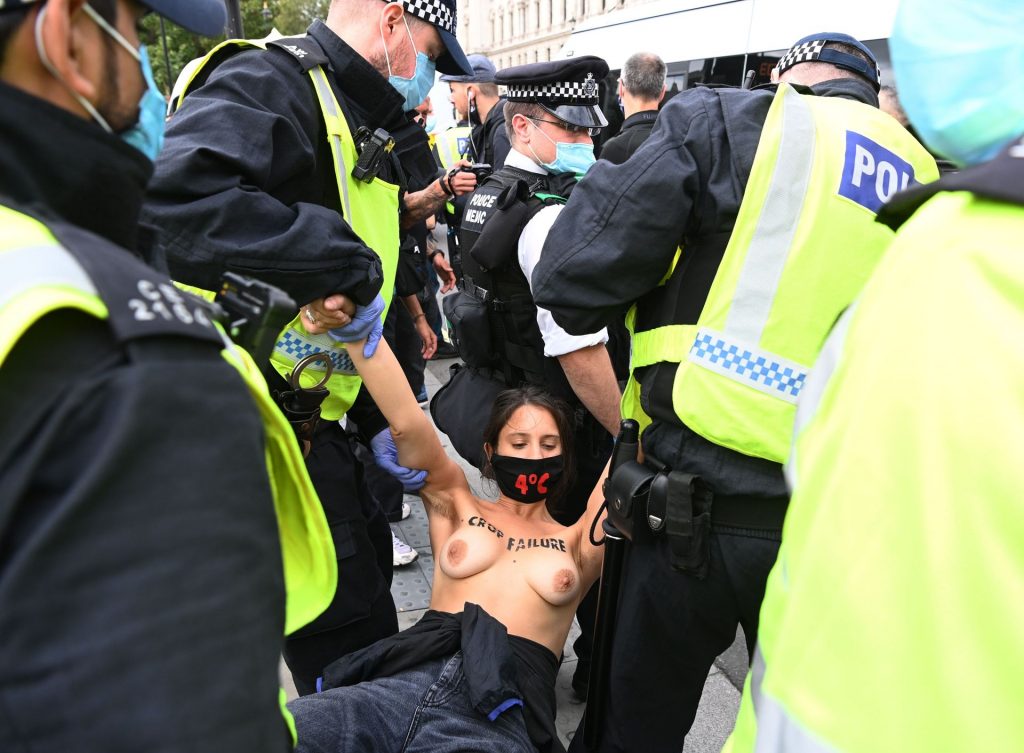 Активисты из движения Extinction Rebellion, выступающего за борьбу с изменением климата, стоят топлес и находятся под наблюдением полицейских после того, как прикрепили себя к перилам на демонстрации у парламента Великобритании в центре Лондона в последний день новой серии своих “массовых восстаний”. Протестующие за климат провели 10 дней демонстраций, организованных по всей стране активистской группой Extinction Rebellion.