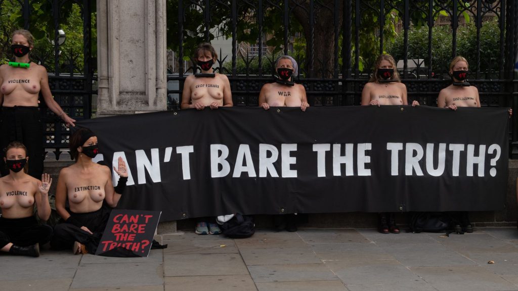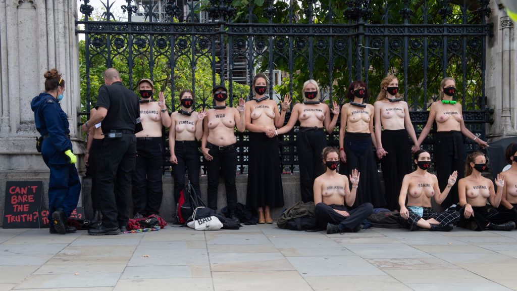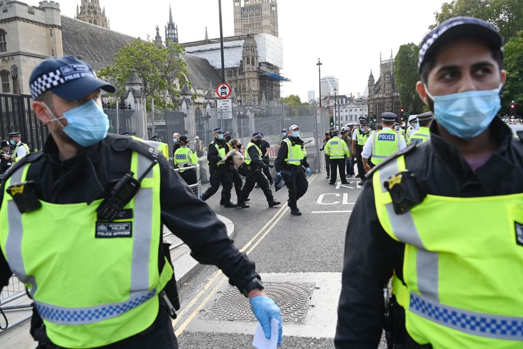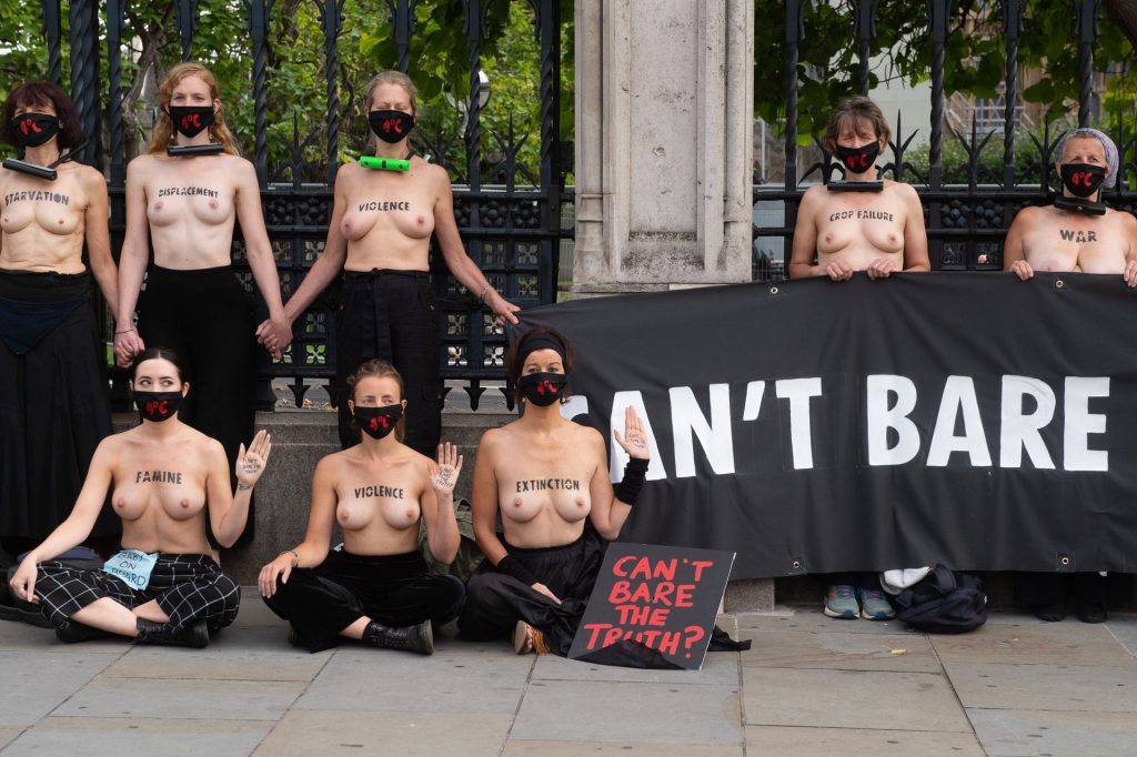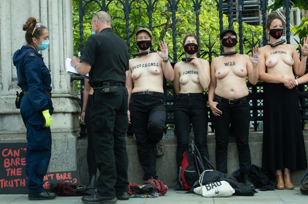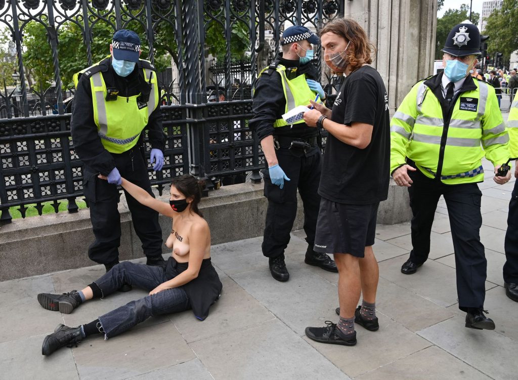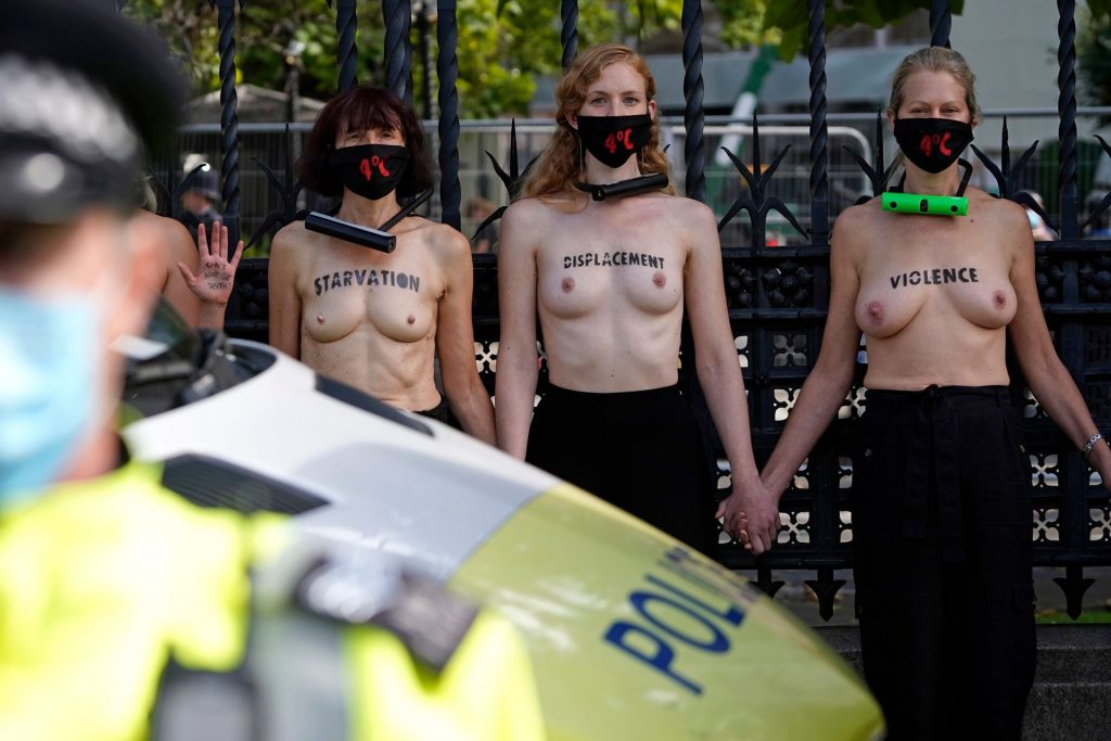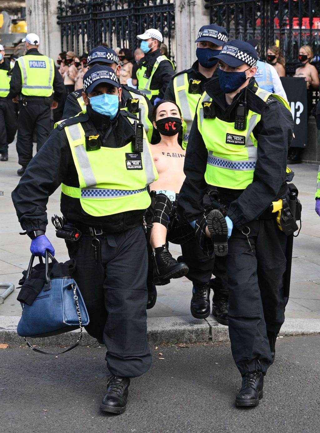 Активисты из движения Extinction Rebellion, выступающего за борьбу с изменением климата, стоят топлес и находятся под наблюдением полицейских после того, как прикрепили себя к перилам на демонстрации у парламента Великобритании в центре Лондона в последний день новой серии своих “массовых восстаний”. Протестующие за климат провели 10 дней демонстраций, организованных по всей стране активистской группой Extinction Rebellion.