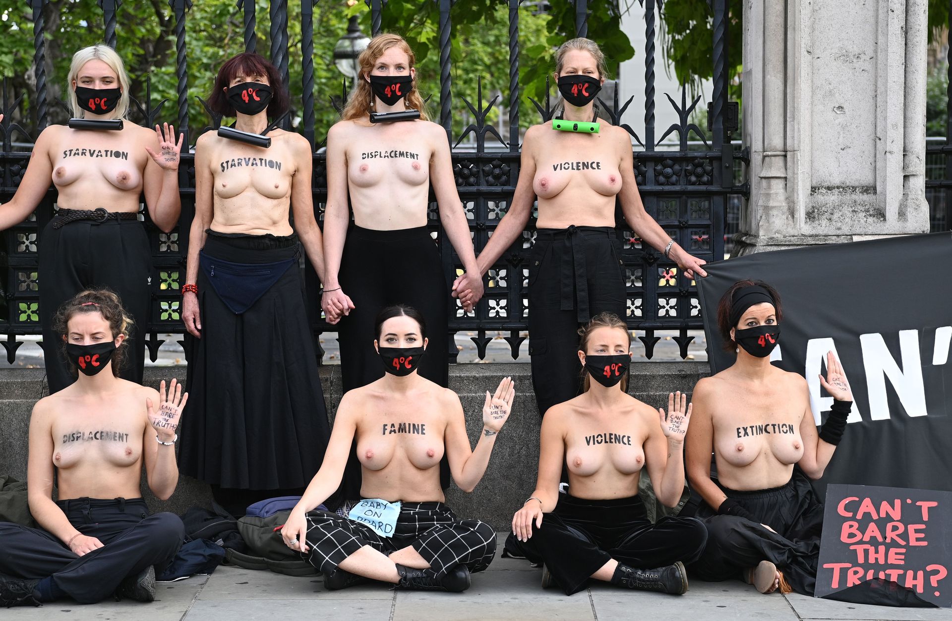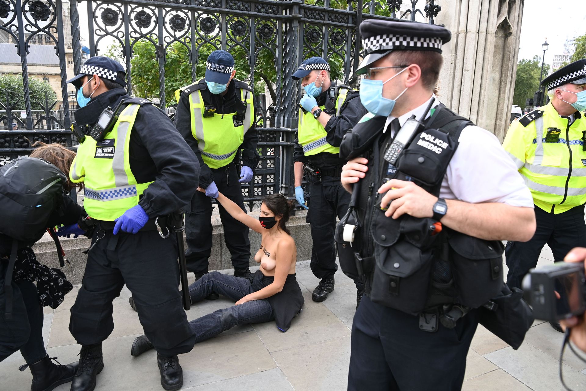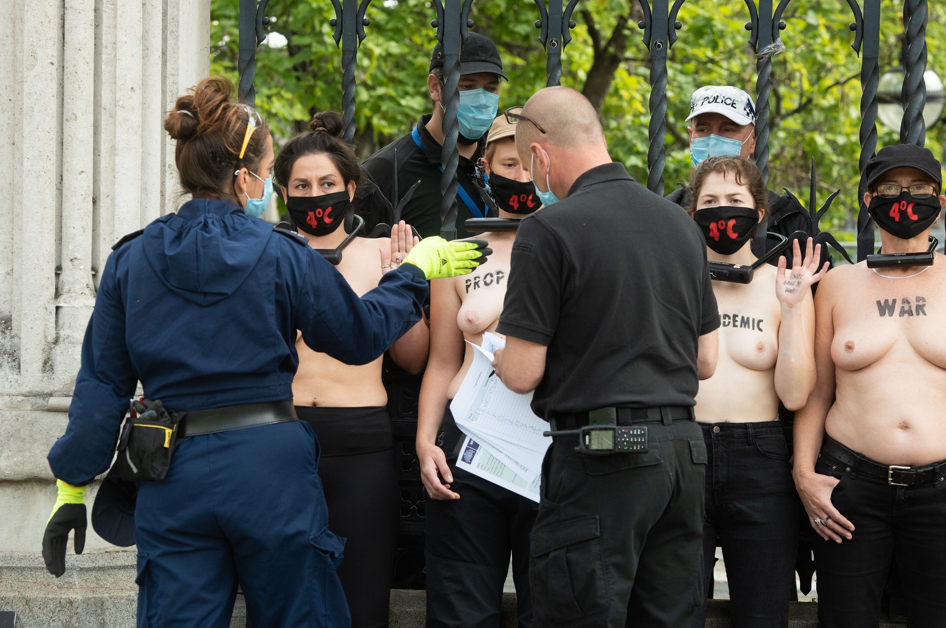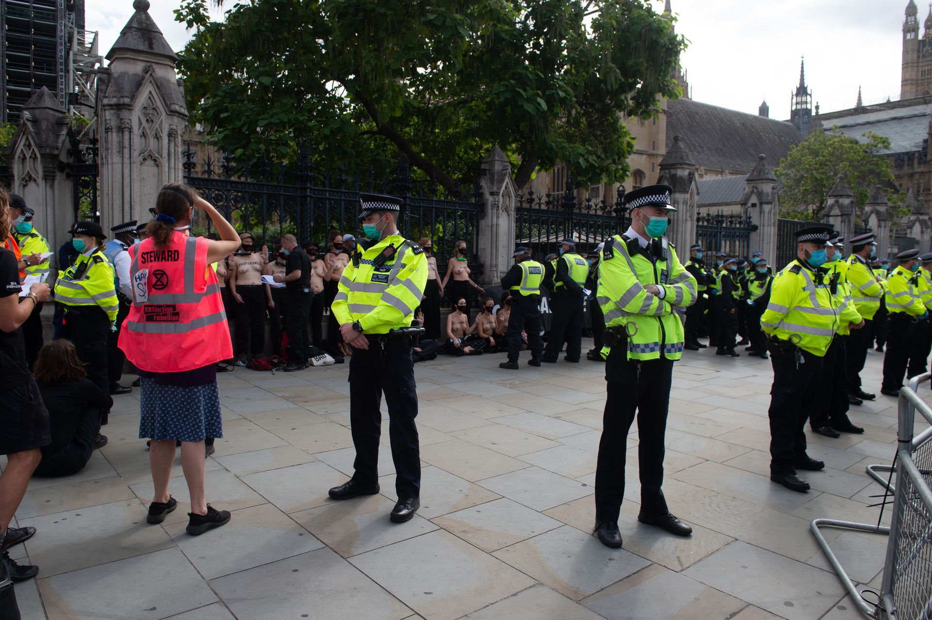 Активисты из движения Extinction Rebellion, выступающего за борьбу с изменением климата, стоят топлес и находятся под наблюдением полицейских после того, как прикрепили себя к перилам на демонстрации у парламента Великобритании в центре Лондона в последний день новой серии своих “массовых восстаний”. Протестующие за климат провели 10 дней демонстраций, организованных по всей стране активистской группой Extinction Rebellion.