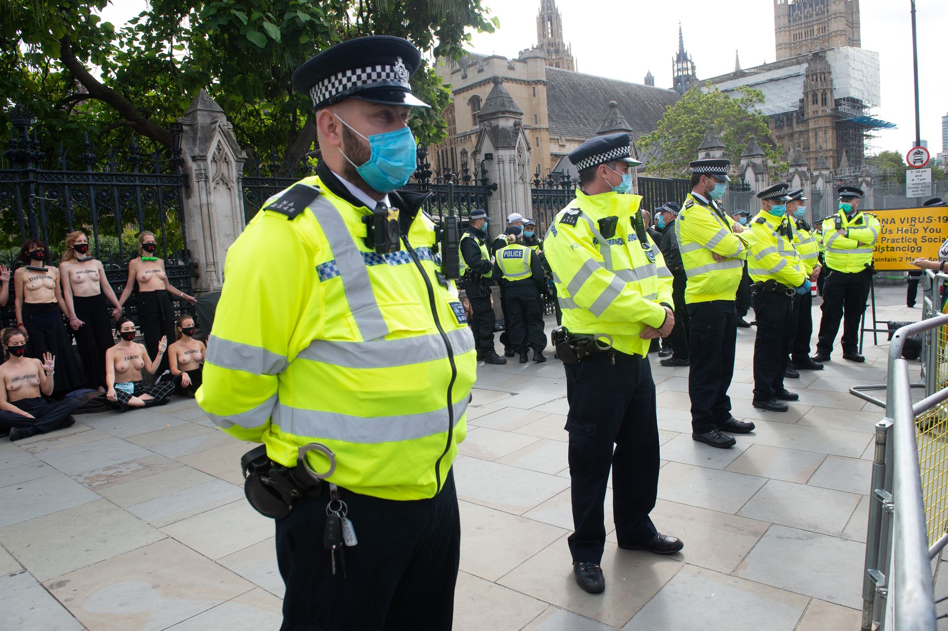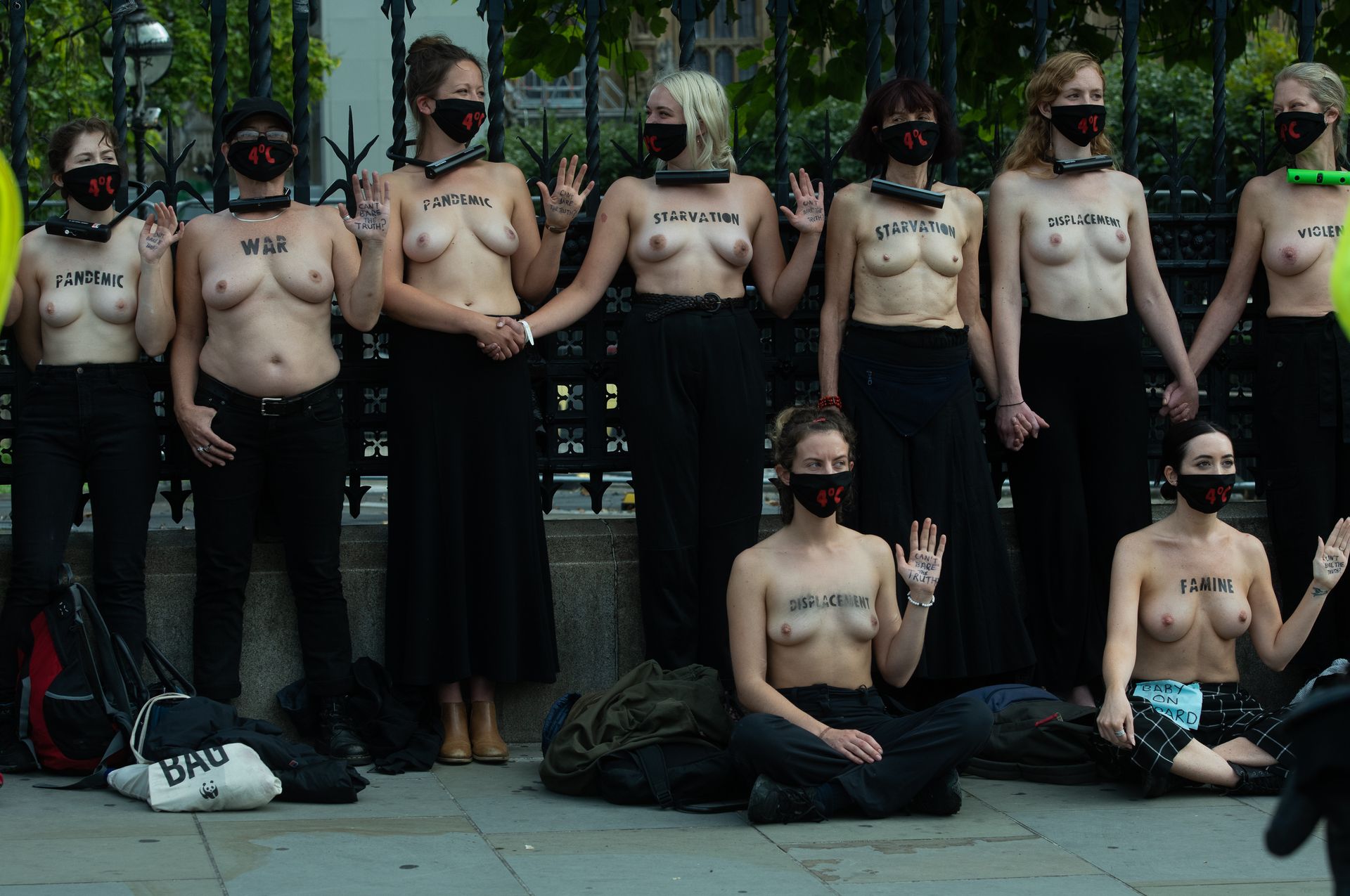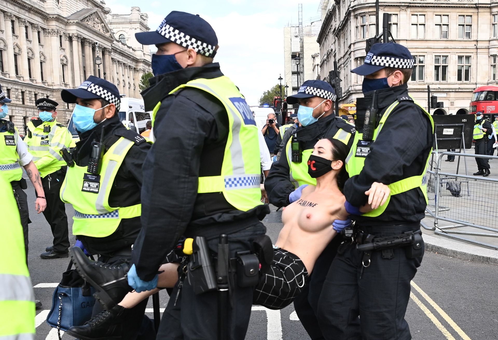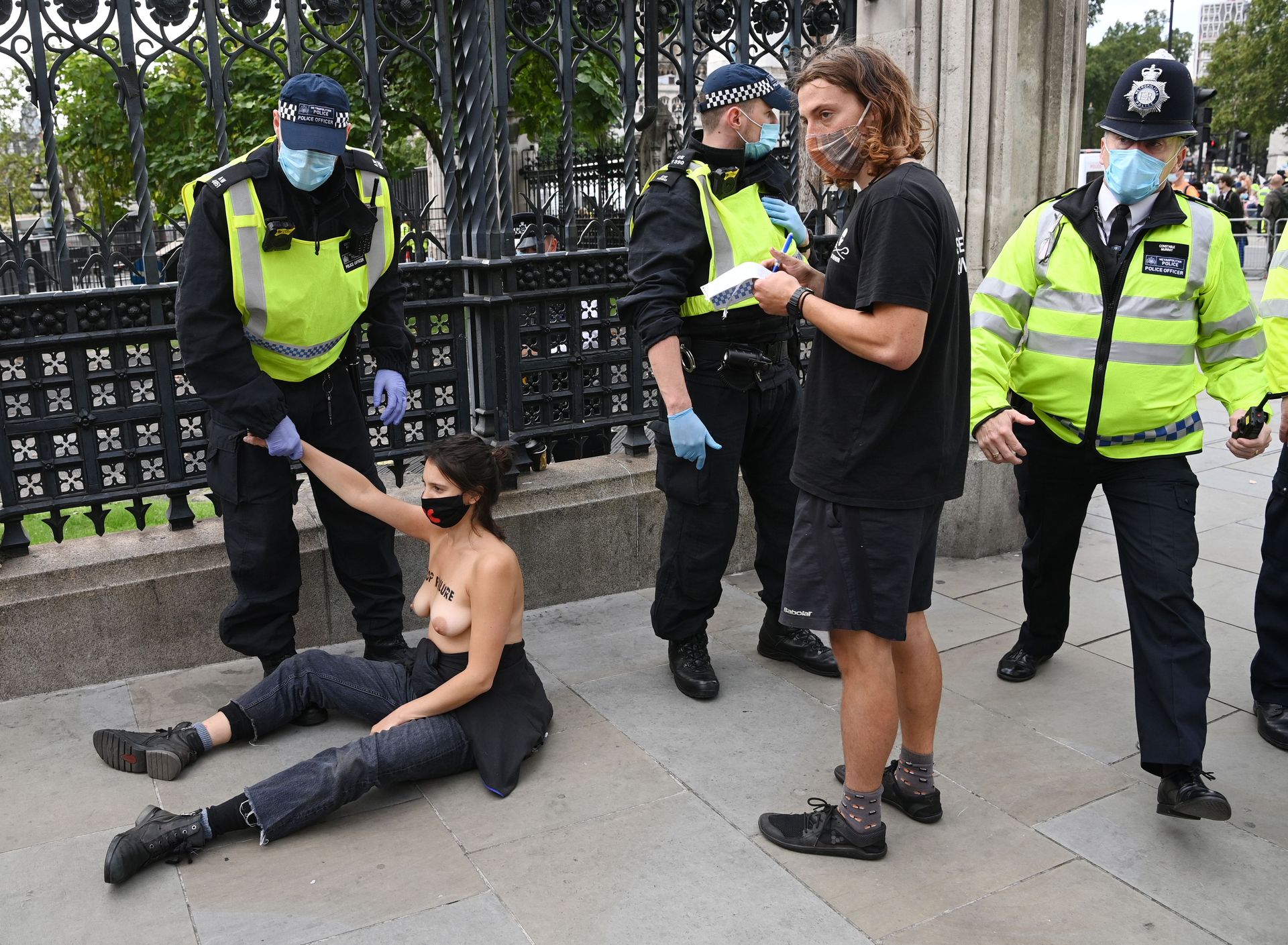 Активисты из движения Extinction Rebellion, выступающего за борьбу с изменением климата, стоят топлес и находятся под наблюдением полицейских после того, как прикрепили себя к перилам на демонстрации у парламента Великобритании в центре Лондона в последний день новой серии своих “массовых восстаний”. Протестующие за климат провели 10 дней демонстраций, организованных по всей стране активистской группой Extinction Rebellion.