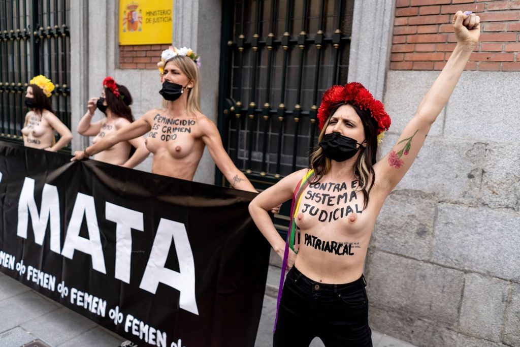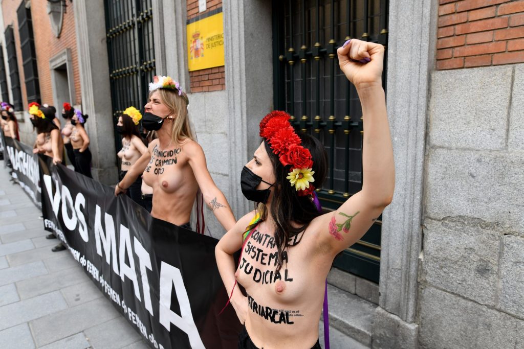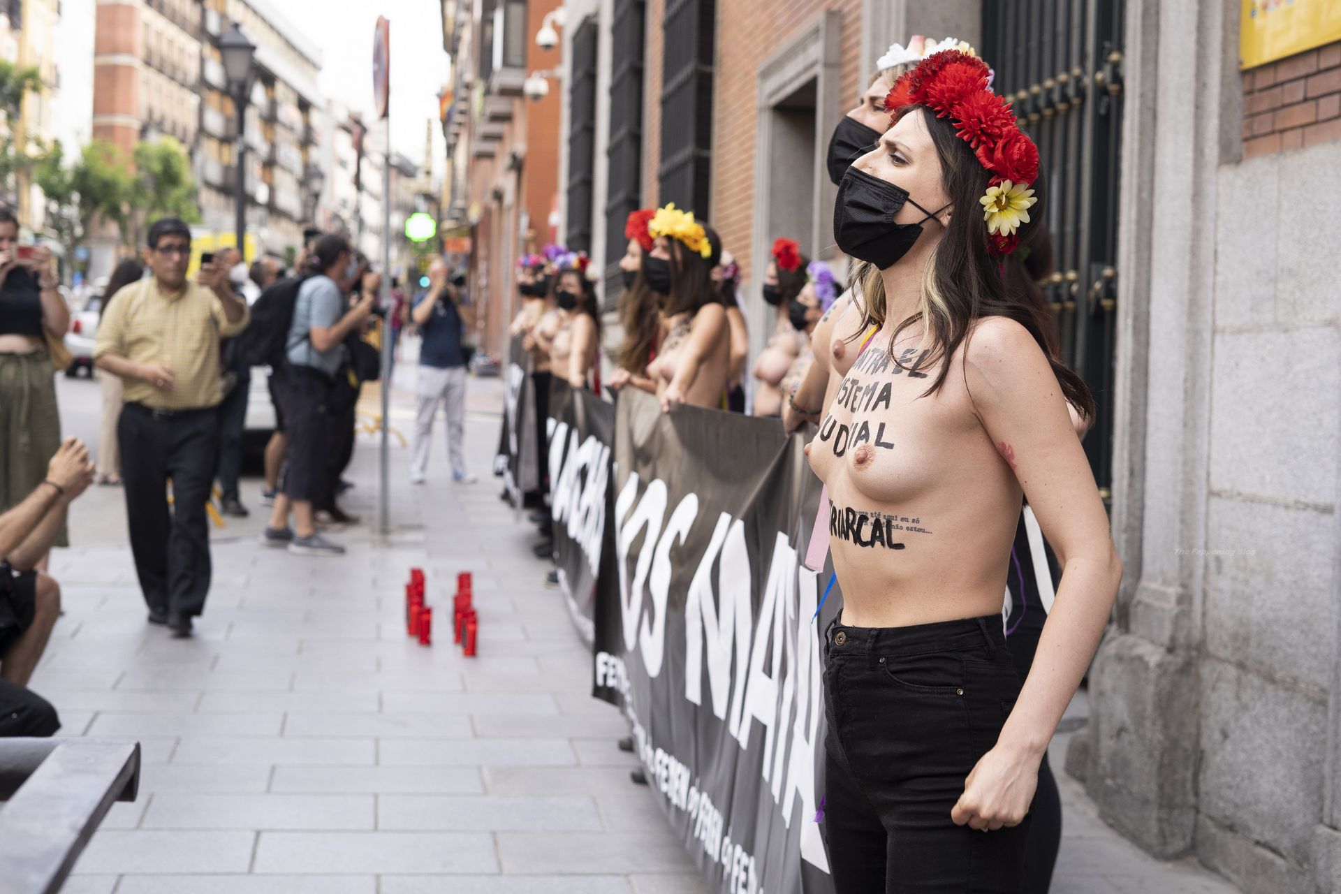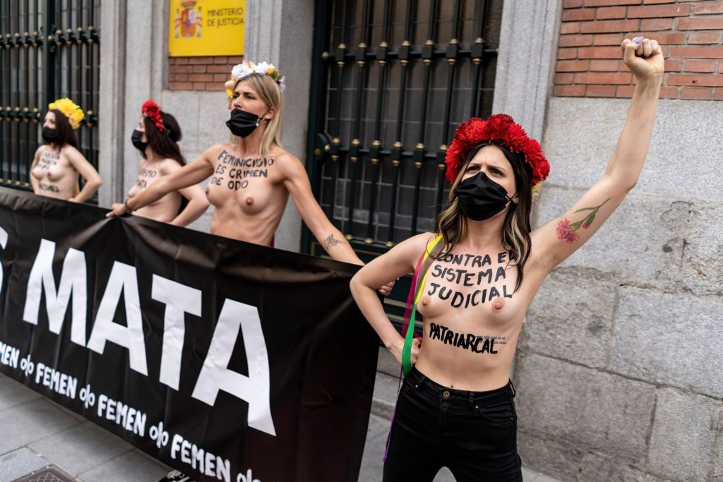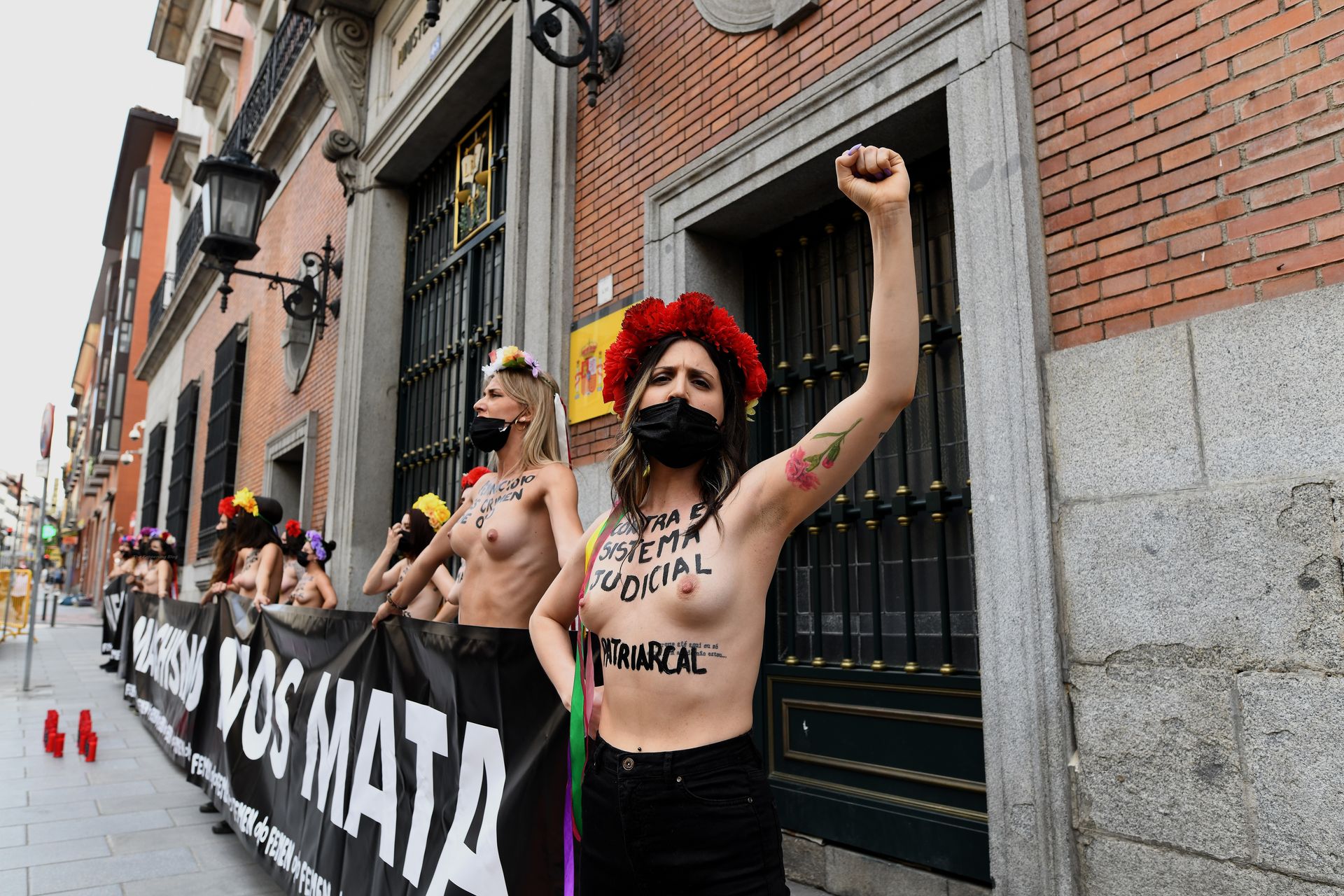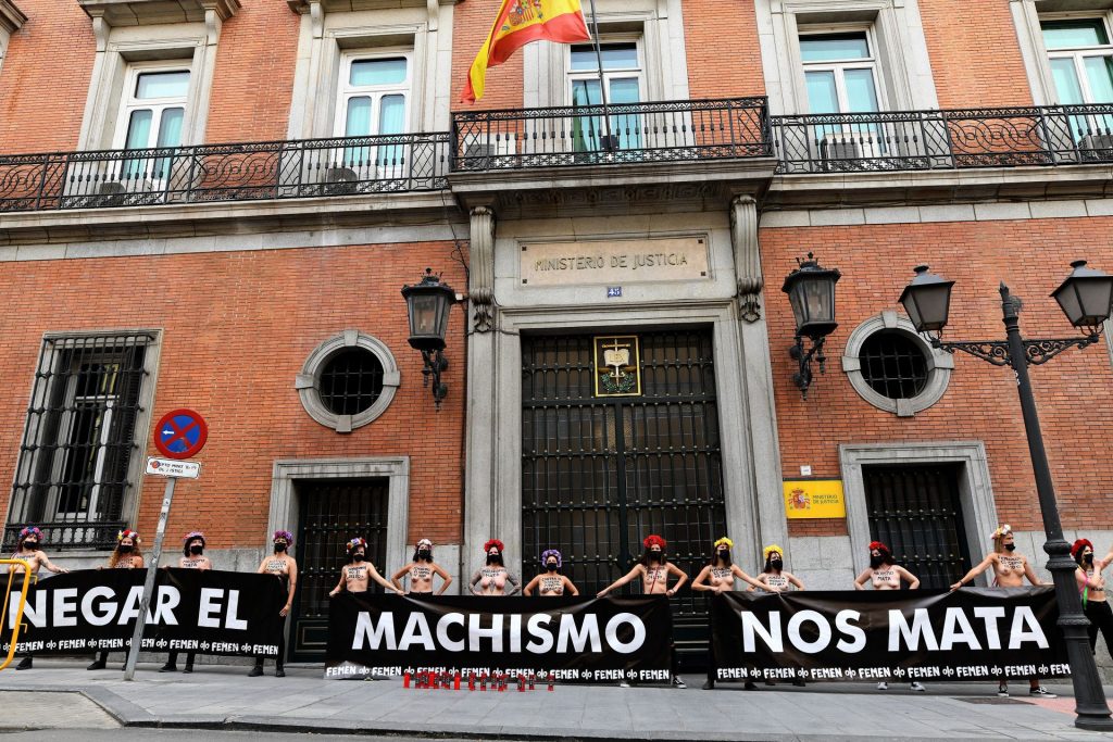 Голые активистки Femen протестуют против феминицида и требуют помилования для Хуаны Ривас перед Министерством юстиции в Мадриде, Испания, 11 июня 2021 года. Хуана Ривас — испанка, заключённая в тюрьму за то, что в 2017 году скрывалась с сыновьями, чтобы избежать насилия со стороны бывшего партнёра.