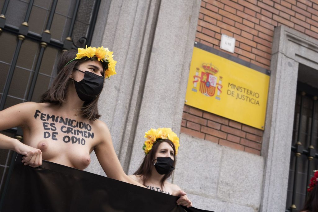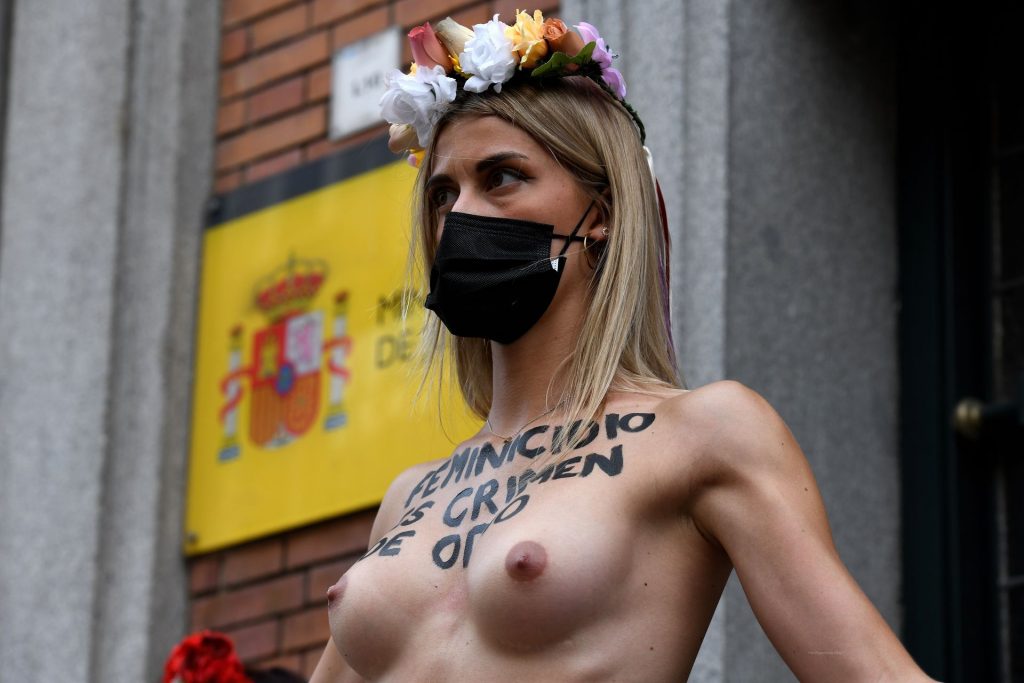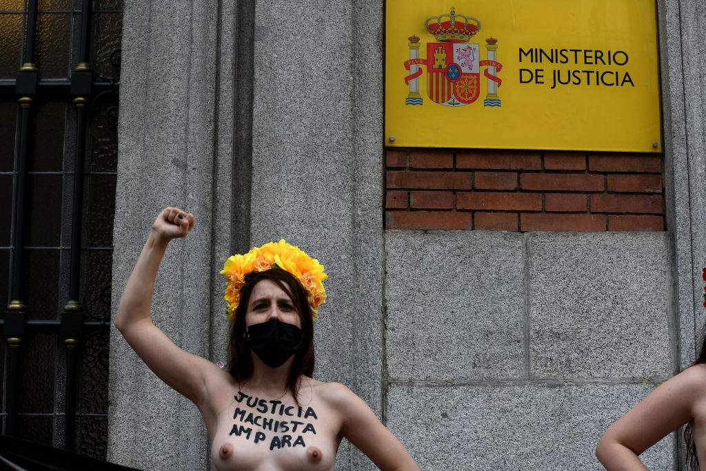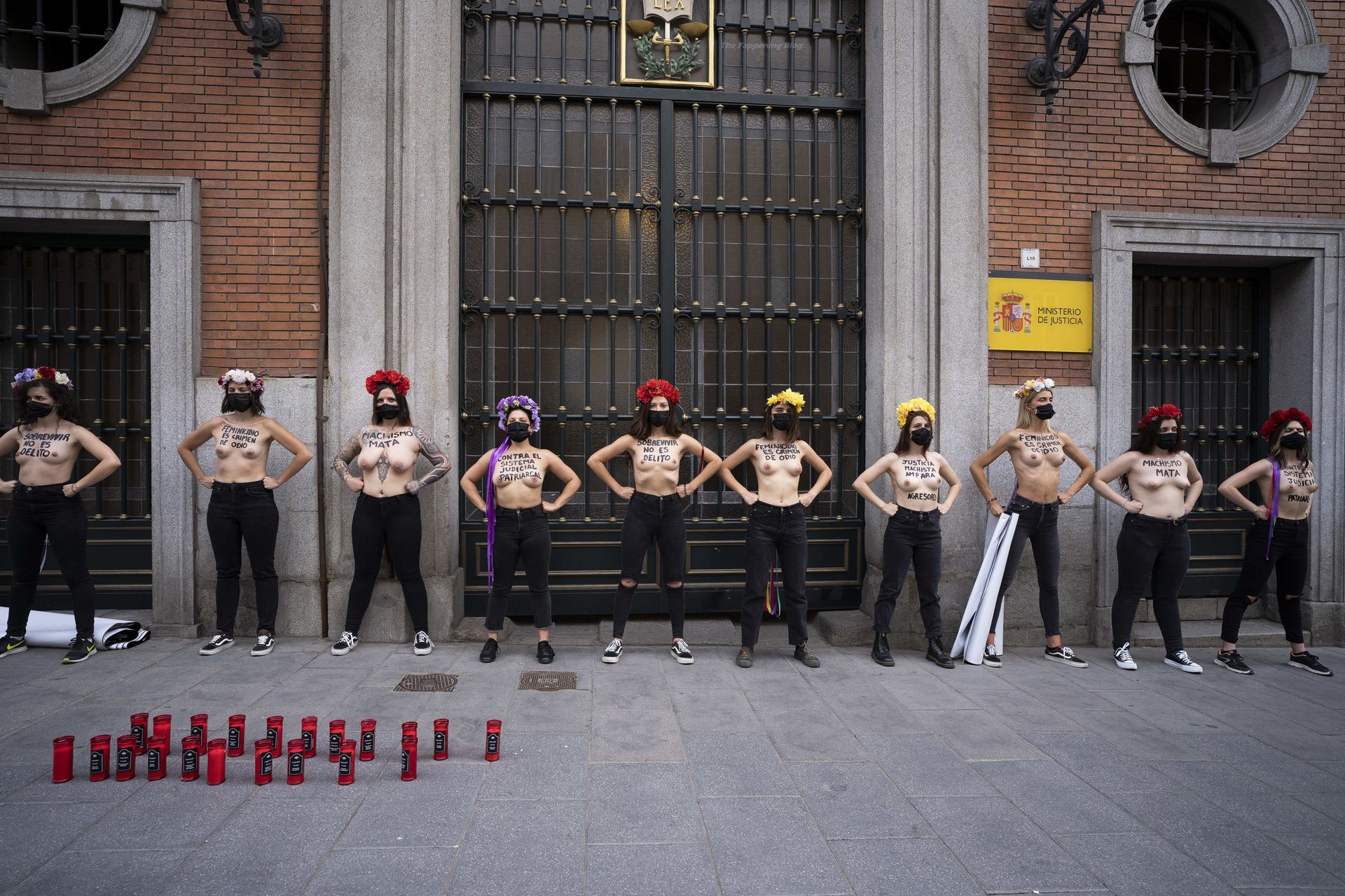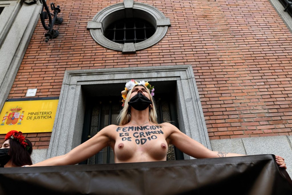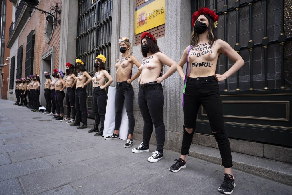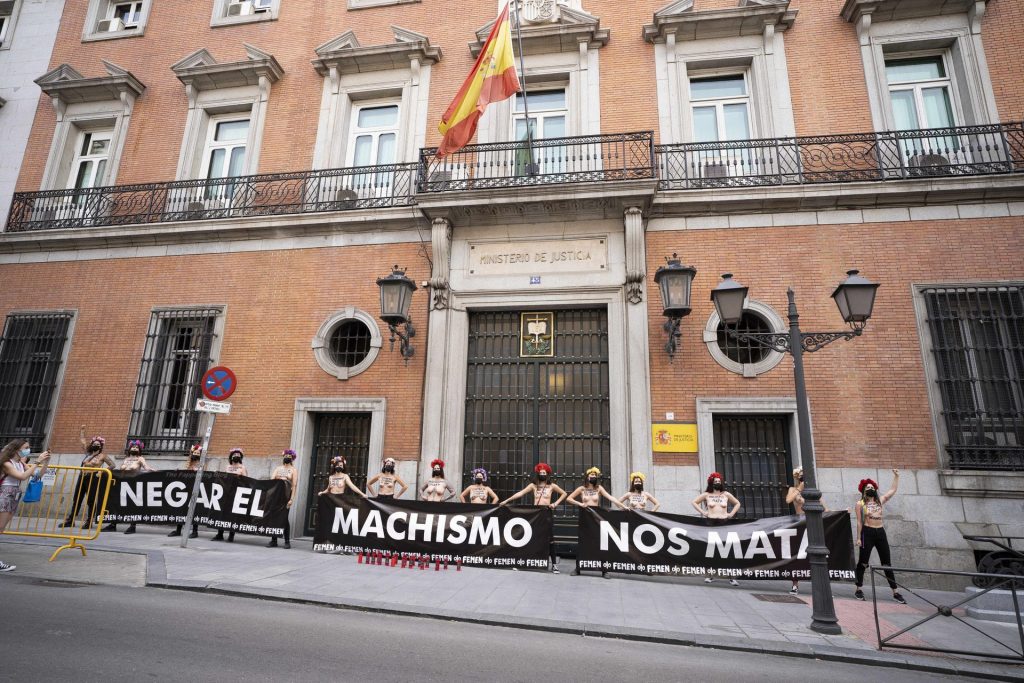 Голые активистки Femen протестуют против феминицида и требуют помилования для Хуаны Ривас перед Министерством юстиции в Мадриде, Испания, 11 июня 2021 года. Хуана Ривас — испанка, заключённая в тюрьму за то, что в 2017 году скрывалась с сыновьями, чтобы избежать насилия со стороны бывшего партнёра.
