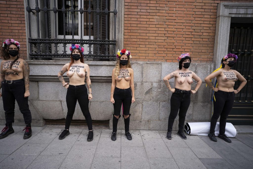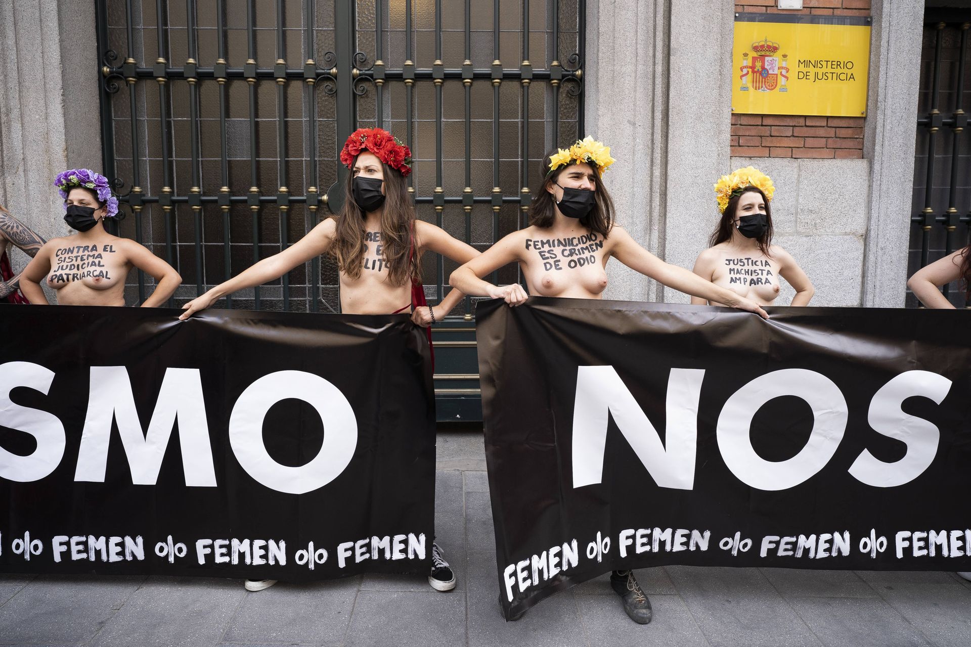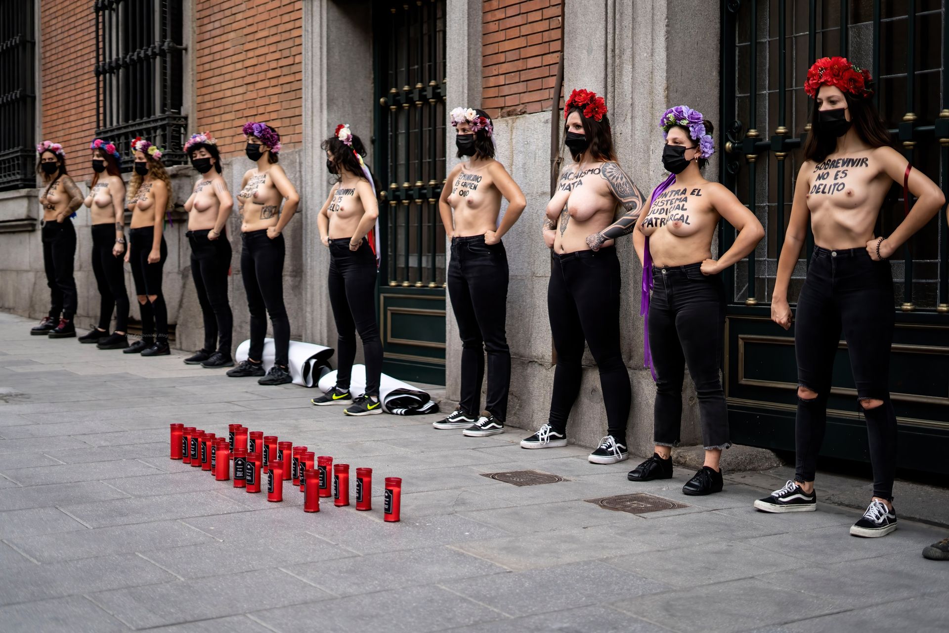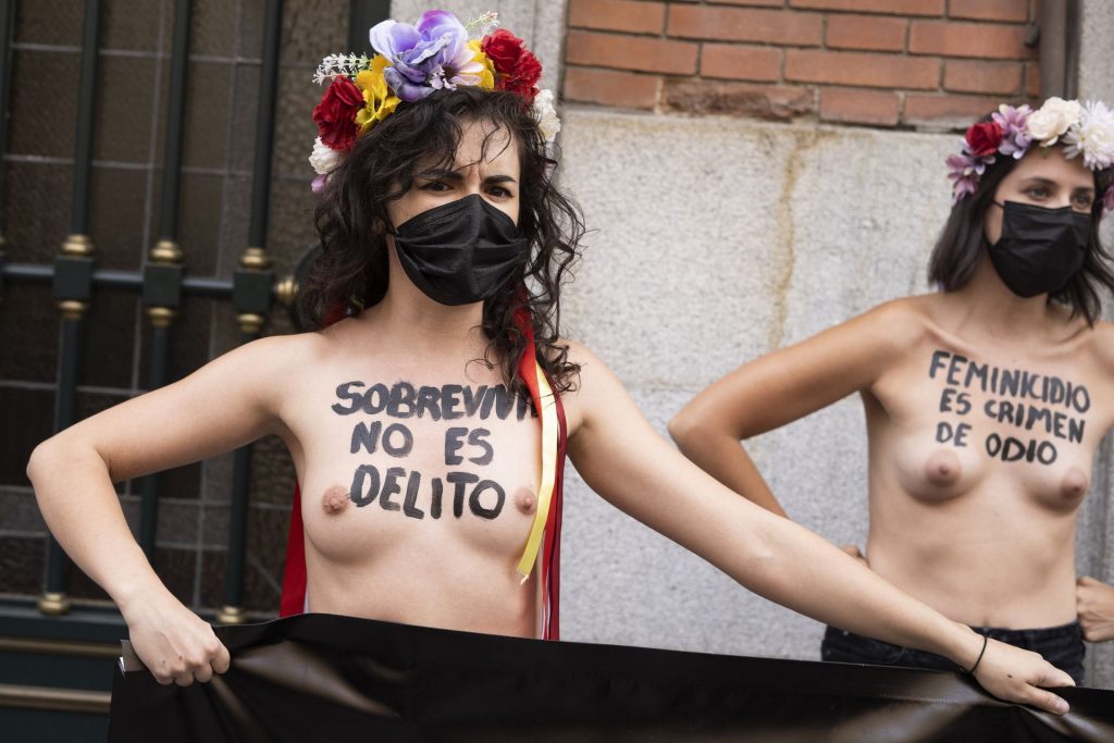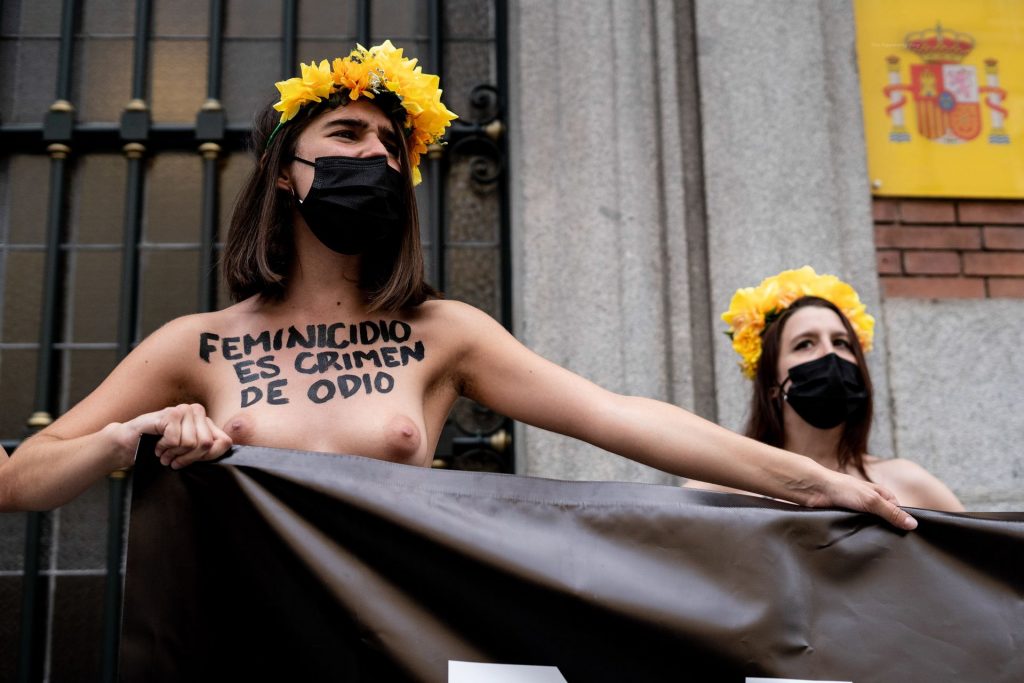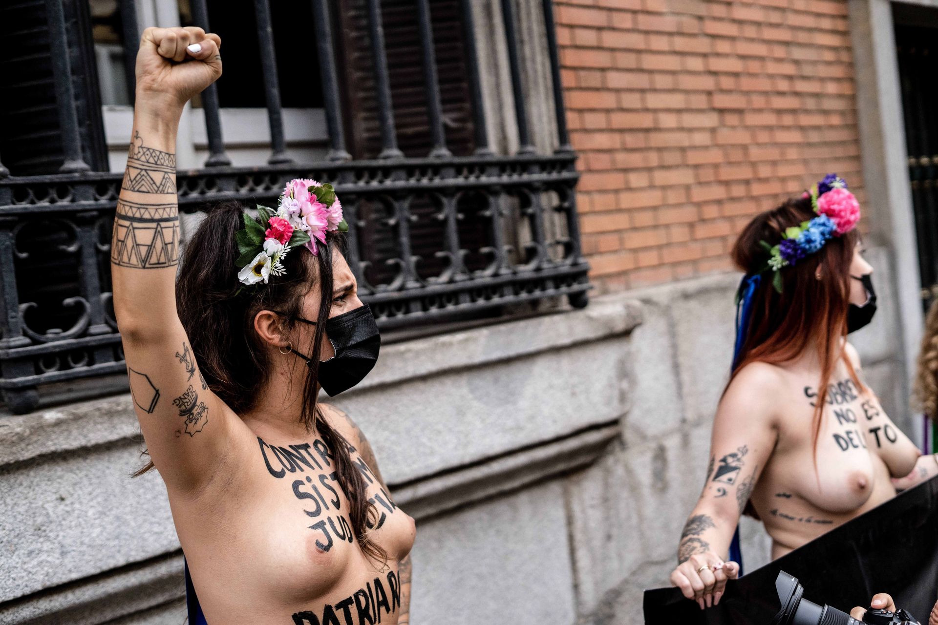 Голые активистки Femen протестуют против феминицида и требуют помилования для Хуаны Ривас перед Министерством юстиции в Мадриде, Испания, 11 июня 2021 года. Хуана Ривас — испанка, заключённая в тюрьму за то, что в 2017 году скрывалась с сыновьями, чтобы избежать насилия со стороны бывшего партнёра.