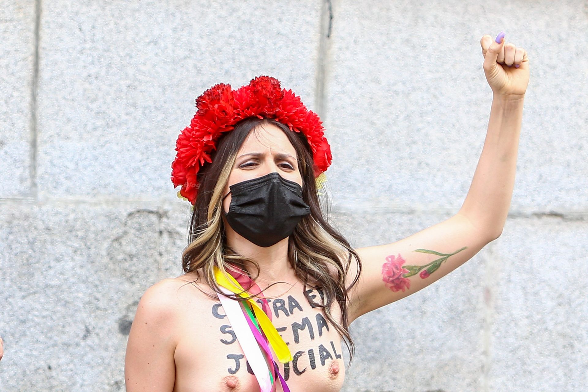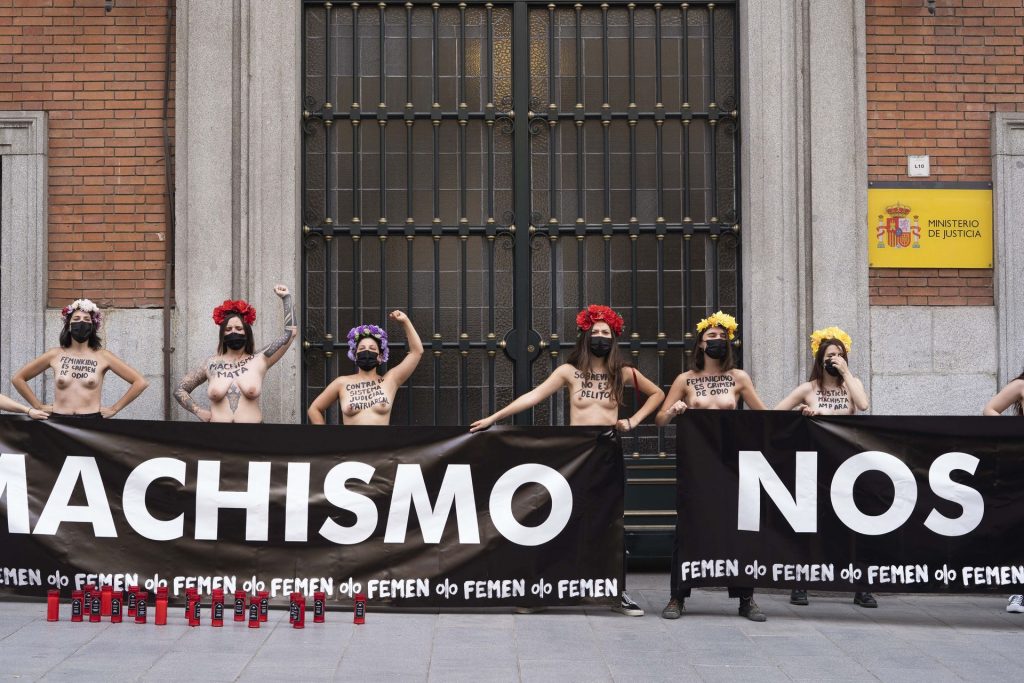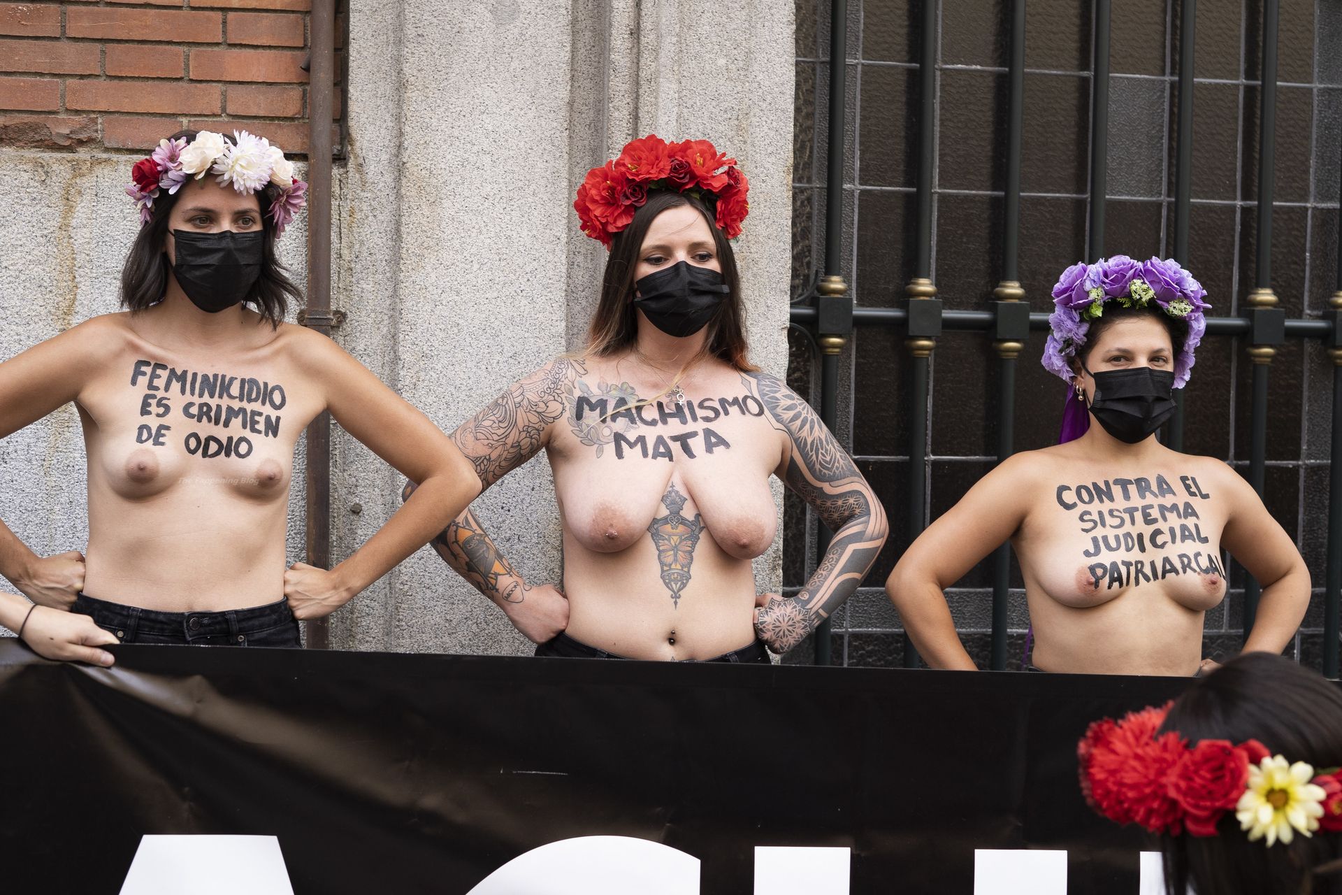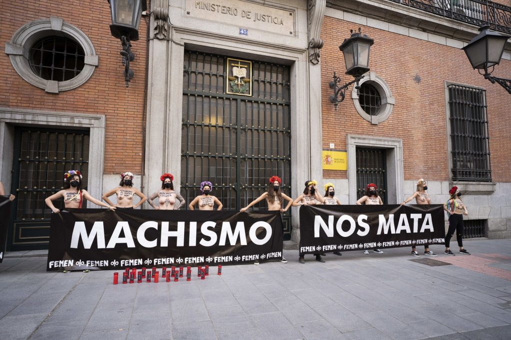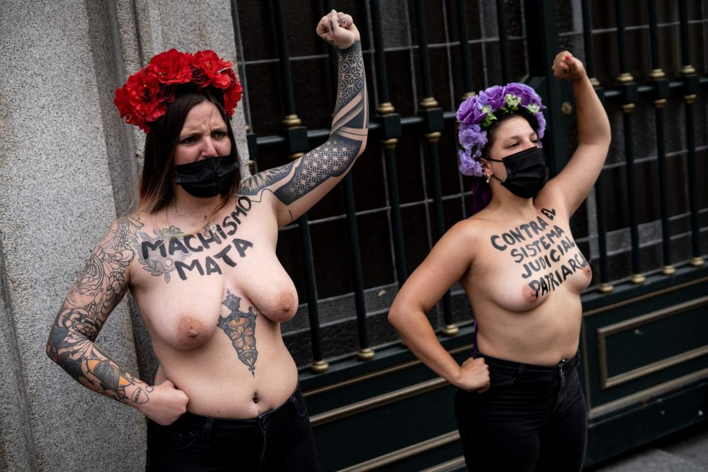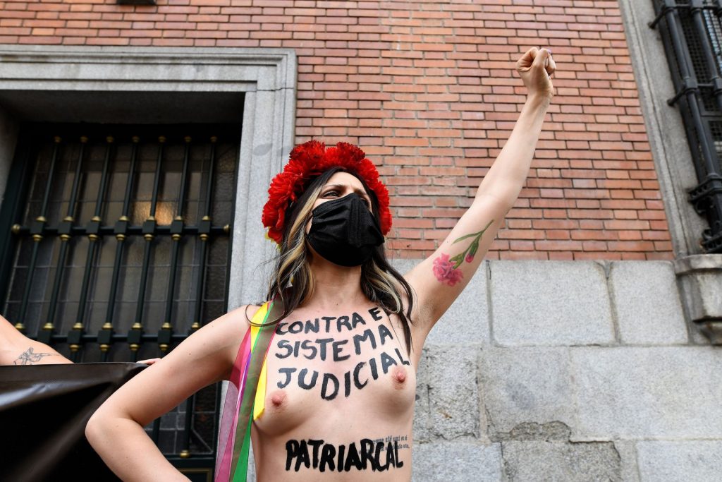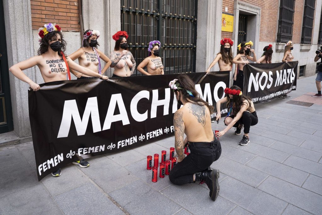 Голые активистки Femen протестуют против феминицида и требуют помилования для Хуаны Ривас перед Министерством юстиции в Мадриде, Испания, 11 июня 2021 года. Хуана Ривас — испанка, заключённая в тюрьму за то, что в 2017 году скрывалась с сыновьями, чтобы избежать насилия со стороны бывшего партнёра.