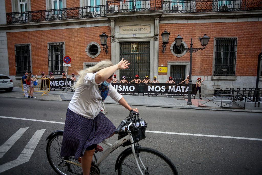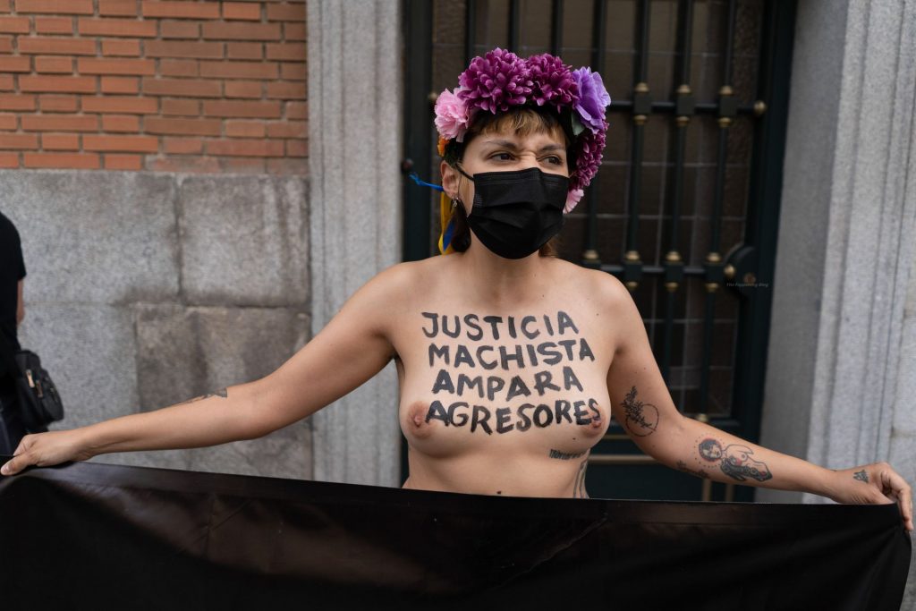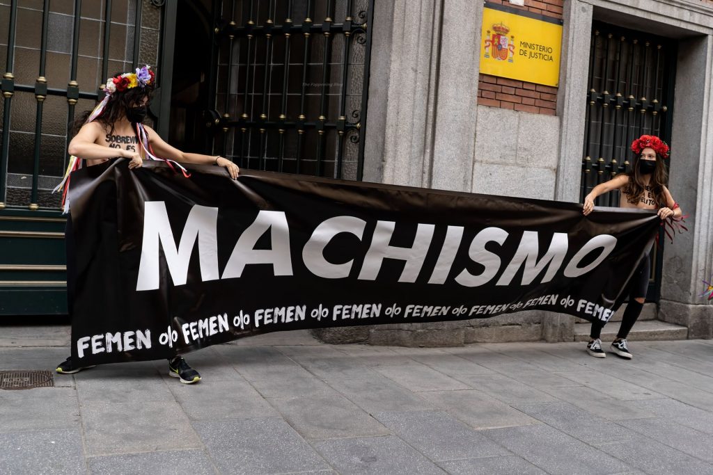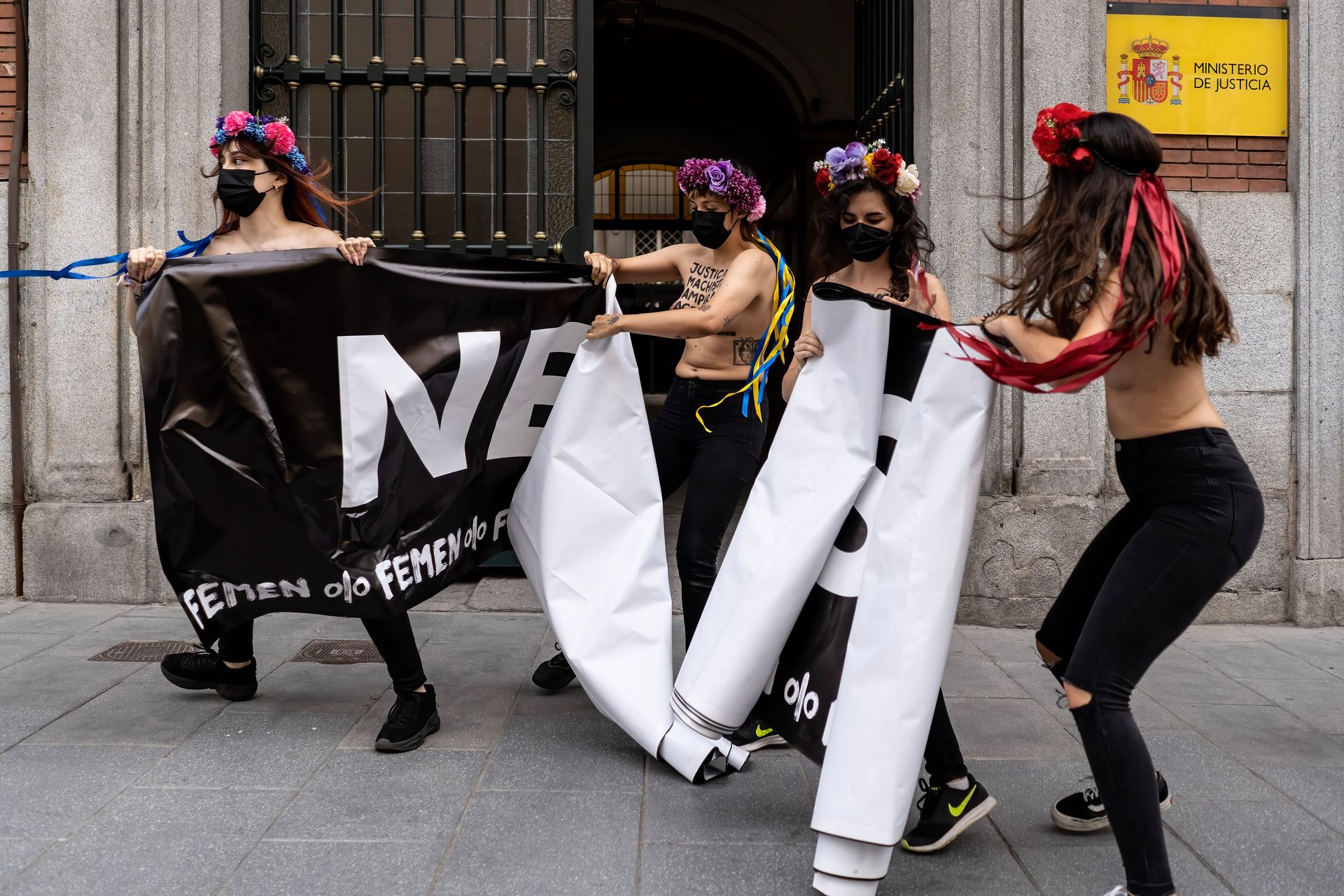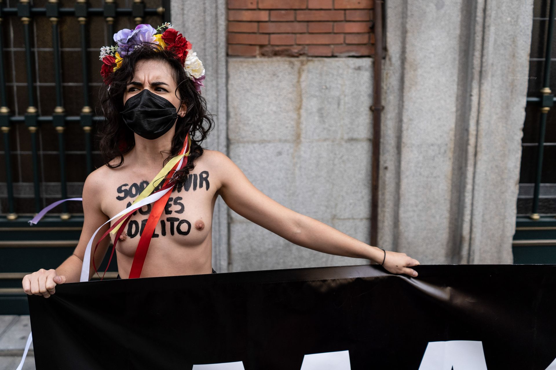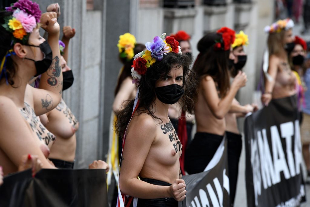 Голые активистки Femen протестуют против феминицида и требуют помилования для Хуаны Ривас перед Министерством юстиции в Мадриде, Испания, 11 июня 2021 года. Хуана Ривас — испанка, заключённая в тюрьму за то, что в 2017 году скрывалась с сыновьями, чтобы избежать насилия со стороны бывшего партнёра.