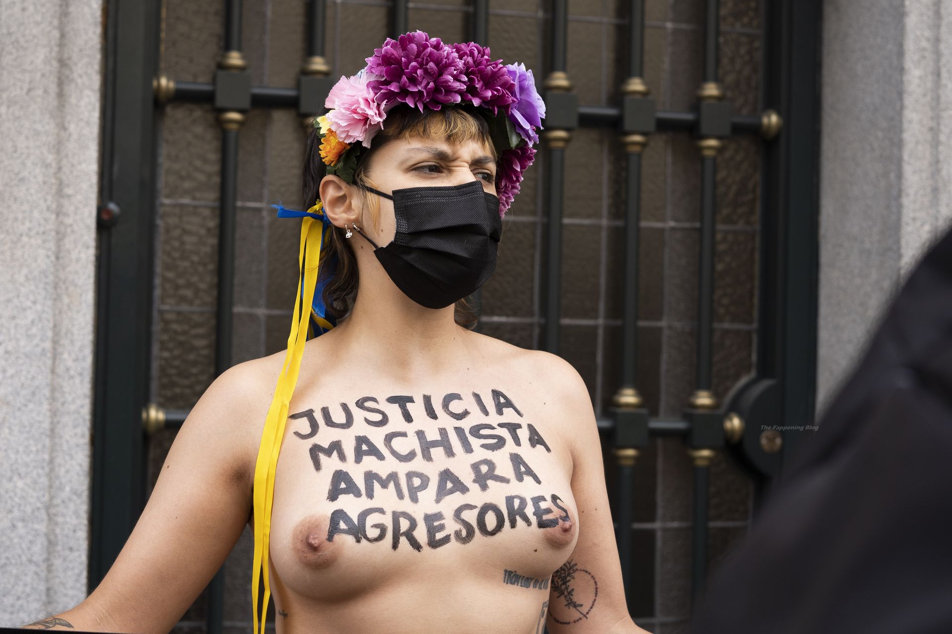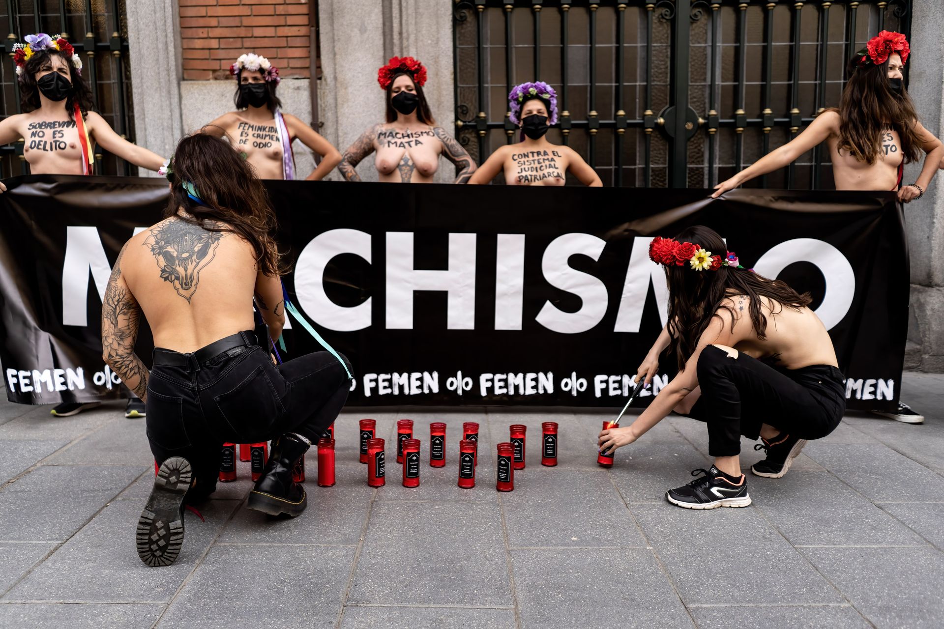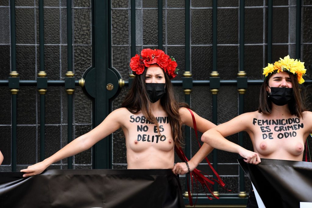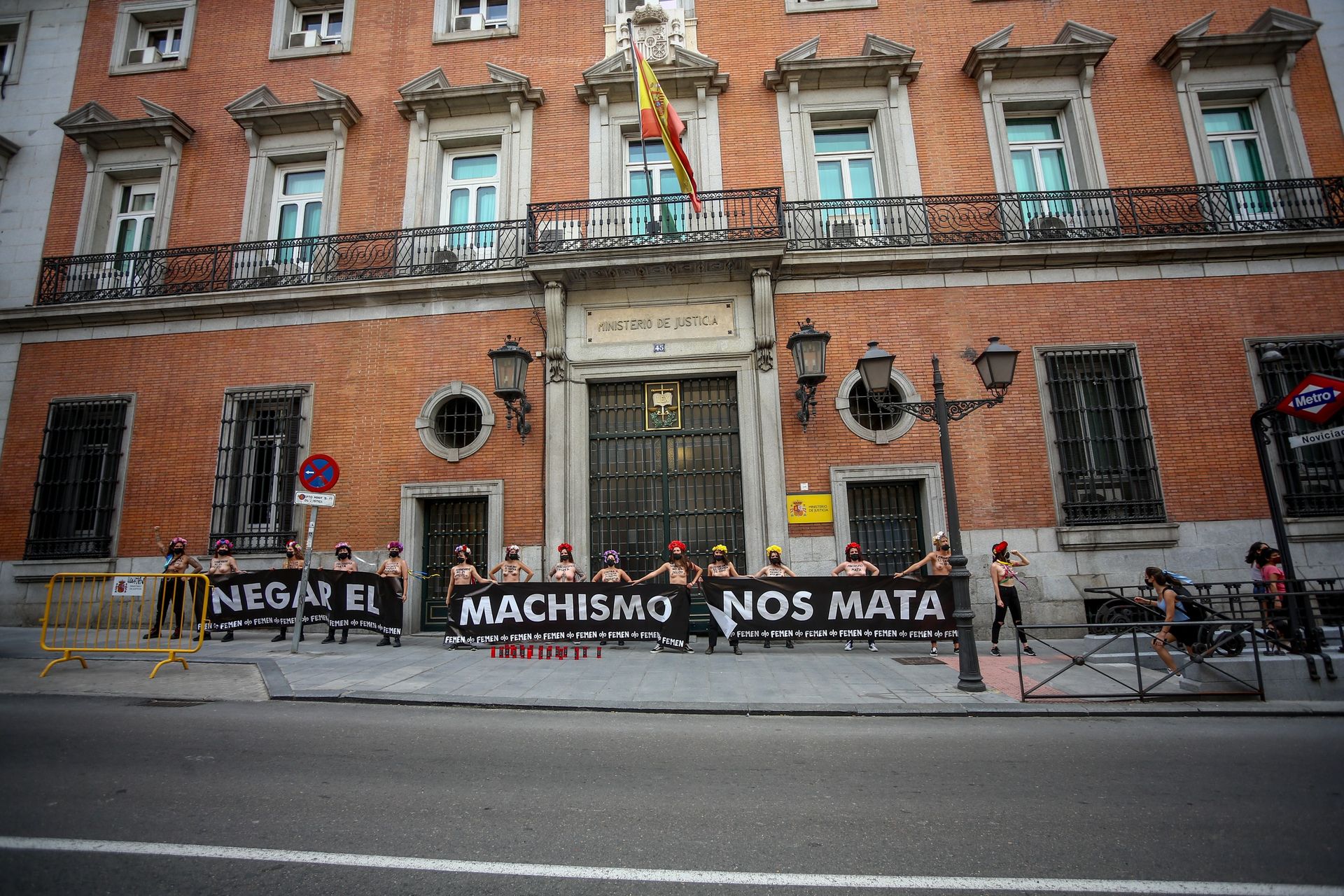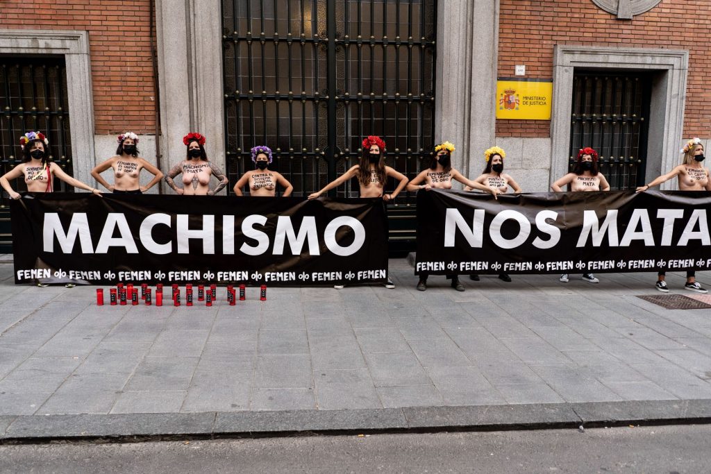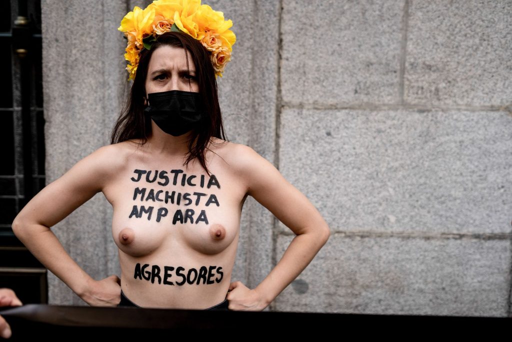 Голые активистки Femen протестуют против феминицида и требуют помилования для Хуаны Ривас перед Министерством юстиции в Мадриде, Испания, 11 июня 2021 года. Хуана Ривас — испанка, заключённая в тюрьму за то, что в 2017 году скрывалась с сыновьями, чтобы избежать насилия со стороны бывшего партнёра.