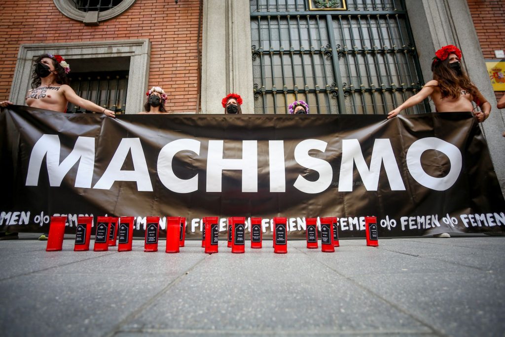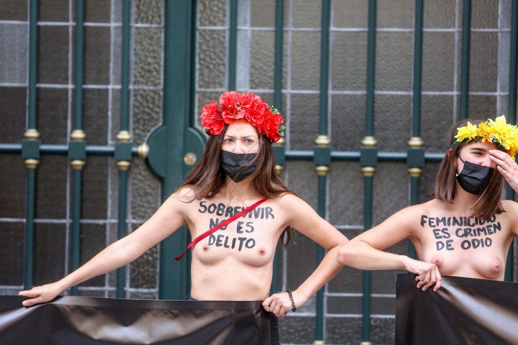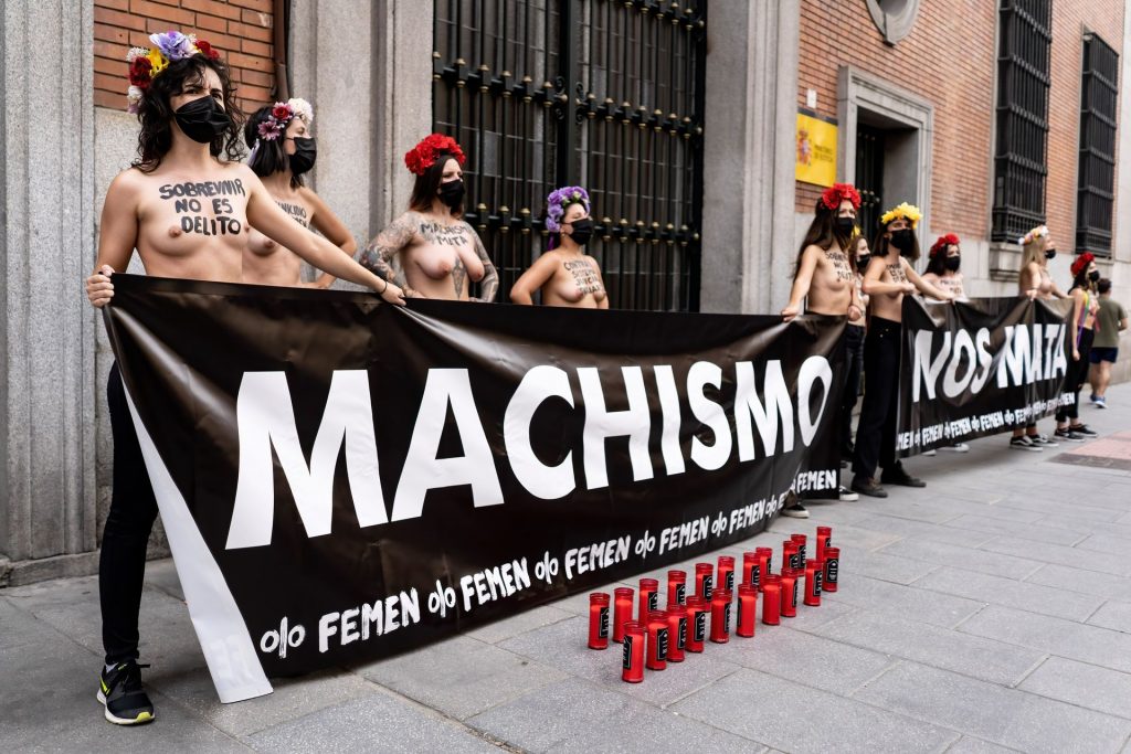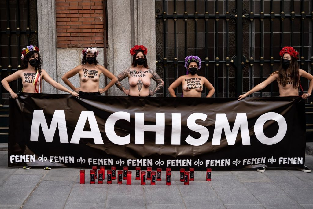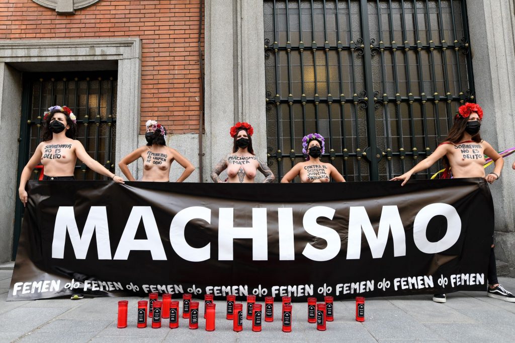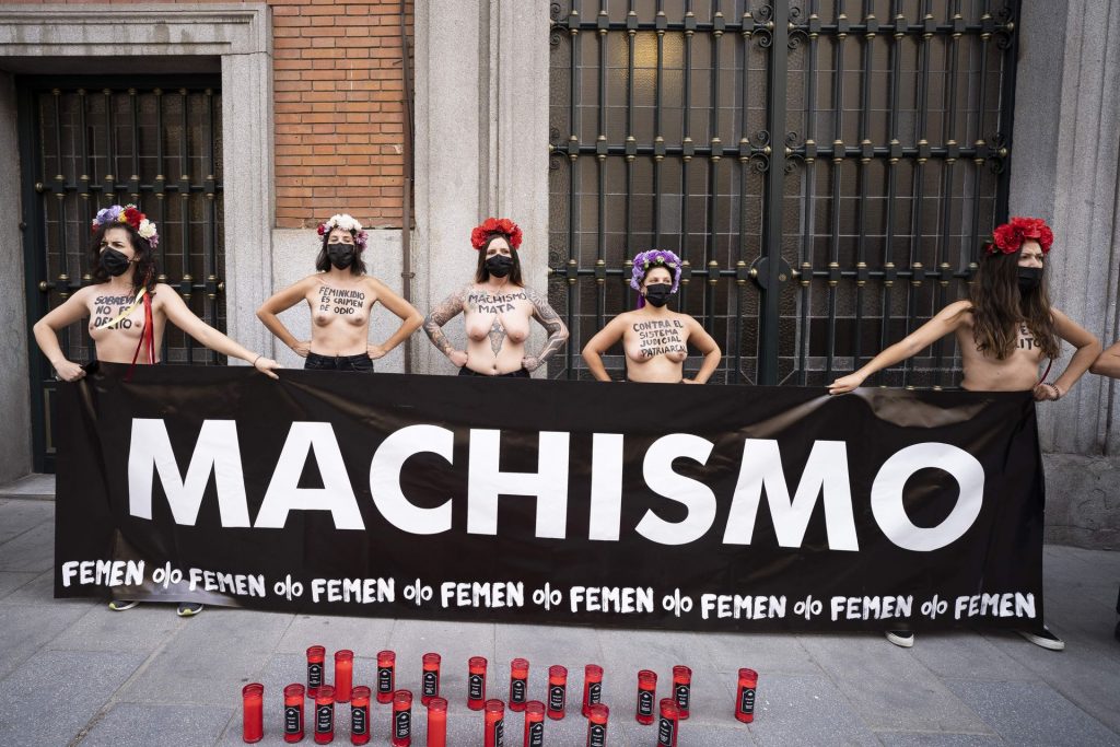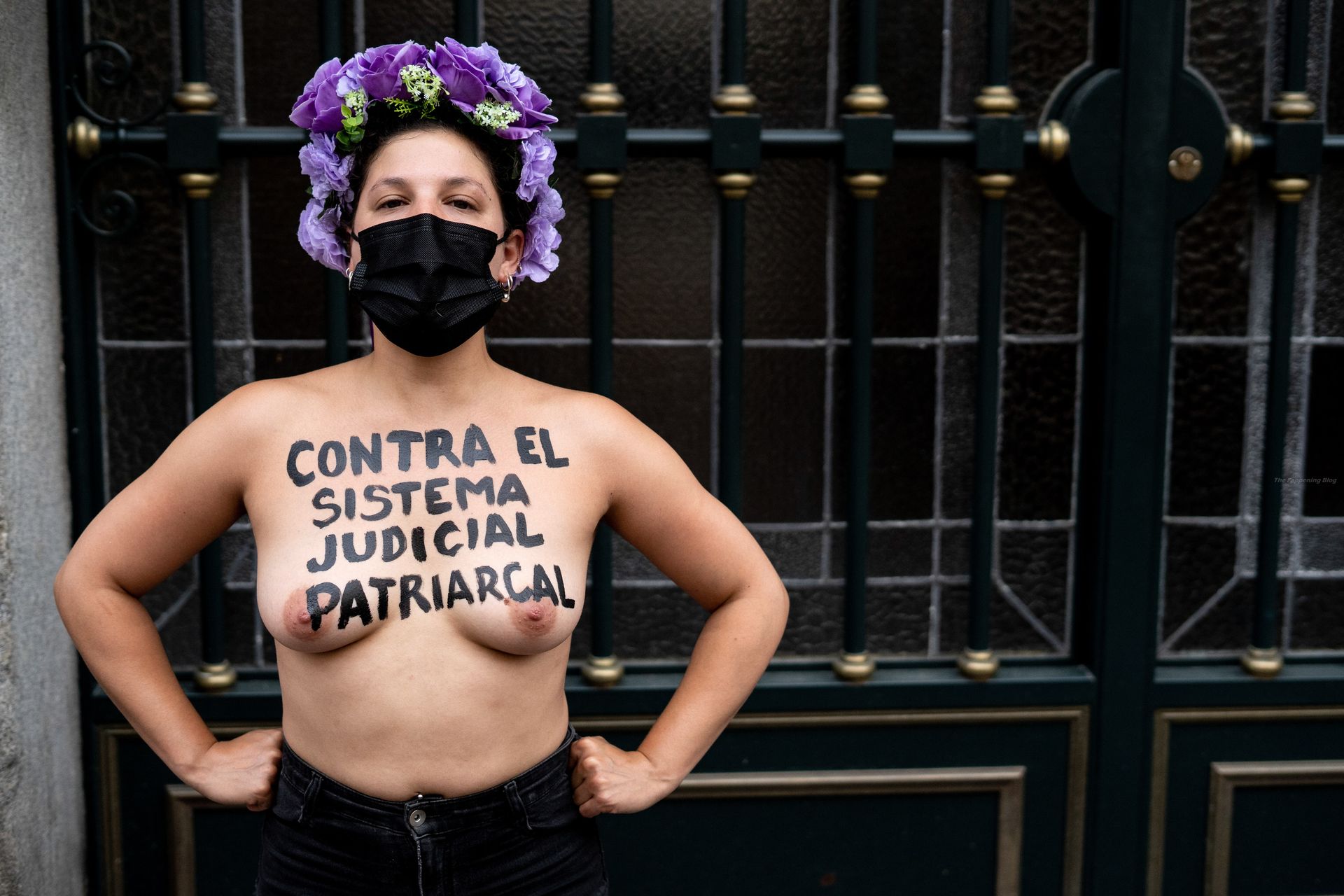 Голые активистки Femen протестуют против феминицида и требуют помилования для Хуаны Ривас перед Министерством юстиции в Мадриде, Испания, 11 июня 2021 года. Хуана Ривас — испанка, заключённая в тюрьму за то, что в 2017 году скрывалась с сыновьями, чтобы избежать насилия со стороны бывшего партнёра.