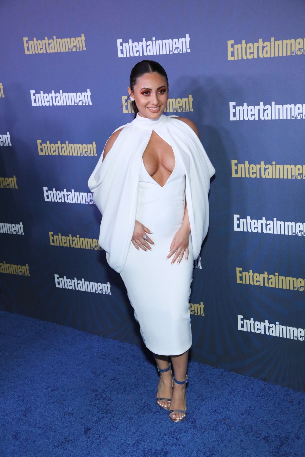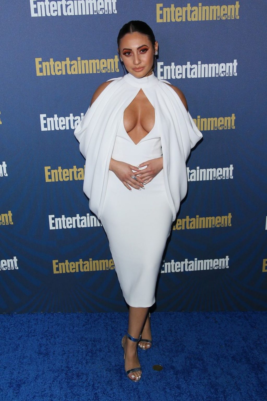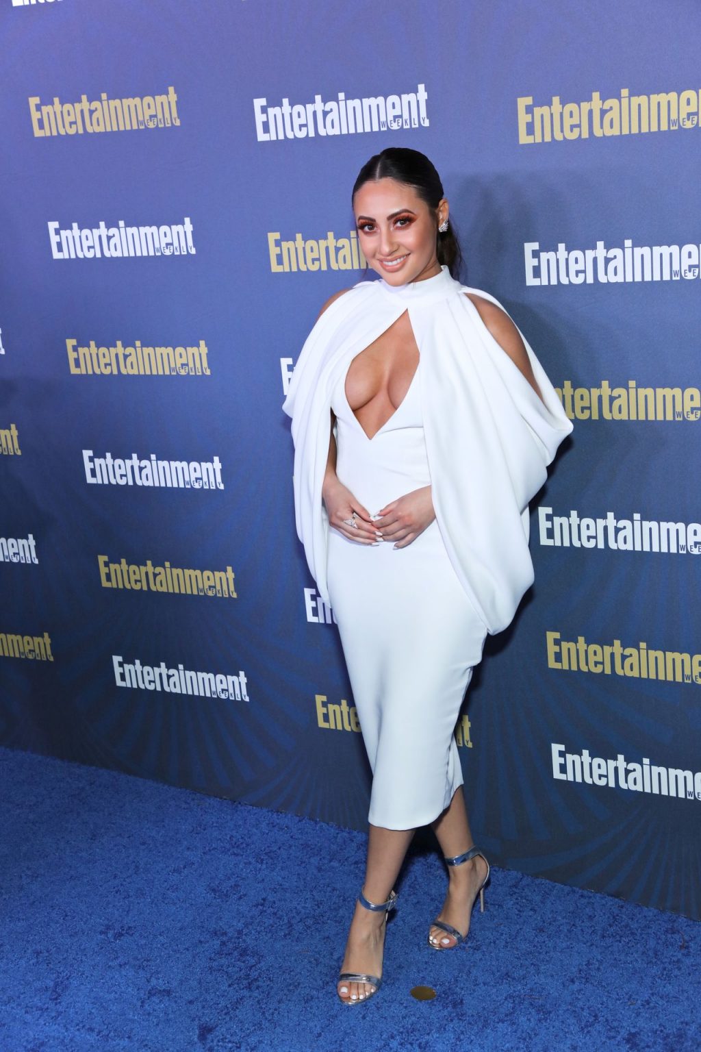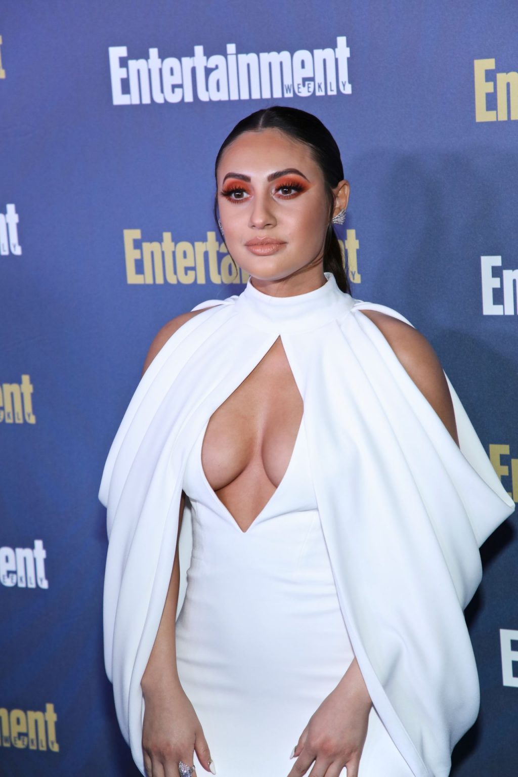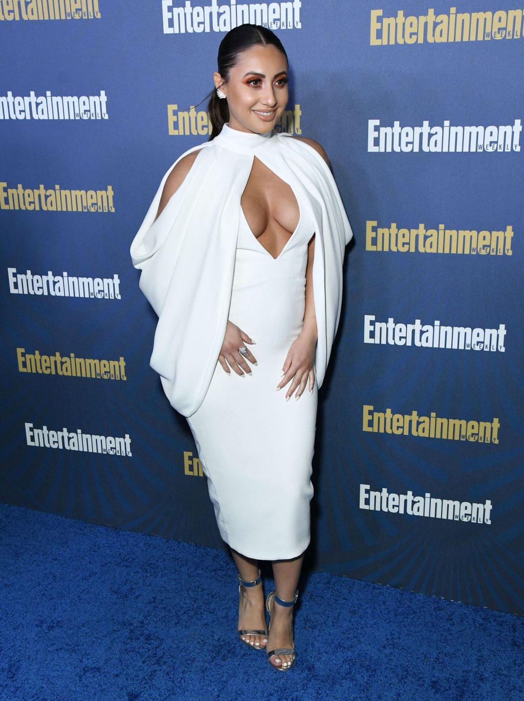 Американская актриса Франсия Райса продемонстрировала свое декольте, позируя в белом платье на вечеринке Entertainment Weekly перед SAG в Chateau Marmont в Лос-Анджелесе, 18.01.2020.