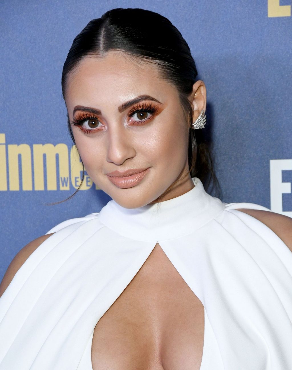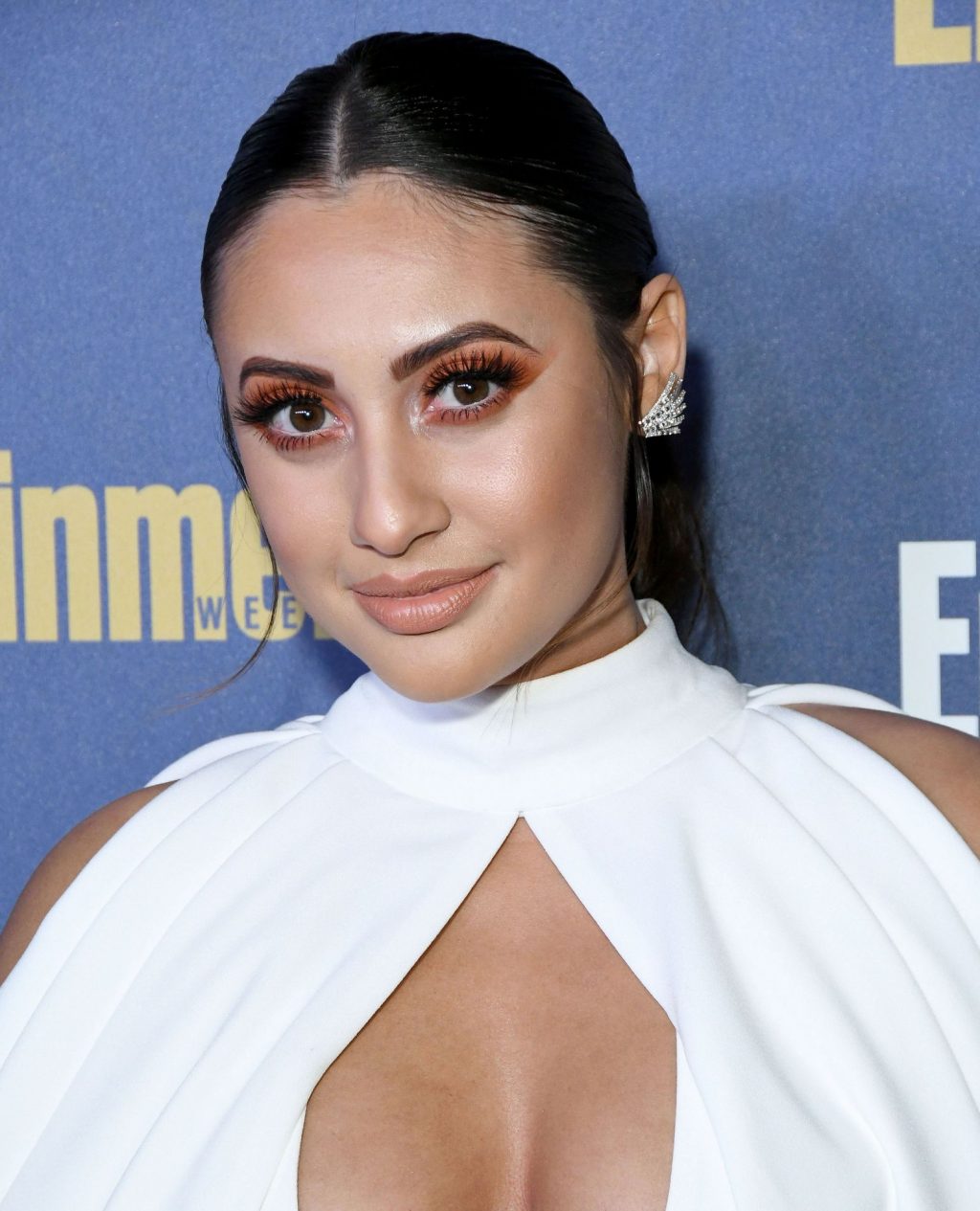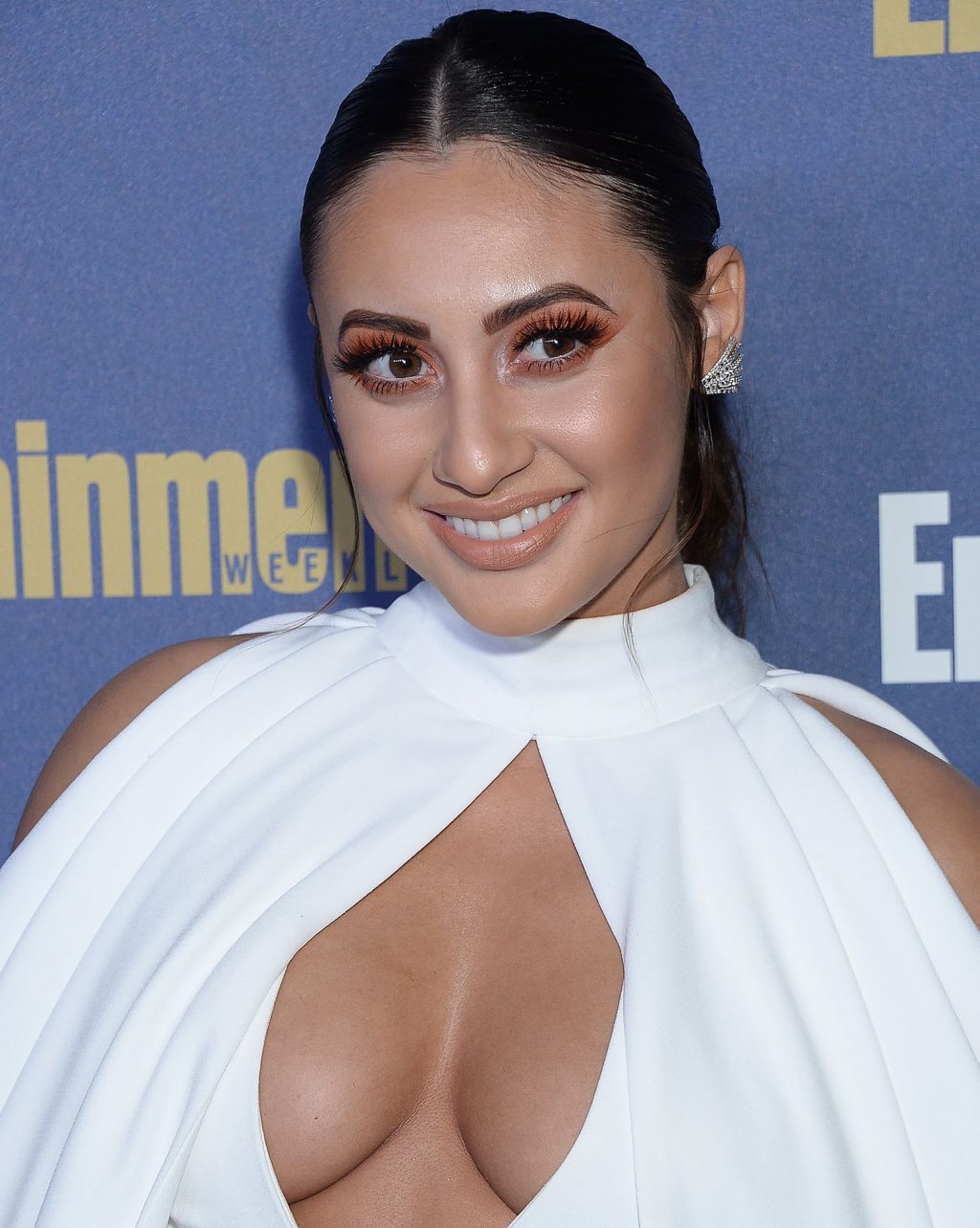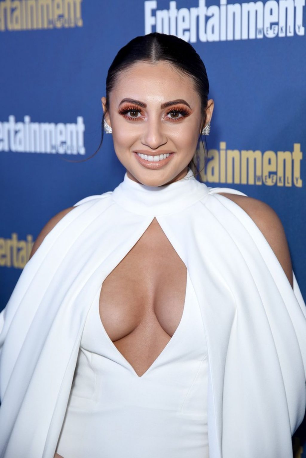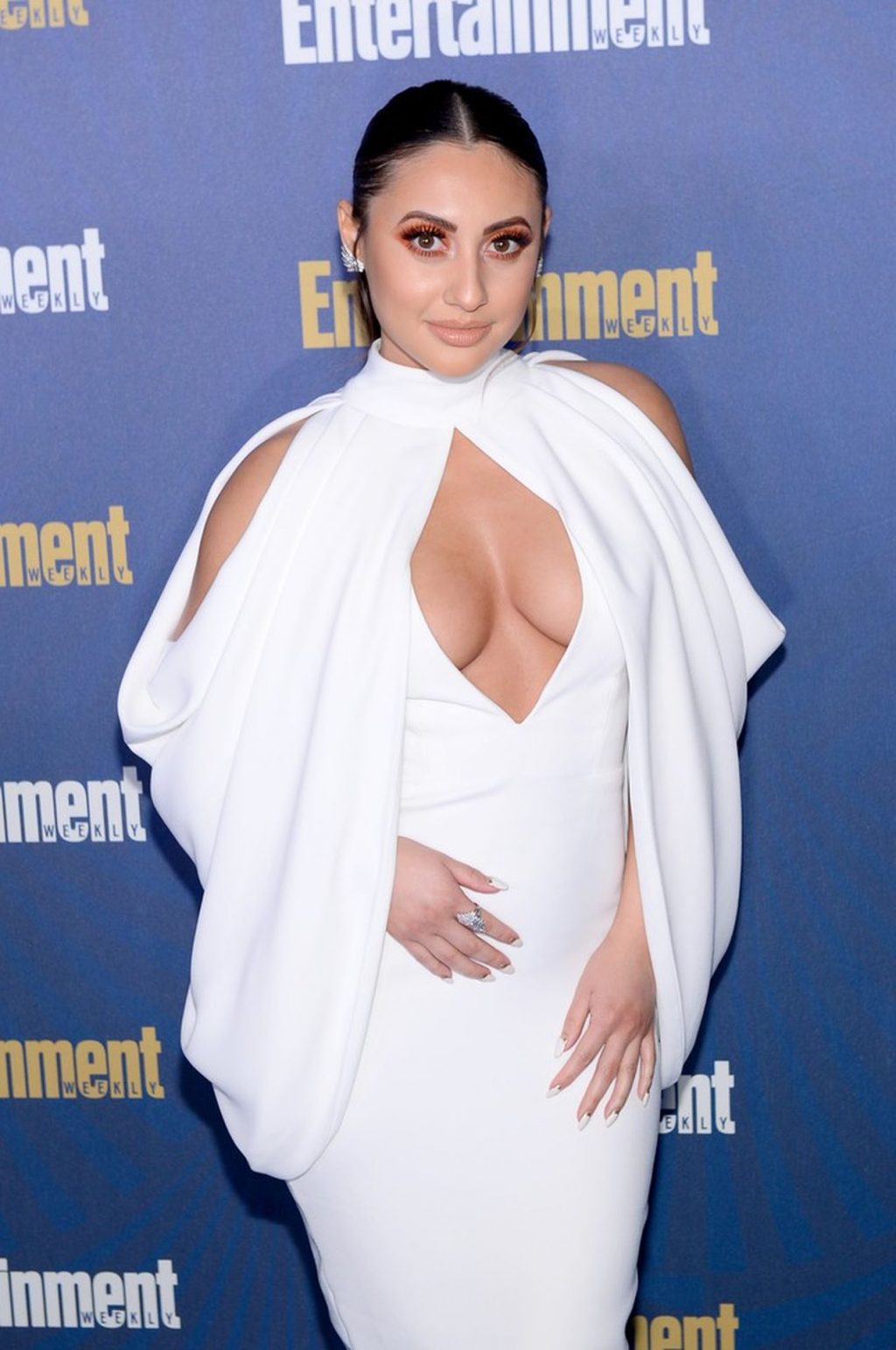 Американская актриса Франсия Райса продемонстрировала свое декольте, позируя в белом платье на вечеринке Entertainment Weekly перед SAG в Chateau Marmont в Лос-Анджелесе, 18.01.2020.