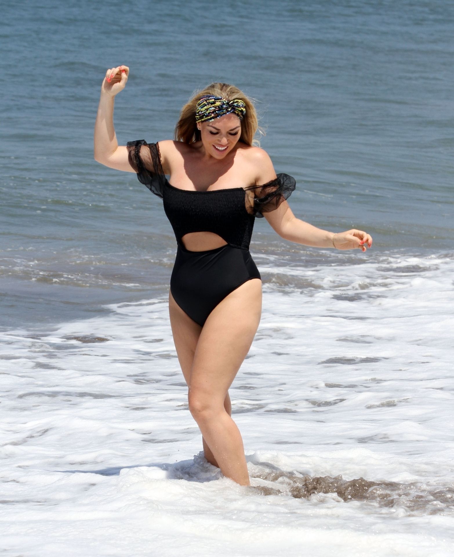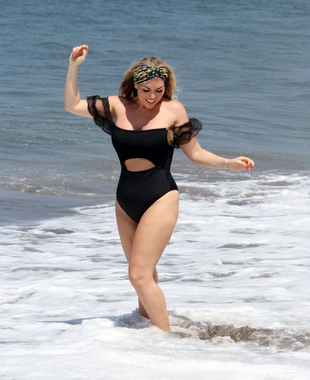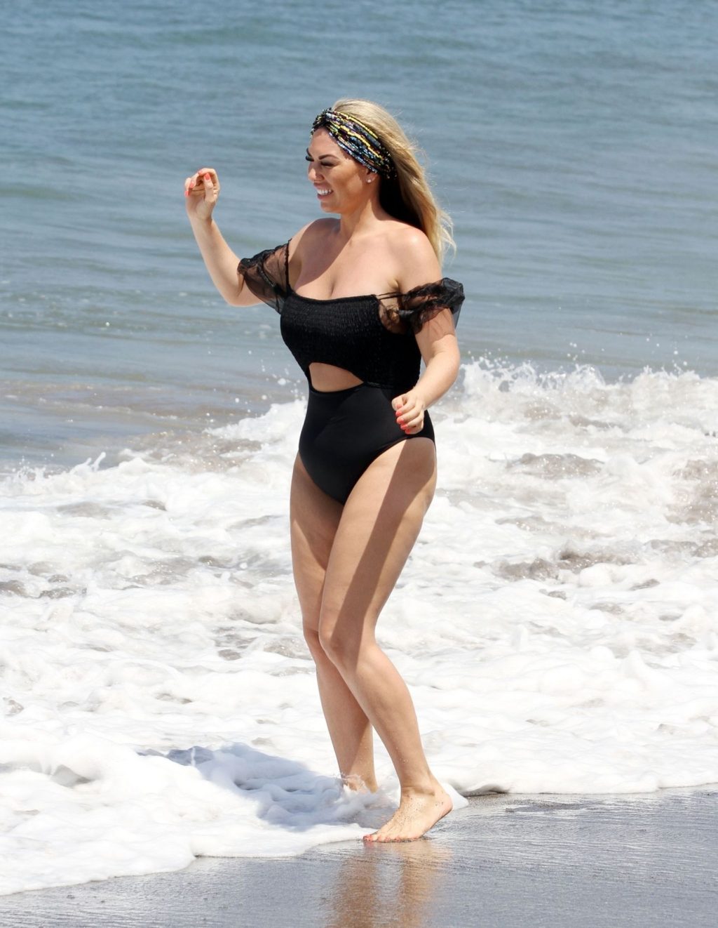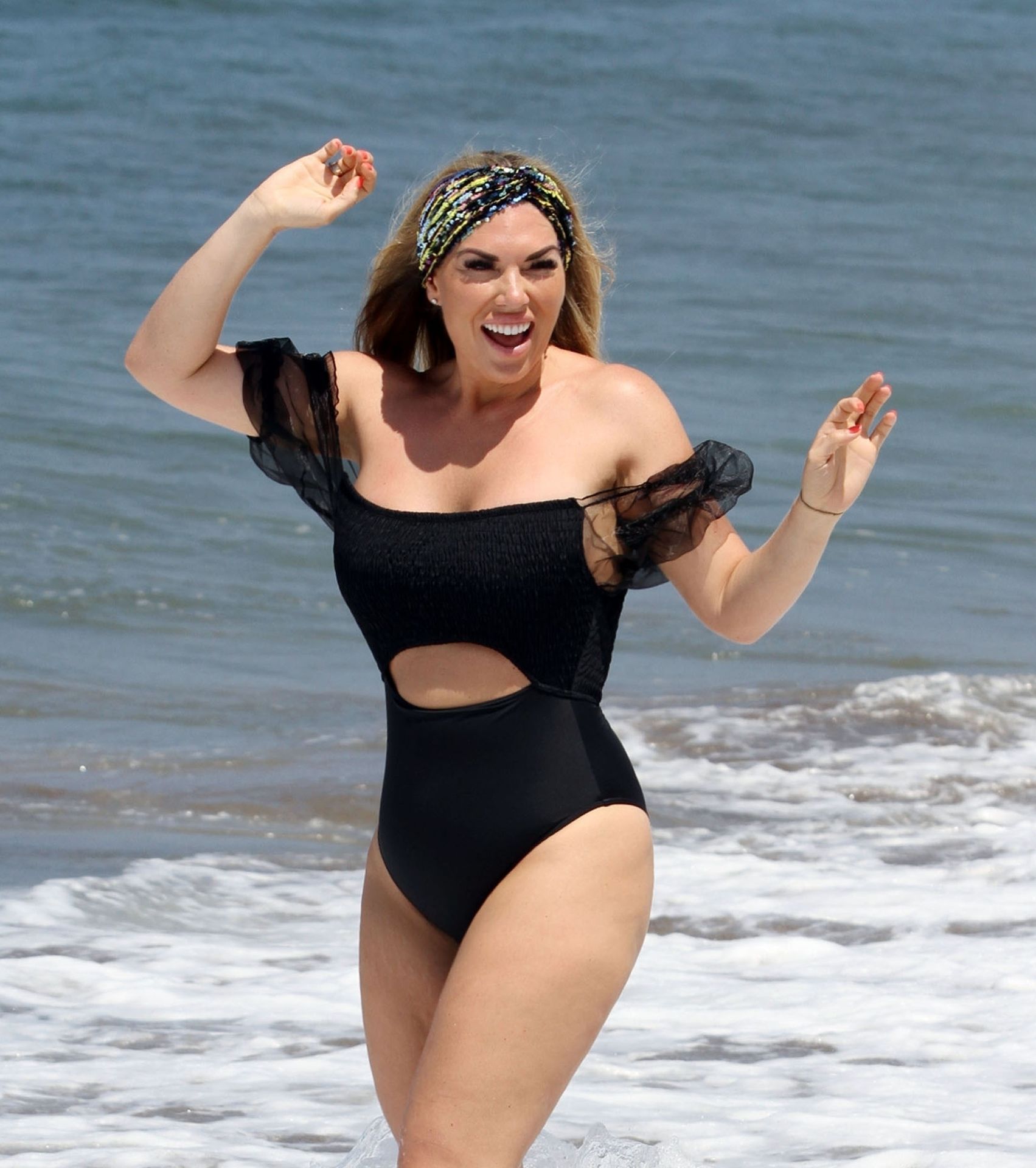 Звезда реалити-шоу Фрэнки Эссекс демонстрирует свою недавнюю потерю веса на отдыхе на Тенерифе, 01/03/2020. Фрэнки запечатлена в черном купальнике, когда она прыгает в море и выходит из него на испанском острове.