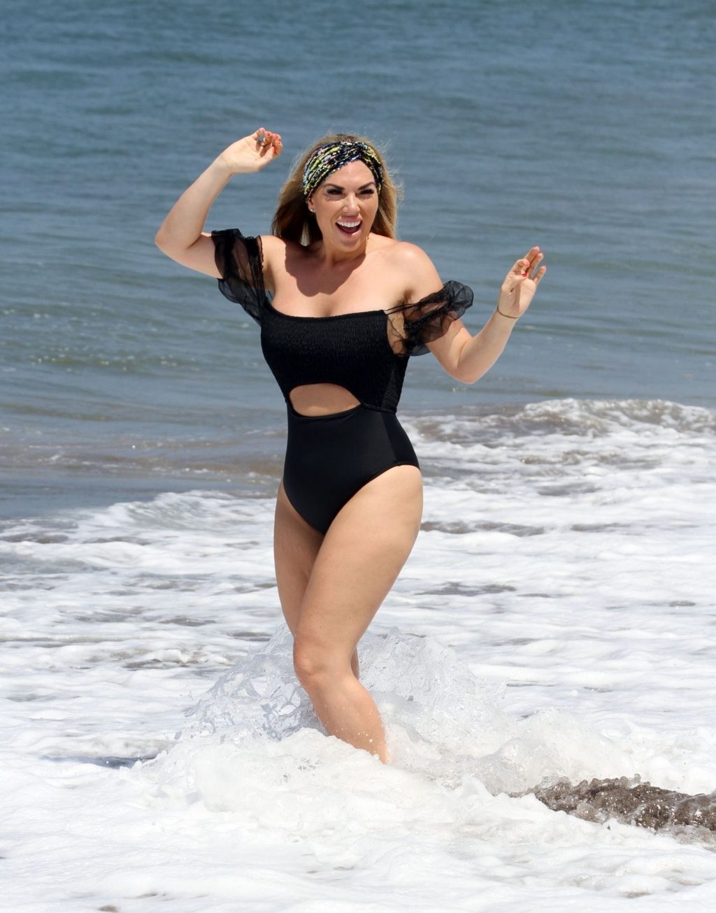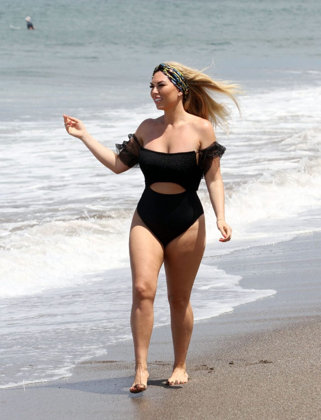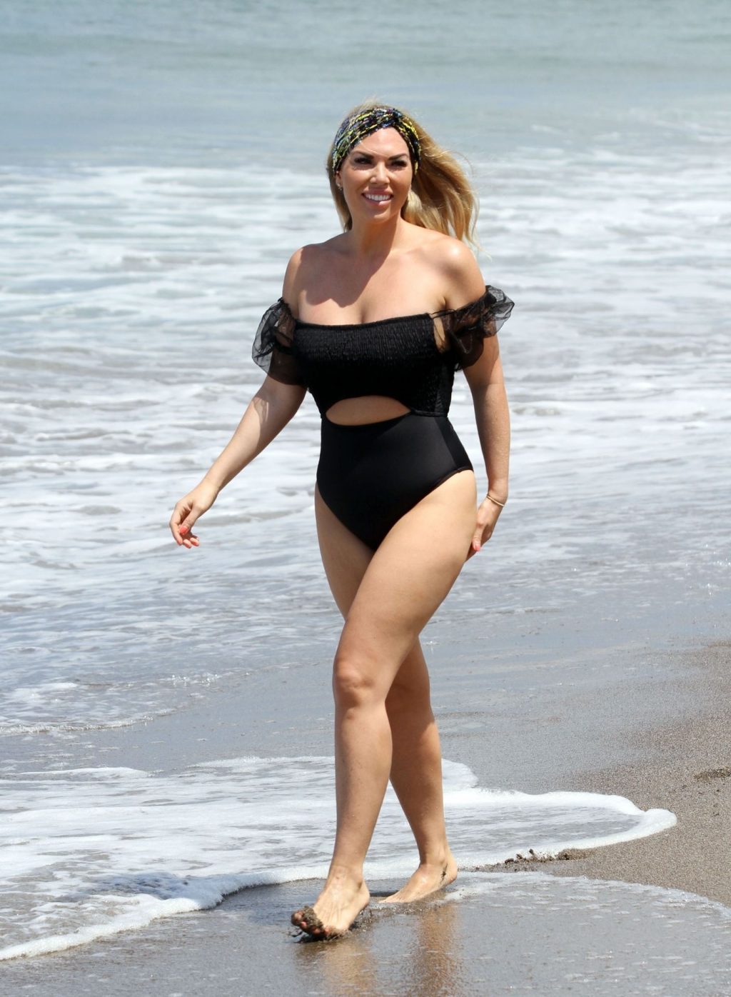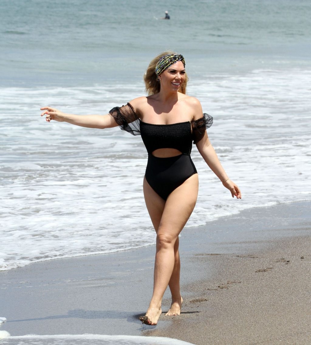 Звезда реалити-шоу Фрэнки Эссекс демонстрирует свою недавнюю потерю веса на отдыхе на Тенерифе, 01/03/2020. Фрэнки запечатлена в черном купальнике, когда она прыгает в море и выходит из него на испанском острове.