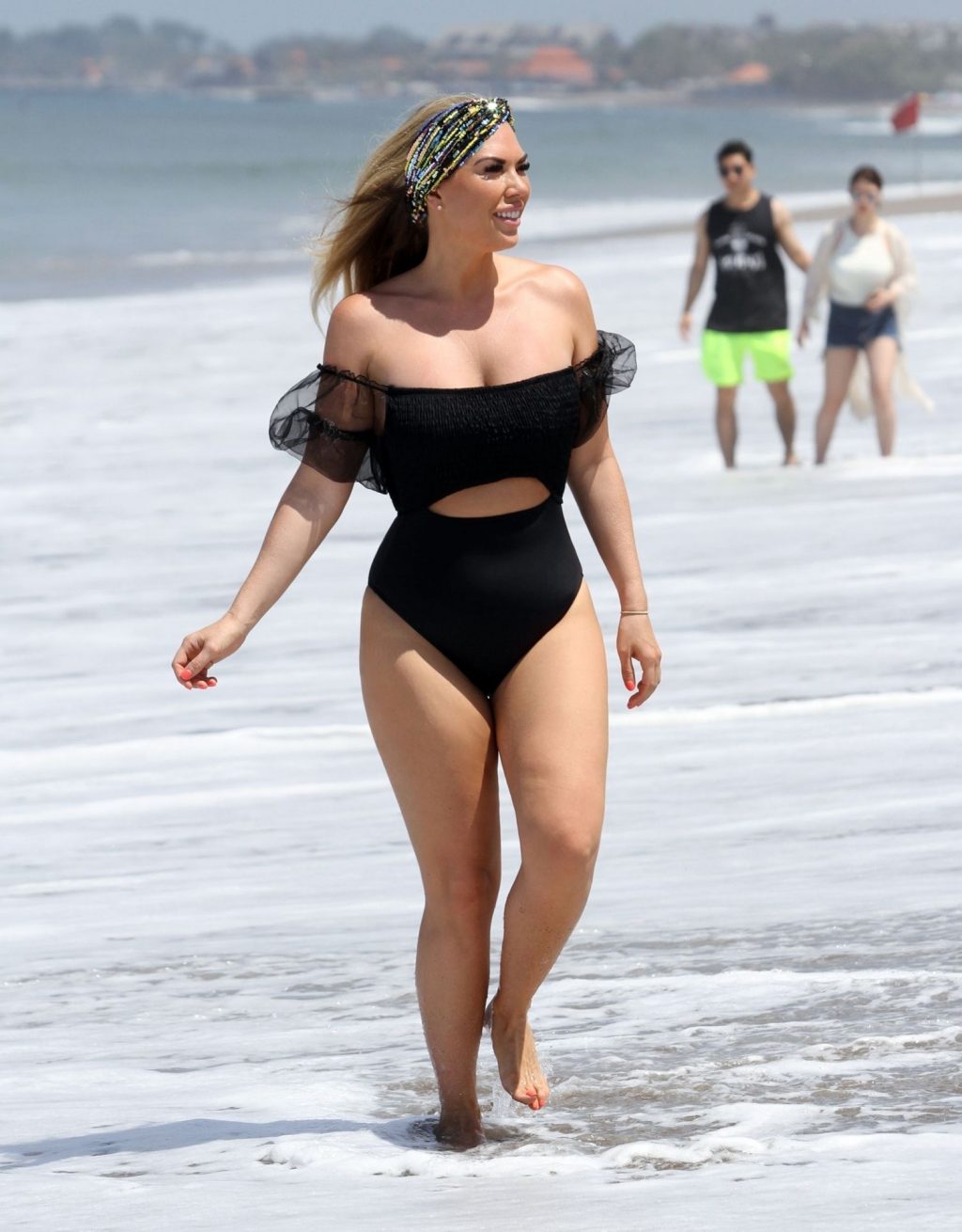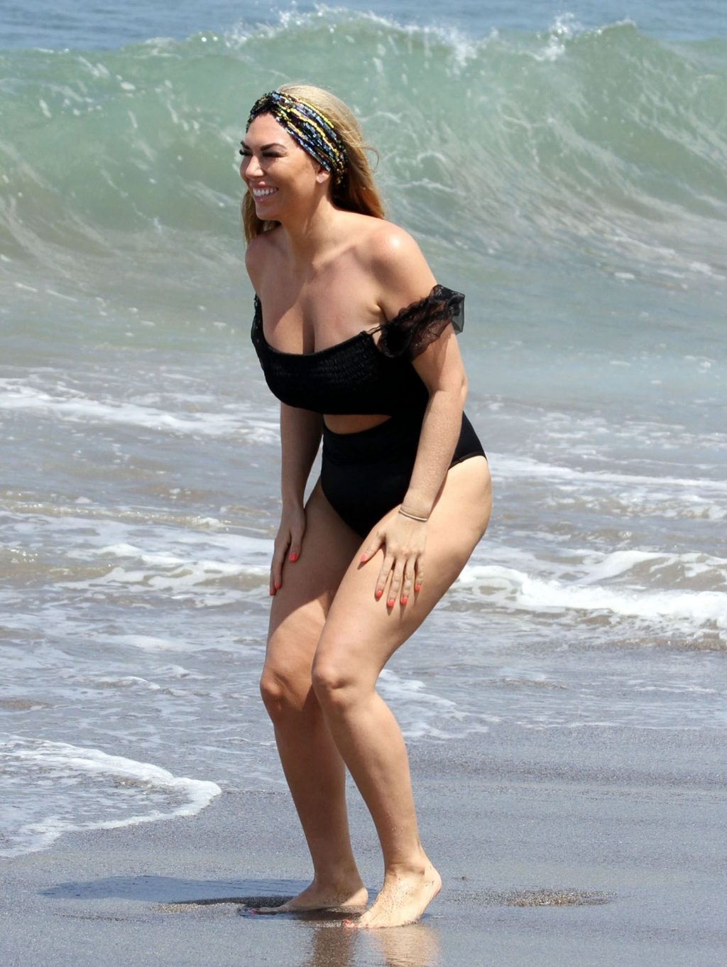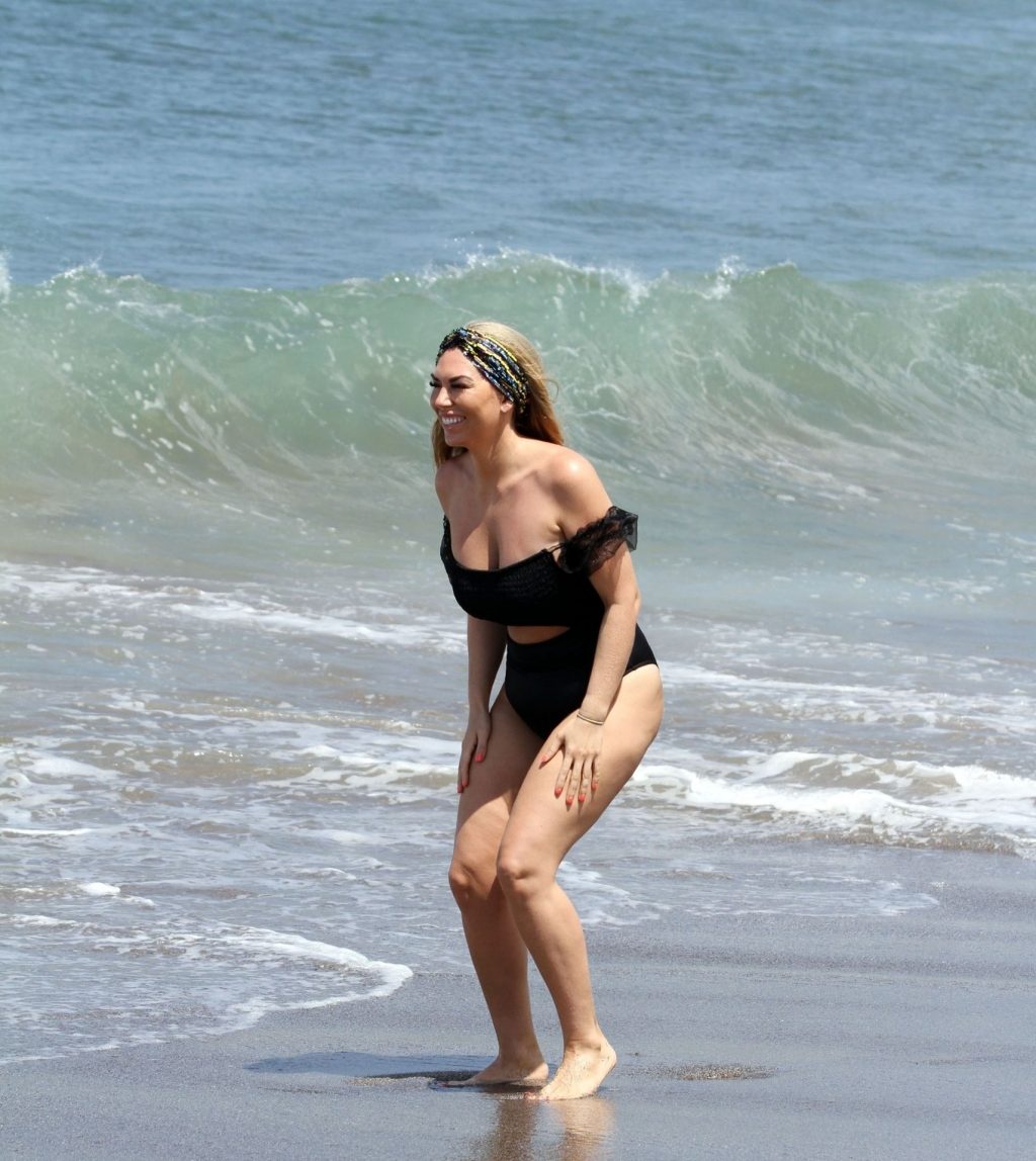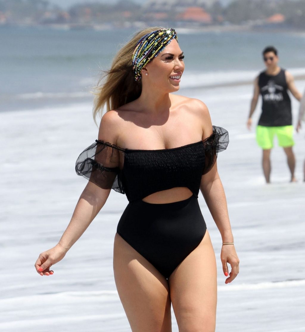Звезда реалити-шоу Фрэнки Эссекс демонстрирует свою недавнюю потерю веса на отдыхе на Тенерифе, 01/03/2020. Фрэнки запечатлена в черном купальнике, когда она прыгает в море и выходит из него на испанском острове.