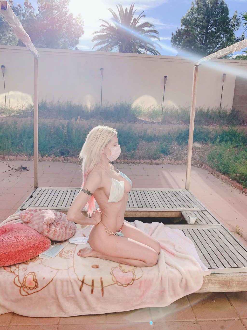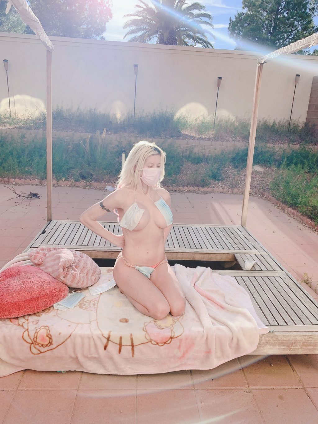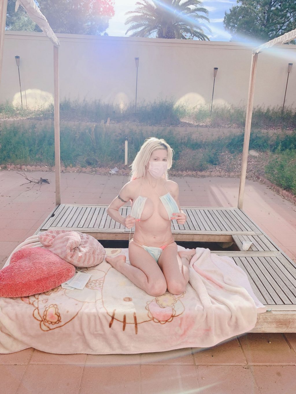 Звезда реалити-шоу Френчи Морган, сойдя с ума от изоляции, решила проявить креативность во время карантина из-за коронавируса, сделав бикини из медицинских масок, оставаясь взаперти в своем доме в Лас-Вегасе, 12.04.2020.