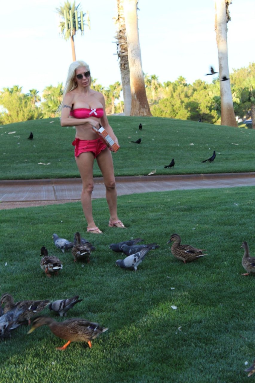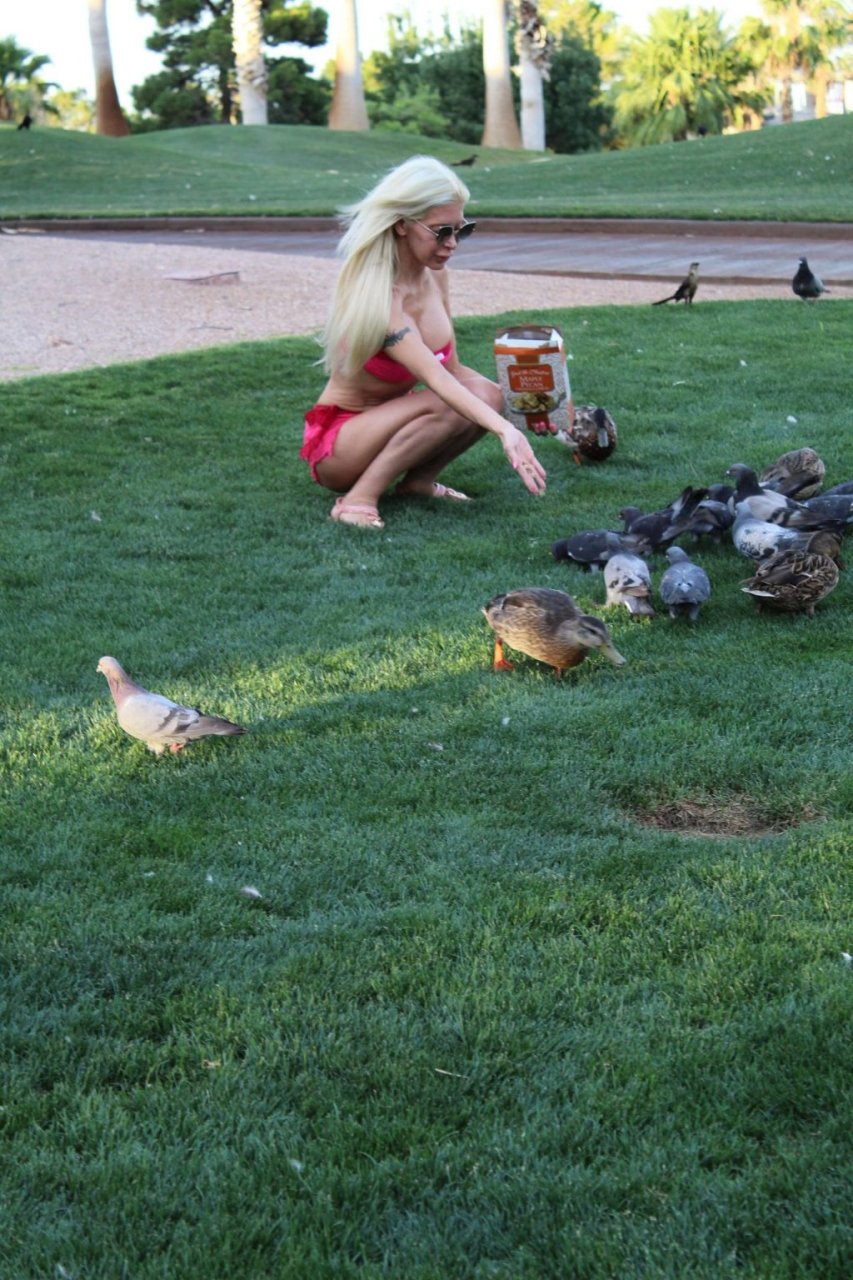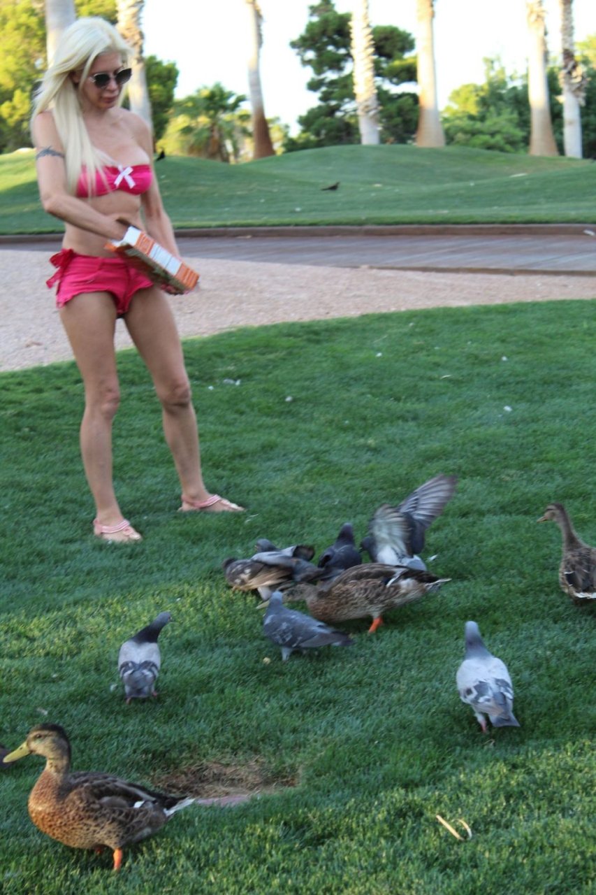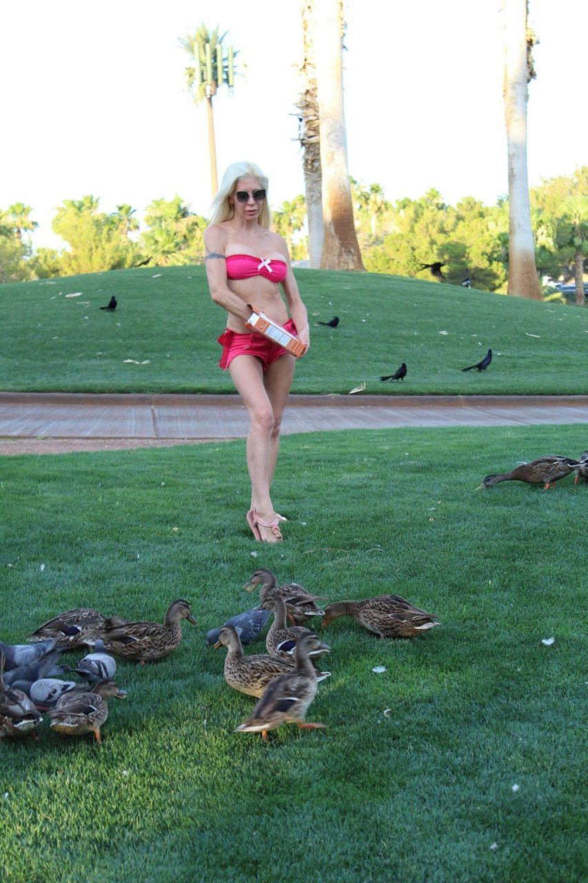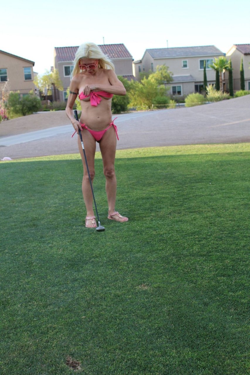 Reality Starlet Angelique “Frenchy” Morgan запечатлена за игрой в гольф на поле в Лас-Вегасе в очень откровенном розовом бикини, и у неё случайно произошёл соскок соска в Лас-Вегасе, 07/12/2019. В конце концов, Френчи замечает соскок, исправляет неполадку с одеждой и продолжает игру в гольф.