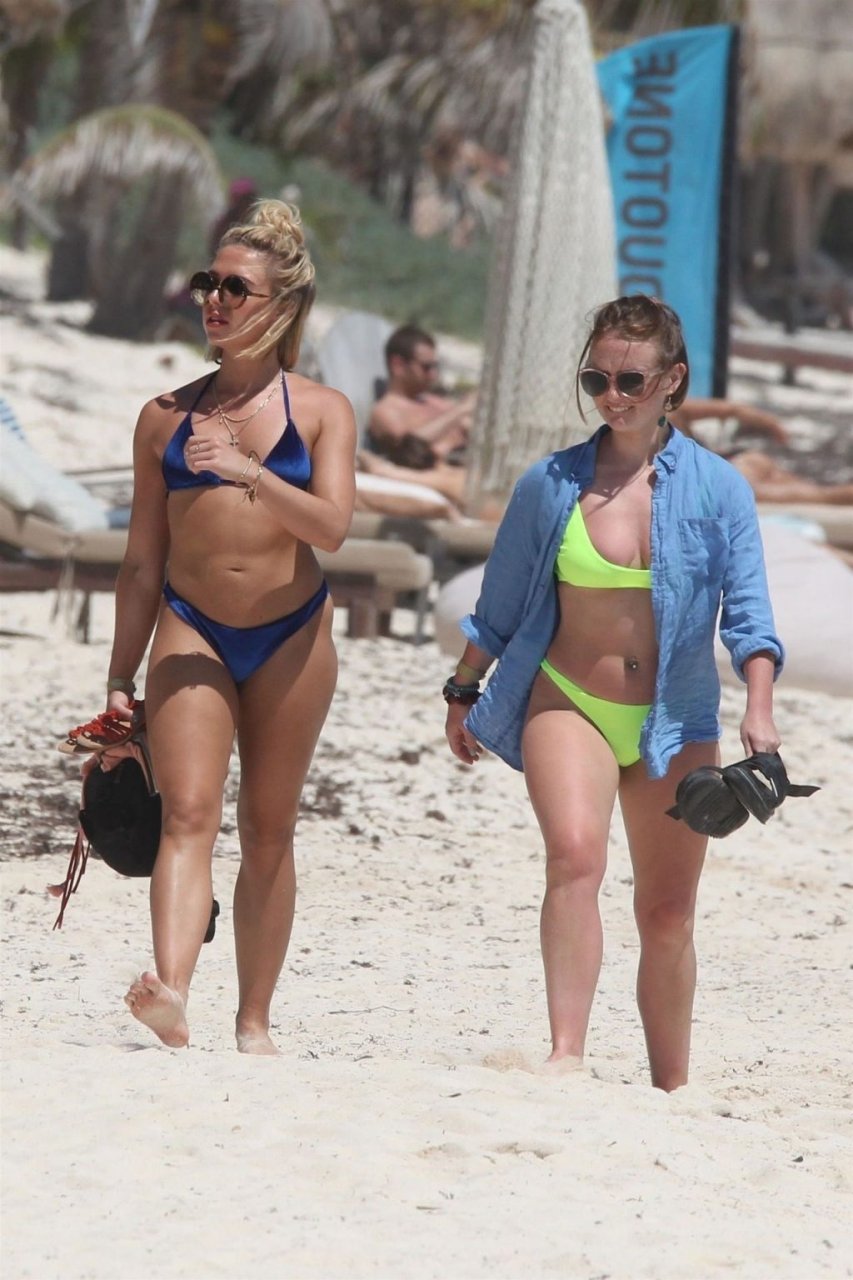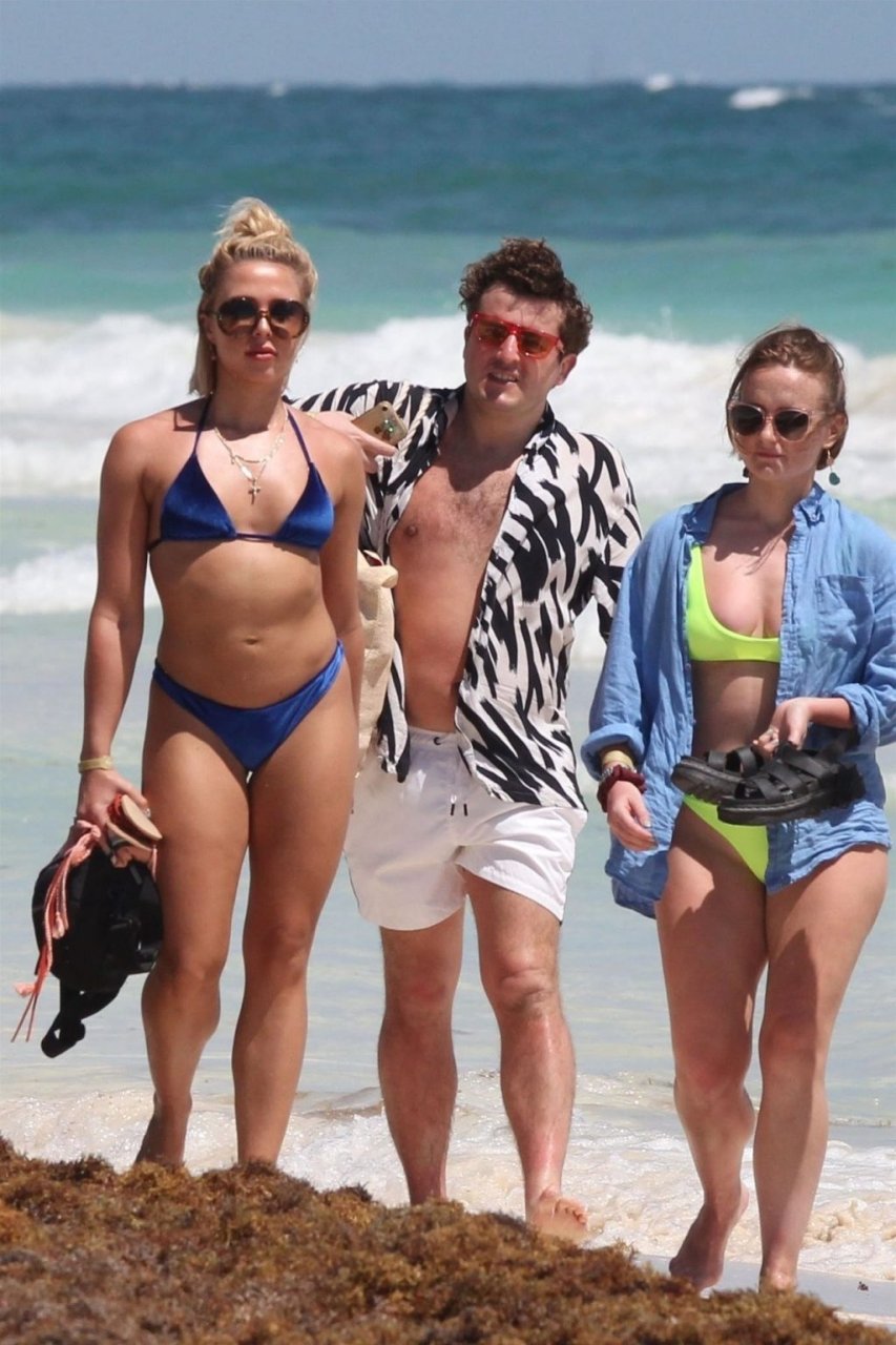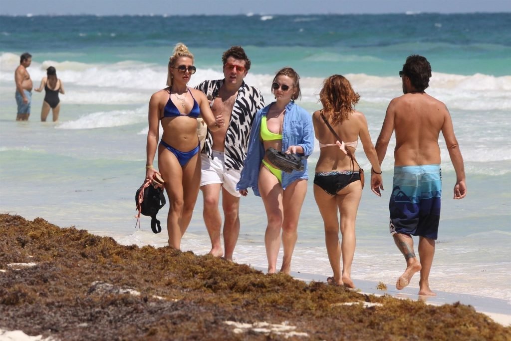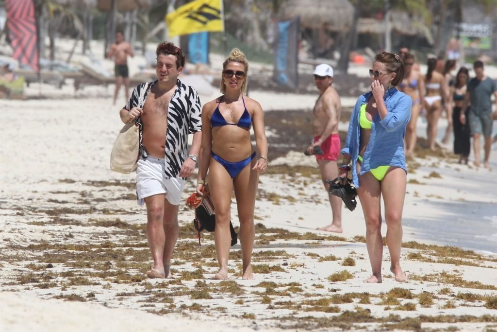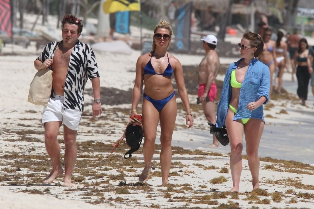 Любимица шоу Love Island Габби Аллен и несколько друзей наслаждаются днем на пляже во время отпуска в Тулуме, Мексика, 03/08/2019. Габби продемонстрировала свою подтянутую фигуру в оранжевом бикини, а затем переоделась в синее бикини.