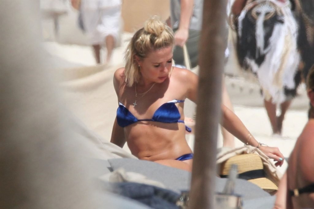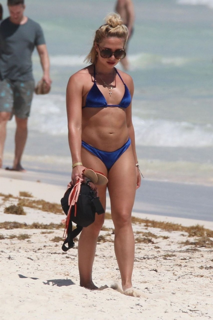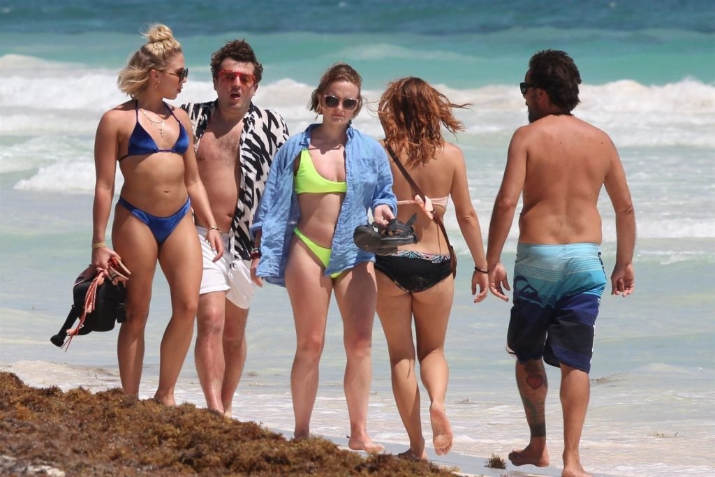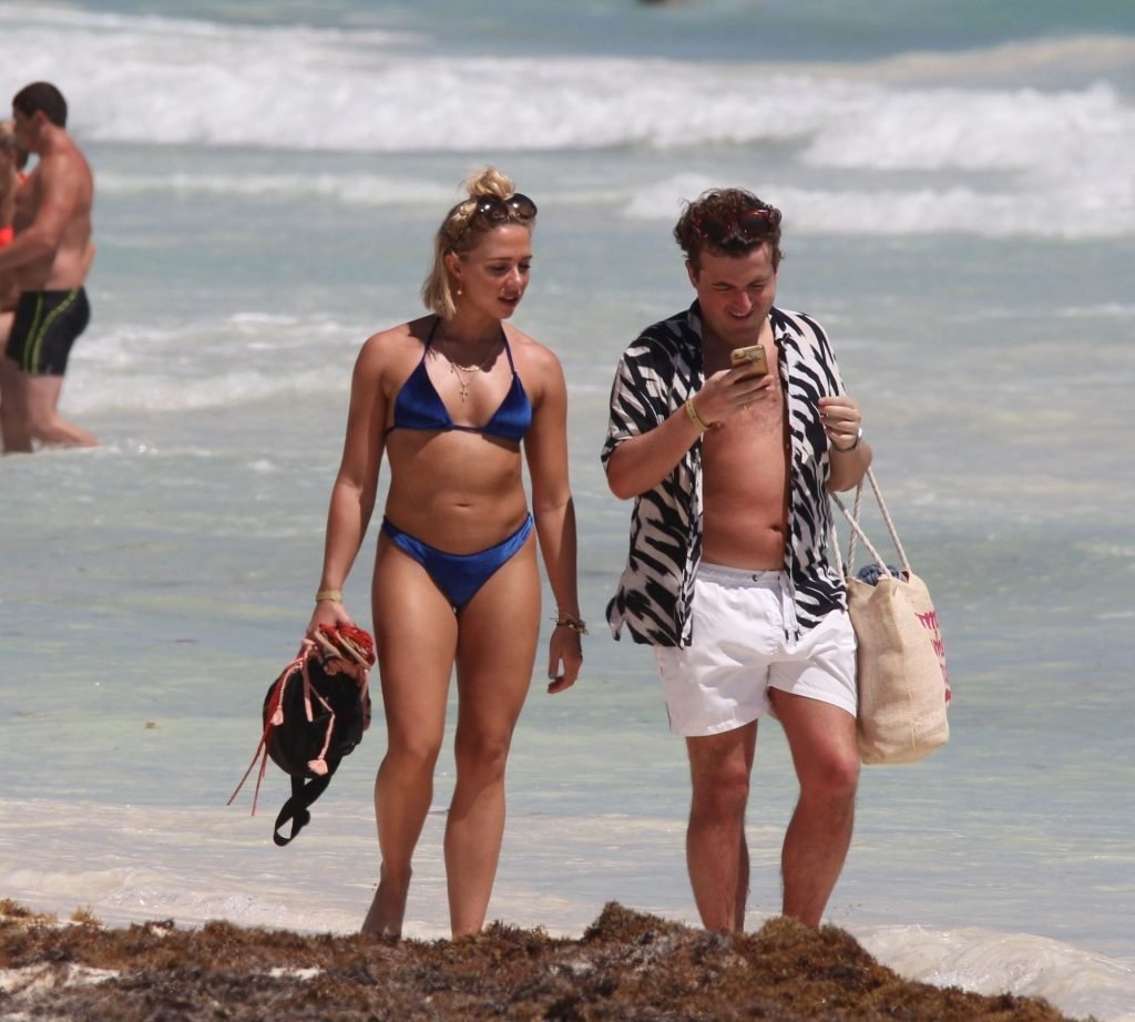 Любимица шоу Love Island Габби Аллен и несколько друзей наслаждаются днем на пляже во время отпуска в Тулуме, Мексика, 03/08/2019. Габби продемонстрировала свою подтянутую фигуру в оранжевом бикини, а затем переоделась в синее бикини.