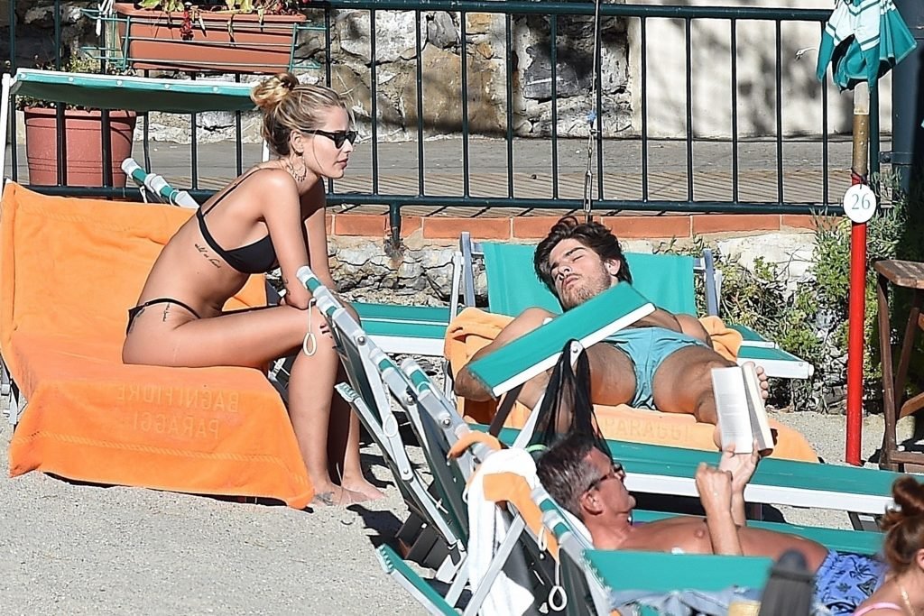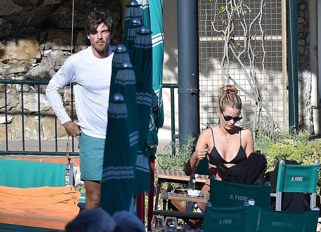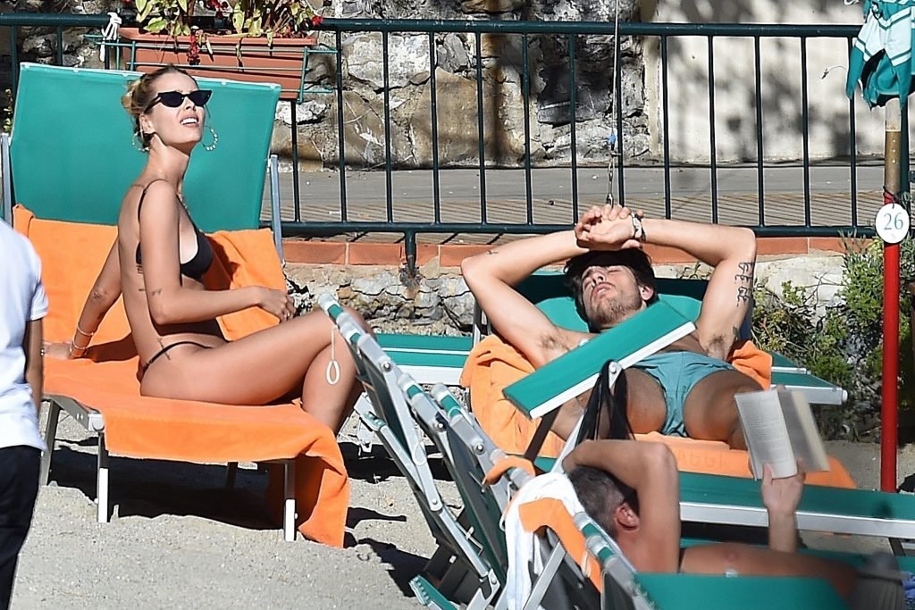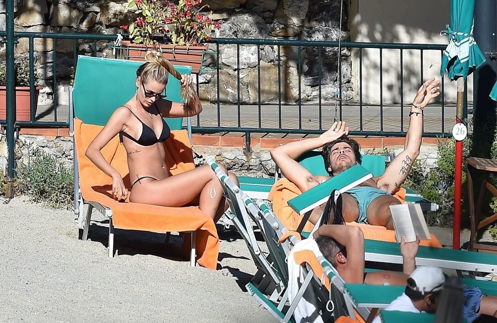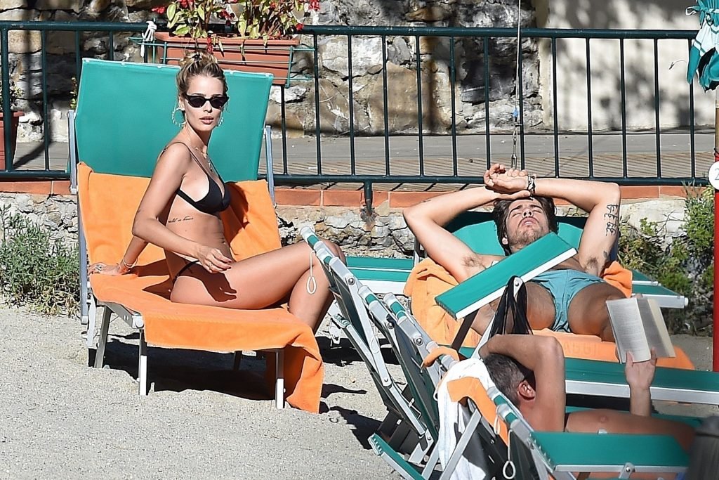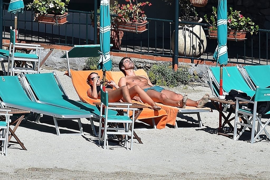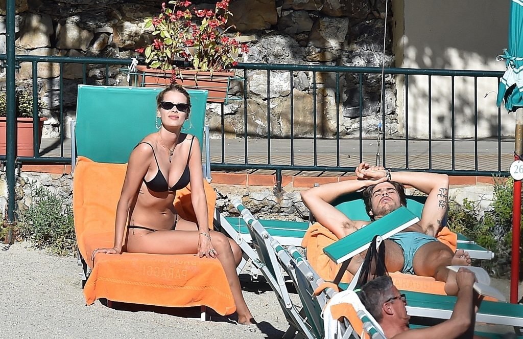 Бразильская модель/актриса Ясмин Брунет и её партнёр, модель Эвандро Солдати, проводят расслабляющий день у моря в Портофино, 27.09.2018. Ясмин (30) продемонстрировала своё подтянутое тело в чёрном бикини во время загара, но столкнулась с небольшой проблемой с одеждой (случайный просвет груди), когда села на шезлонг.
