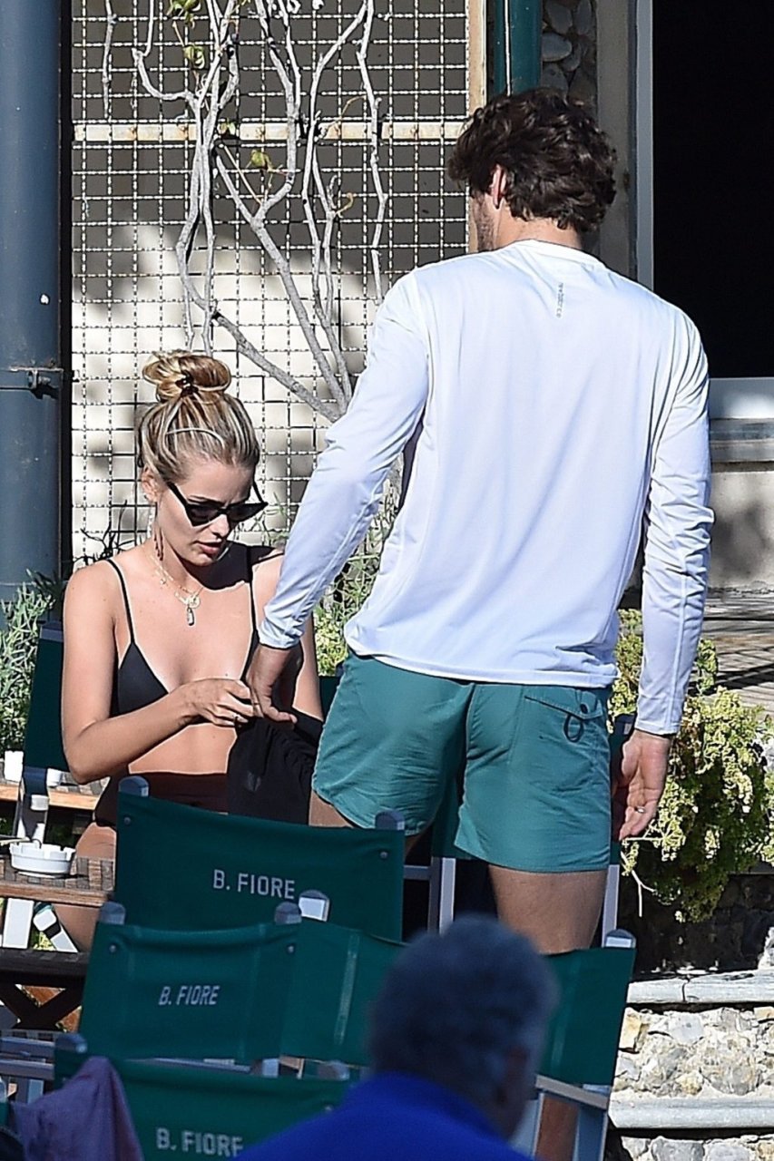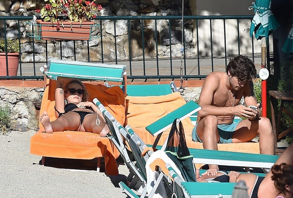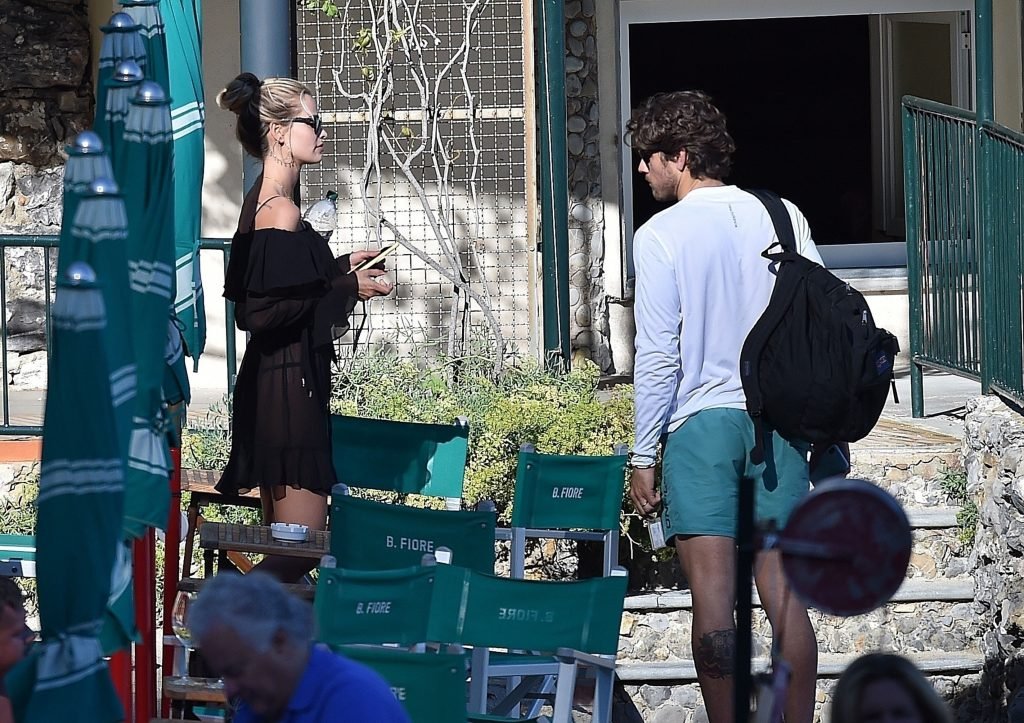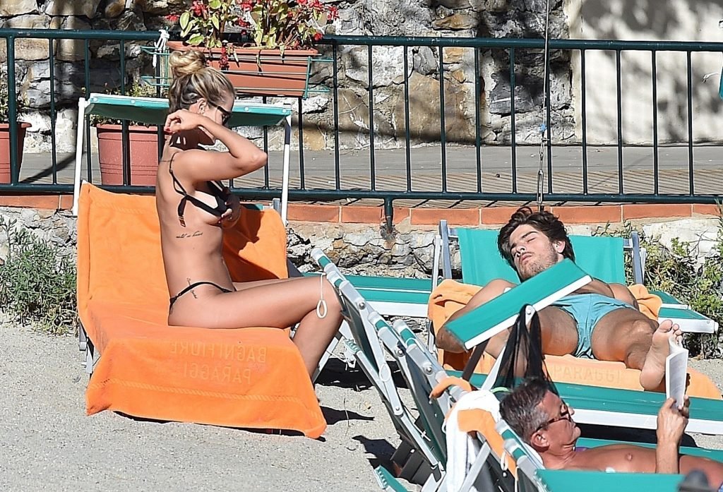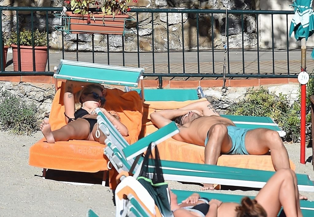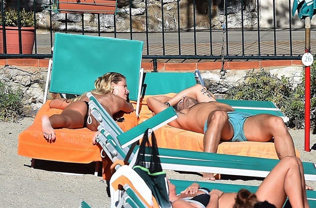 Бразильская модель/актриса Ясмин Брунет и её партнёр, модель Эвандро Солдати, проводят расслабляющий день у моря в Портофино, 27.09.2018. Ясмин (30) продемонстрировала своё подтянутое тело в чёрном бикини во время загара, но столкнулась с небольшой проблемой с одеждой (случайный просвет груди), когда села на шезлонг.