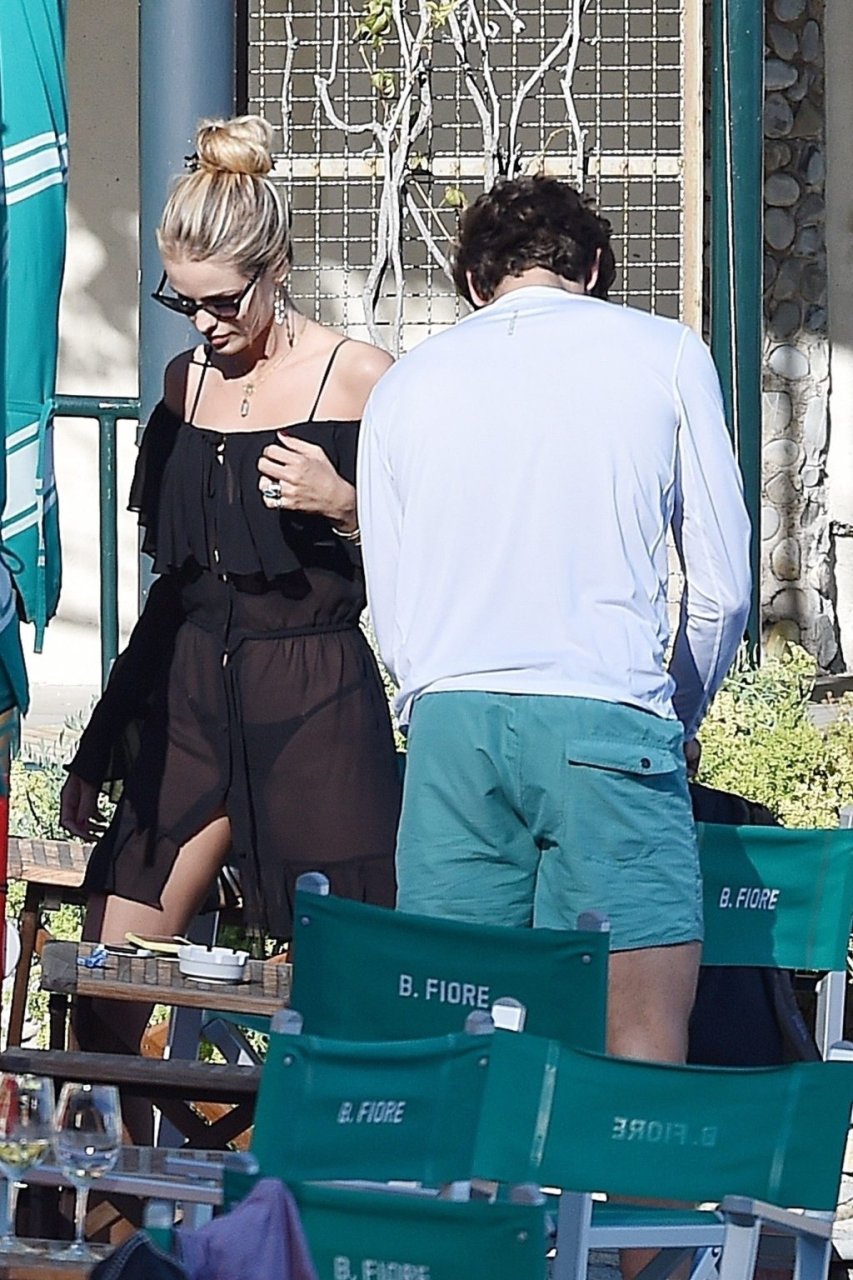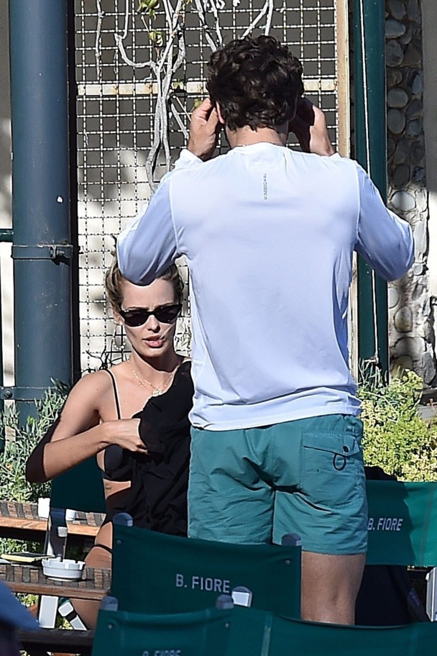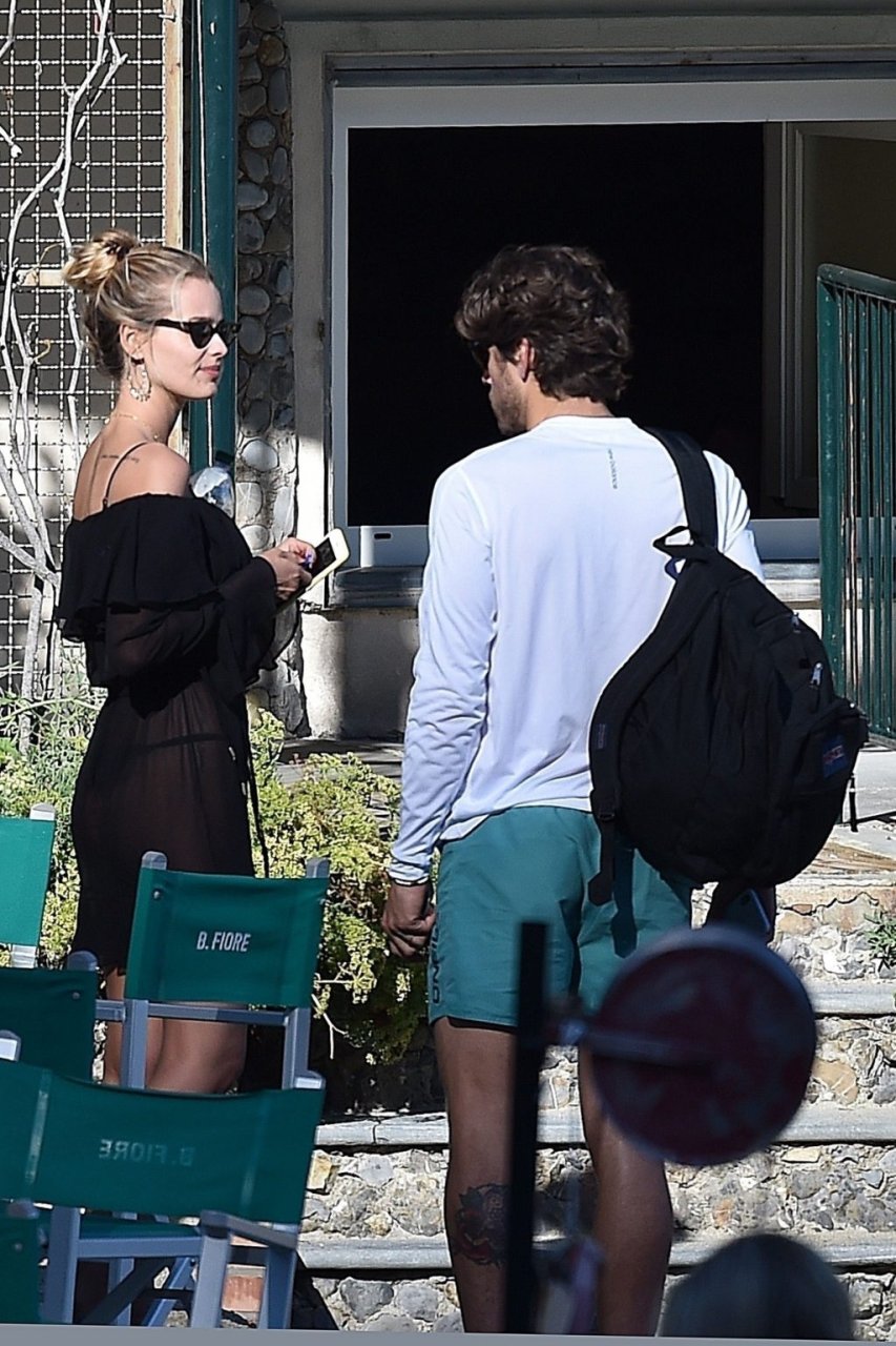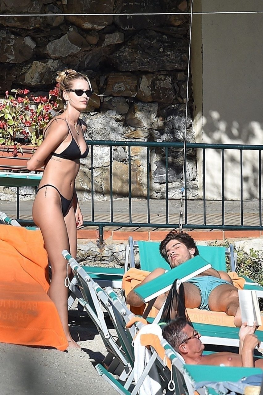 Бразильская модель/актриса Ясмин Брунет и её партнёр, модель Эвандро Солдати, проводят расслабляющий день у моря в Портофино, 27.09.2018. Ясмин (30) продемонстрировала своё подтянутое тело в чёрном бикини во время загара, но столкнулась с небольшой проблемой с одеждой (случайный просвет груди), когда села на шезлонг.