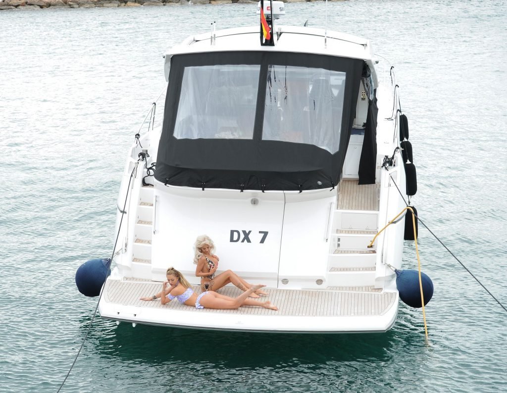 Английские гламурные модели и бывшие звёзды реалити-шоу «Love Island» Джорджия Харрисон и Ханна Элизабет замечены в сексуальных бикини во время фотосессии на лодке в Испании, 23.08.2017.