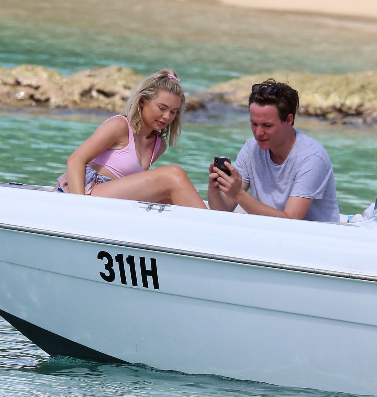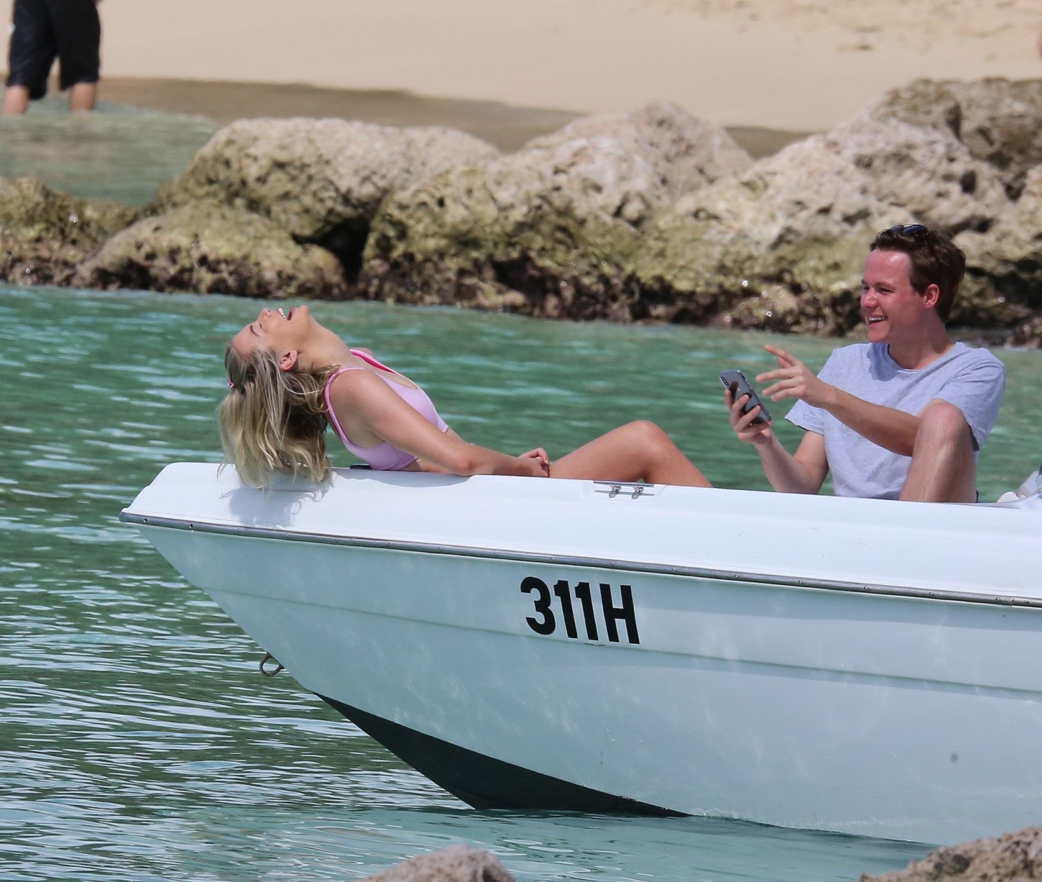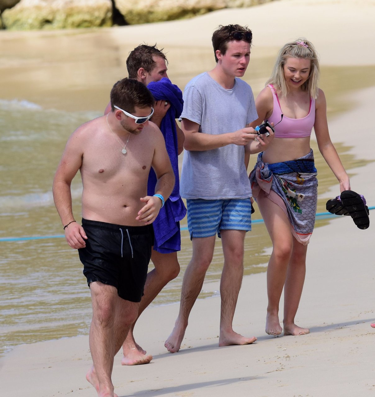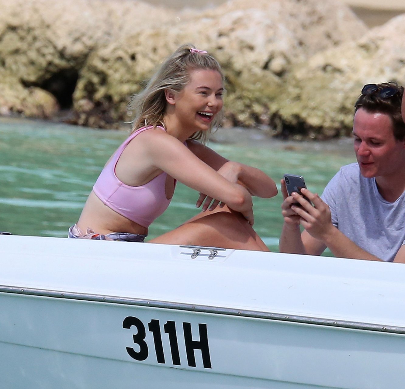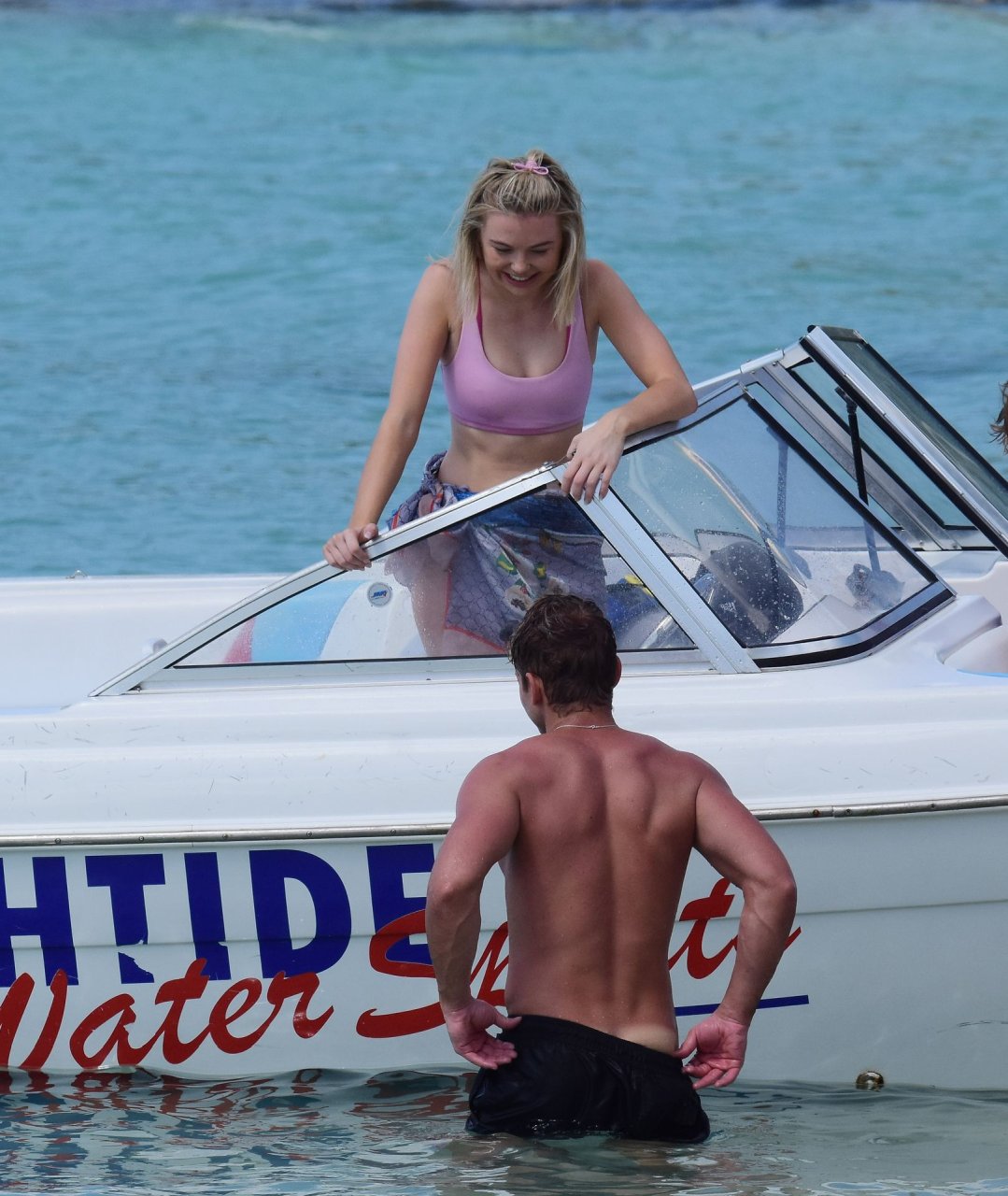 Georgia Toffolo (24) наслаждается солнечной погодой в розовом бикини и с радостью позирует с поклонником для фотографий на пляже в Барбадосе, 01/08/2019.