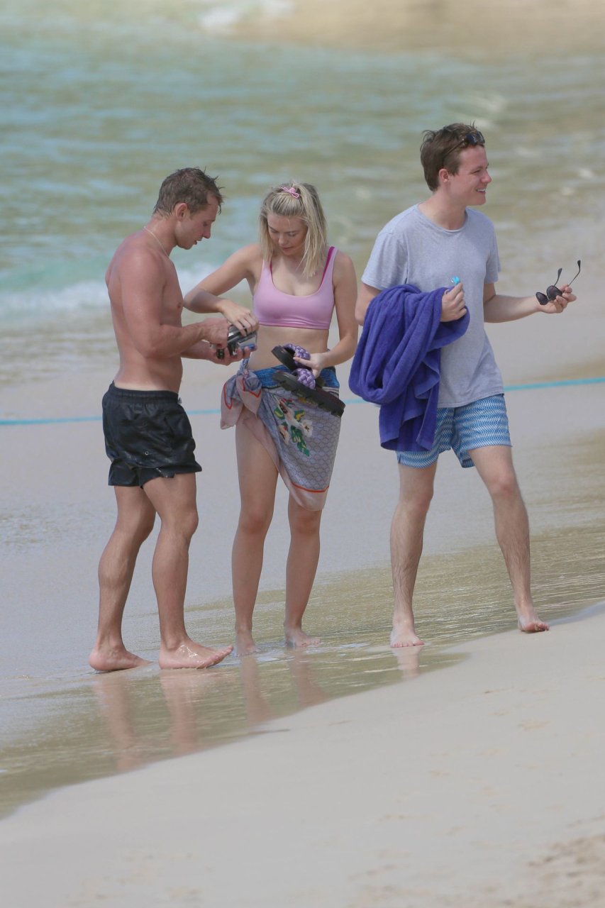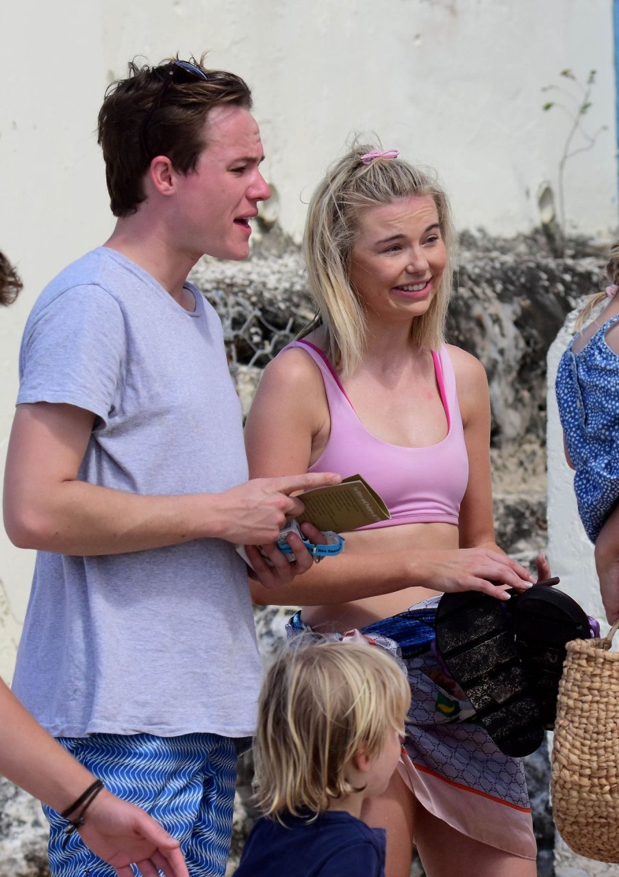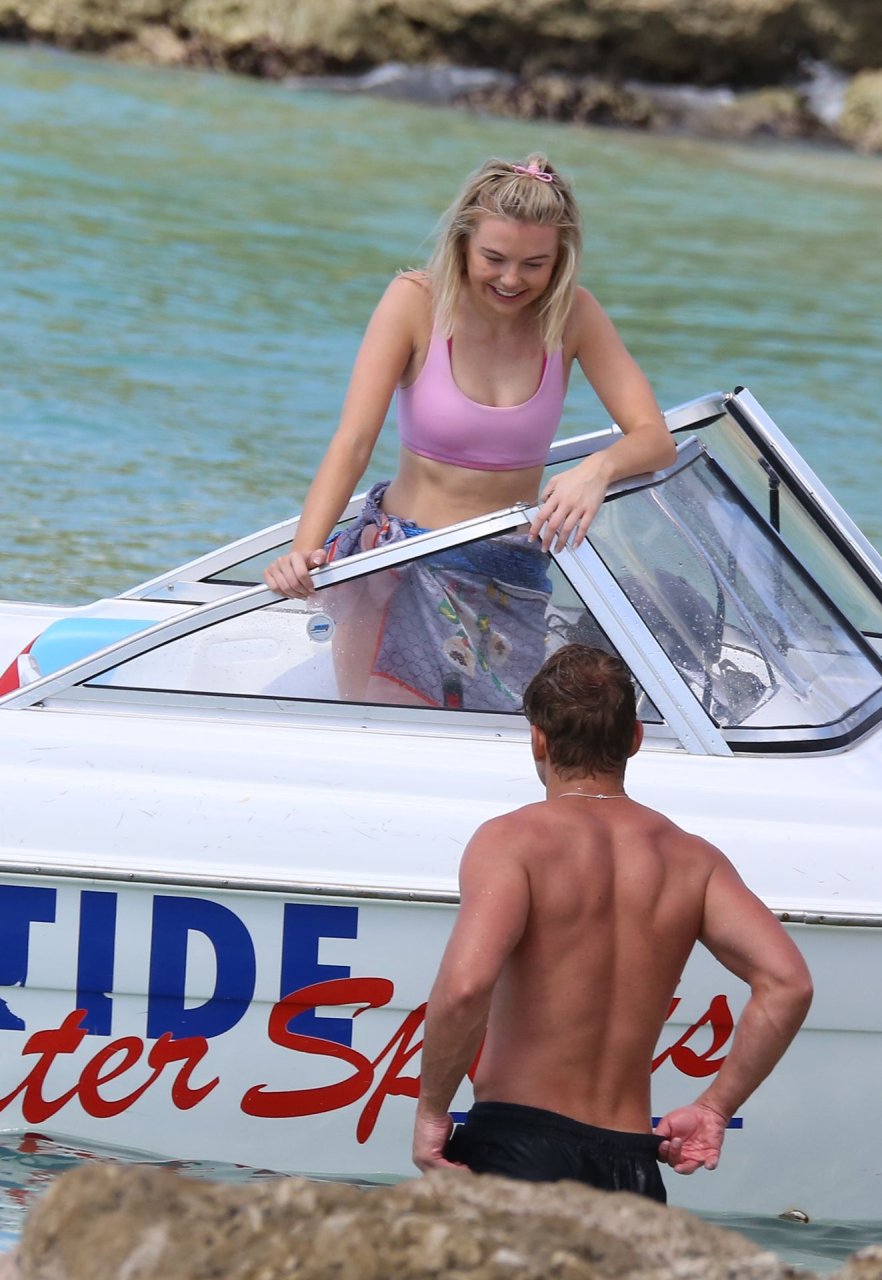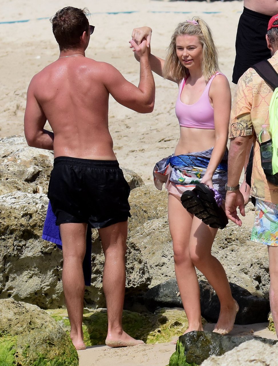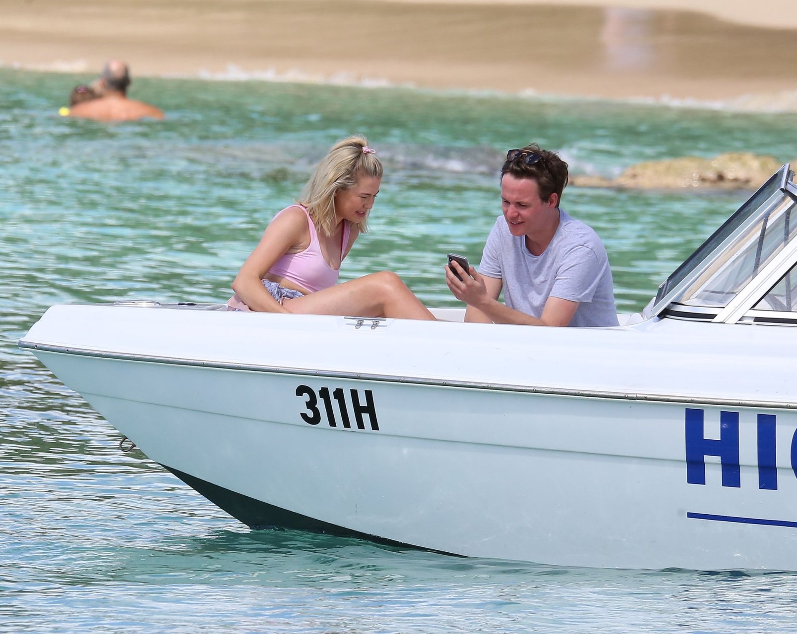 Georgia Toffolo (24) наслаждается солнечной погодой в розовом бикини и с радостью позирует с поклонником для фотографий на пляже в Барбадосе, 01/08/2019.