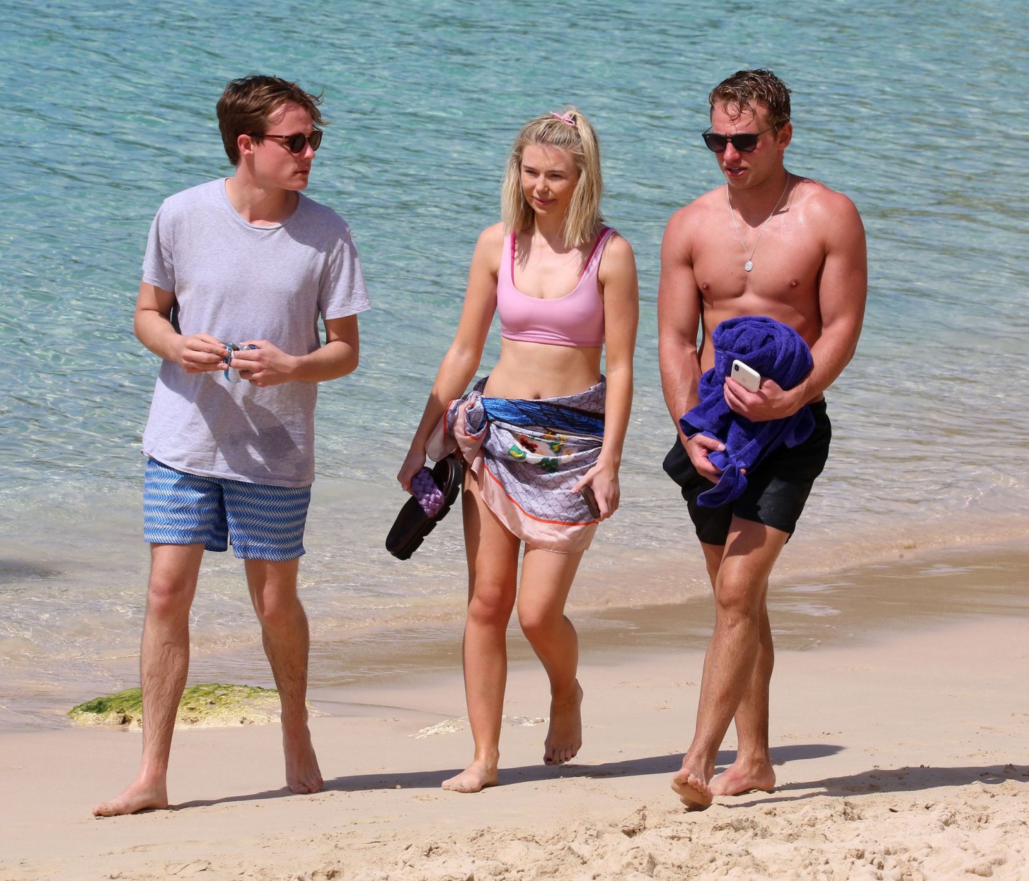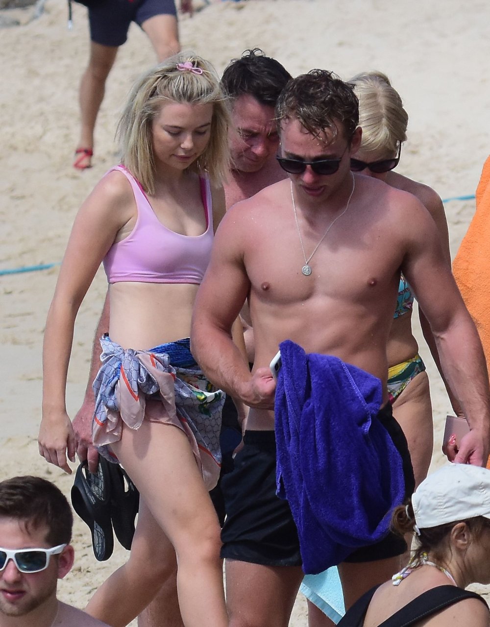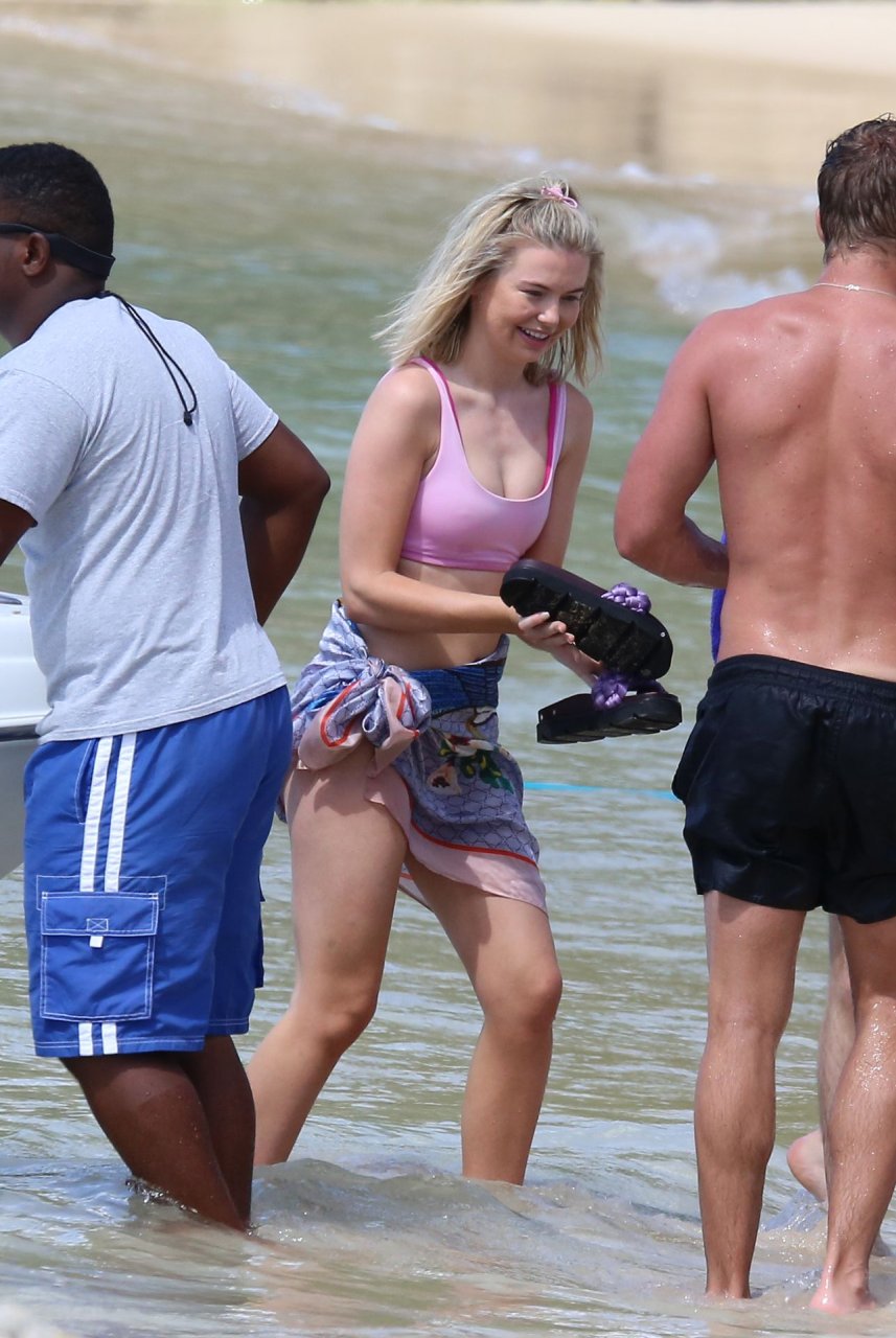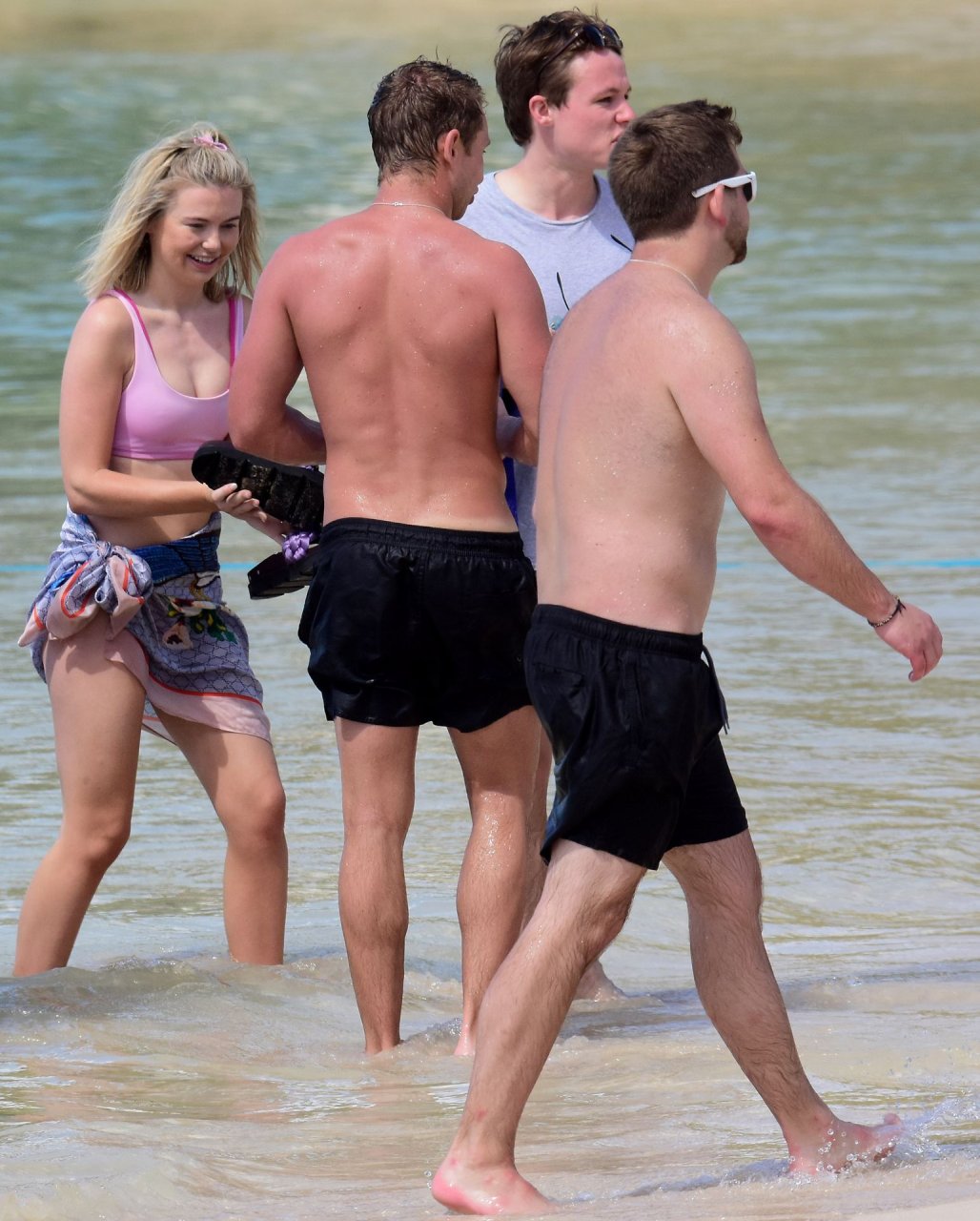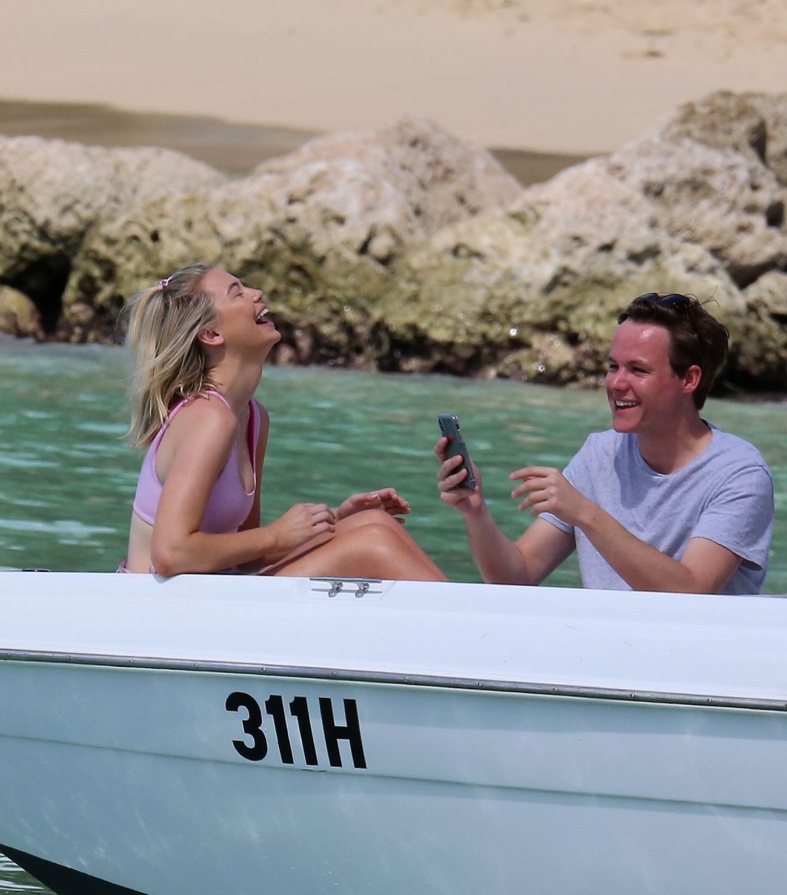 Georgia Toffolo (24) наслаждается солнечной погодой в розовом бикини и с радостью позирует с поклонником для фотографий на пляже в Барбадосе, 01/08/2019.