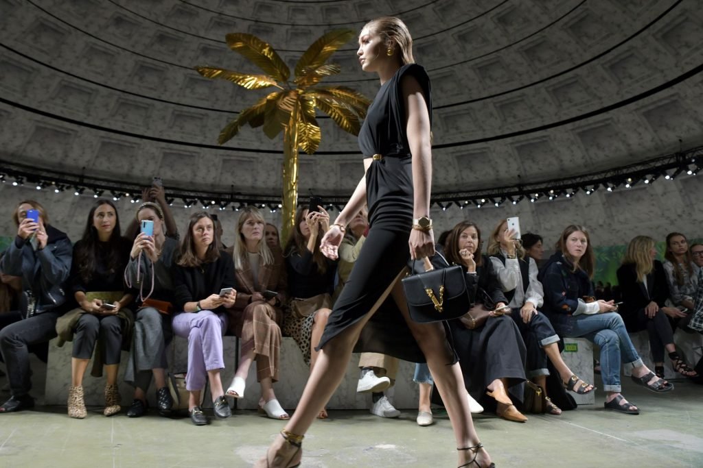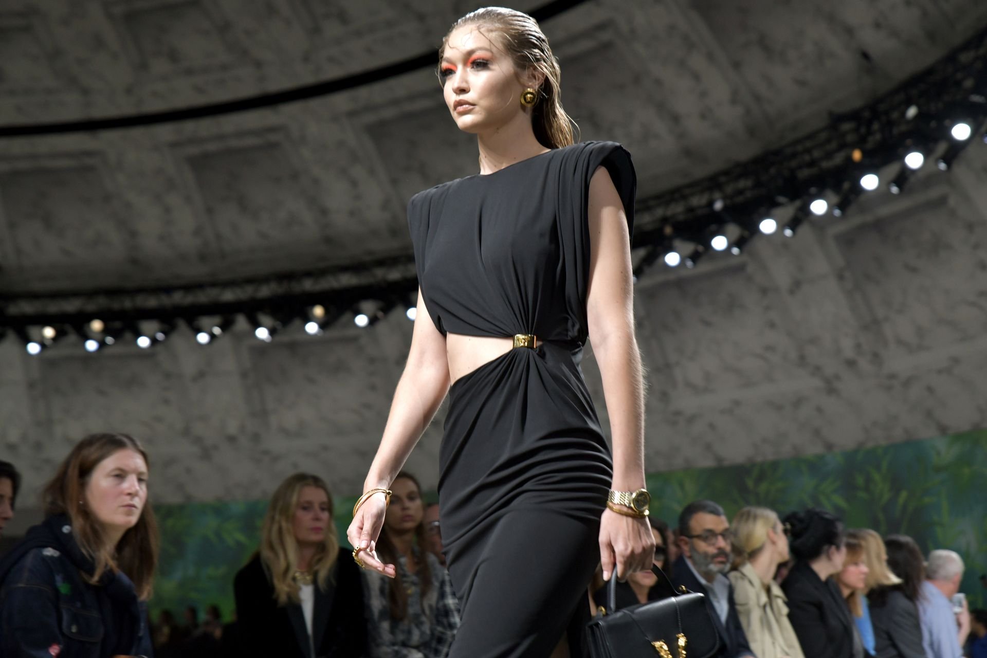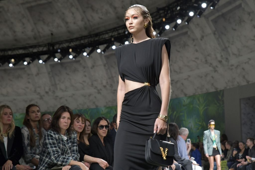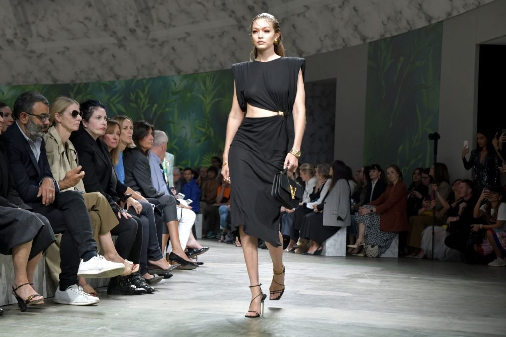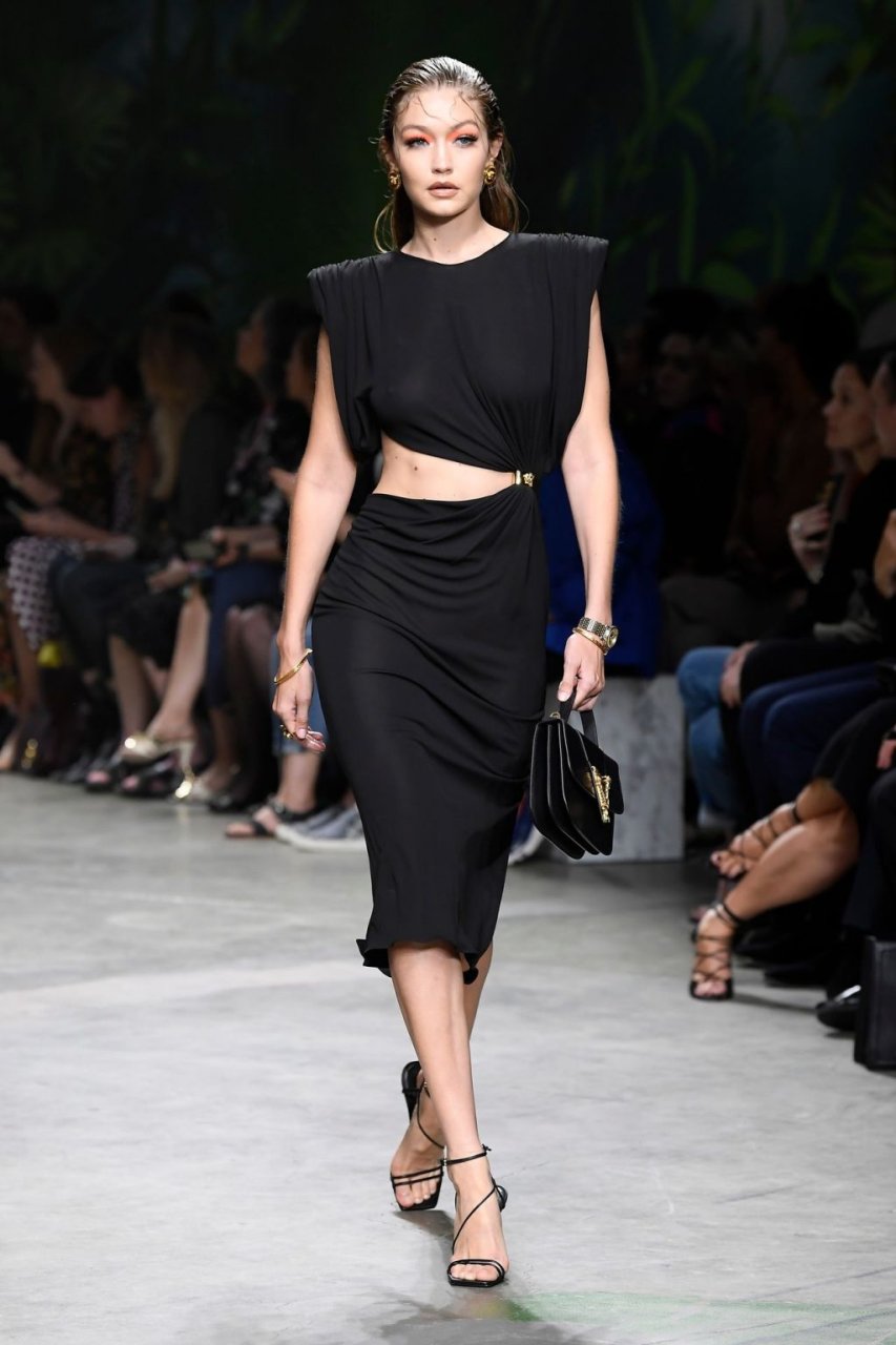 Модель Джи Джи Хадид выходит на подиум без бюстгальтера на показе Versace Весна/Лето 2020 во время Миланской недели моды в Италии, 20.09.2019.