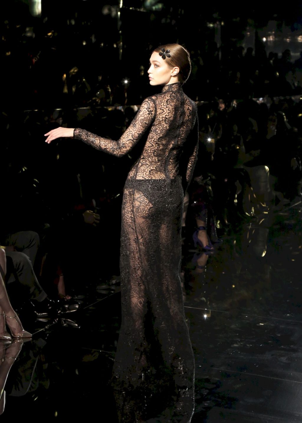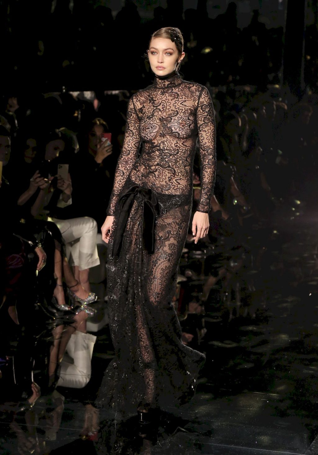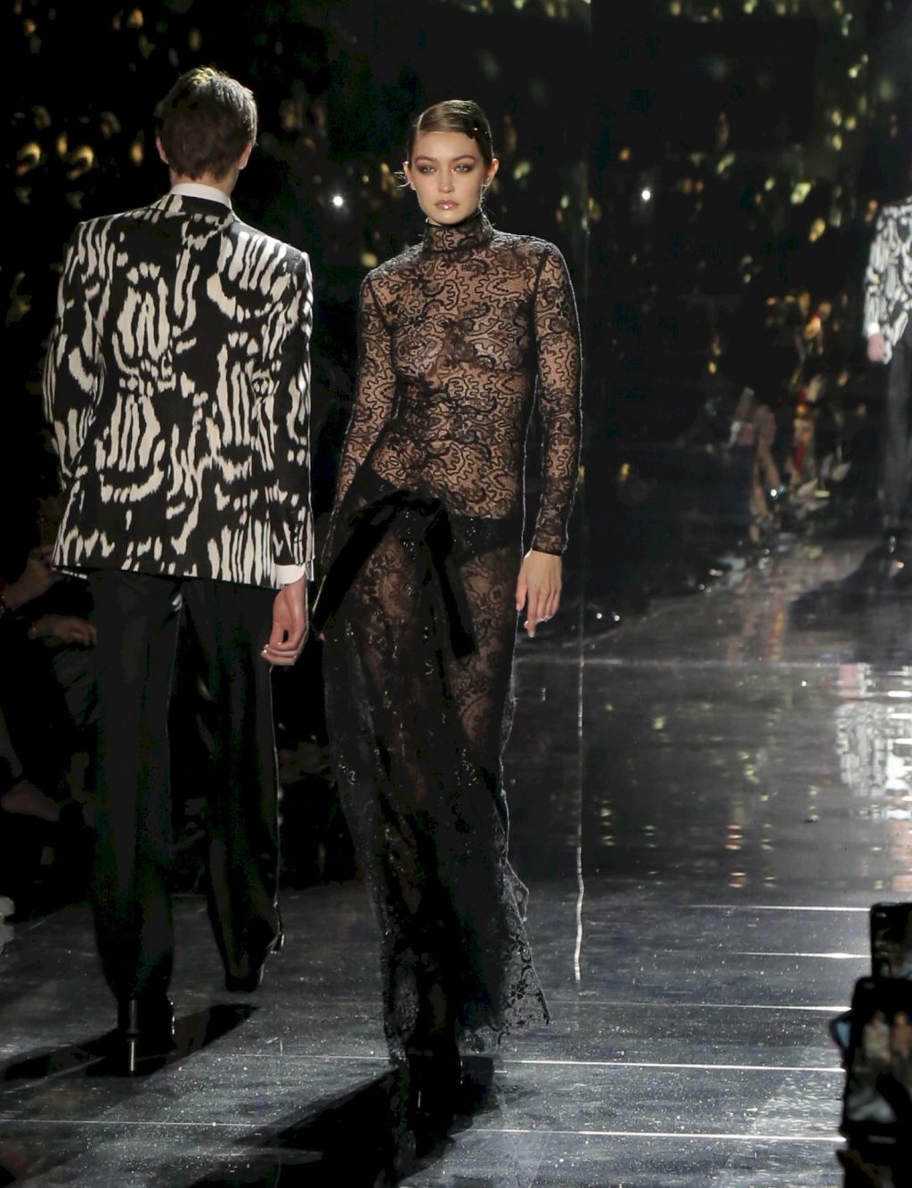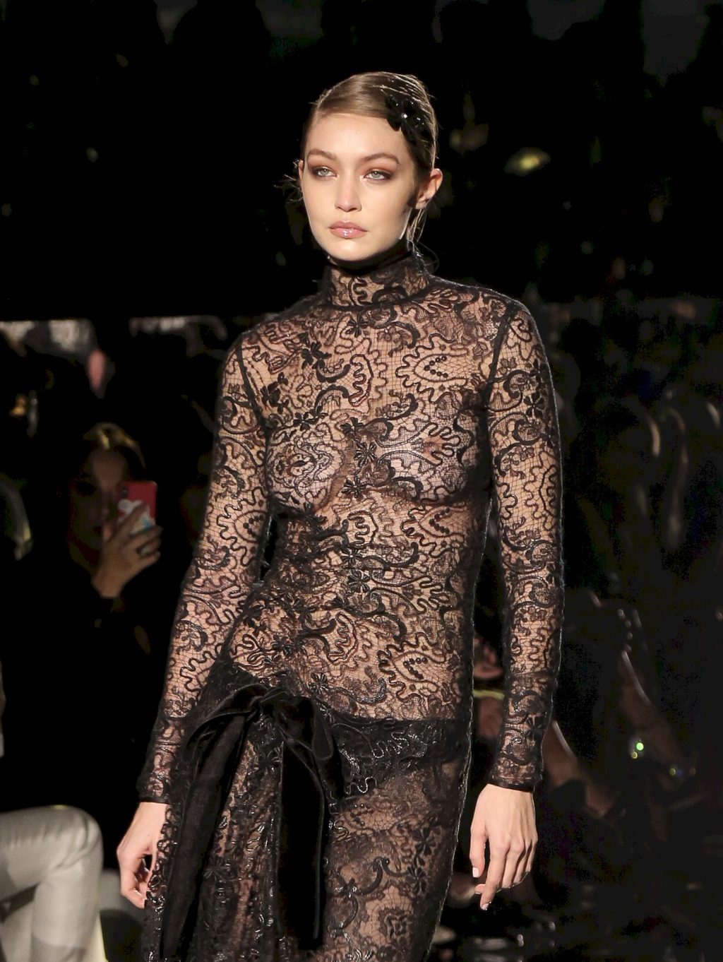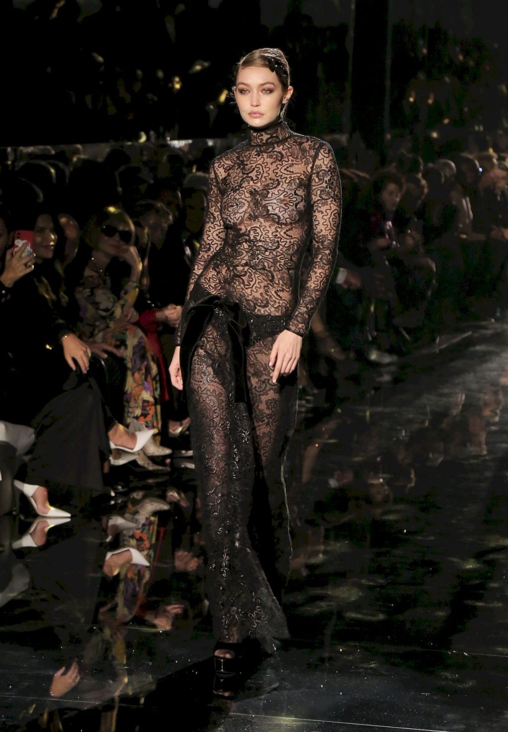 Джиджи Хадид выходит на подиум во время показа Tom Ford AW20 в Milk Studios 7 февраля 2020 года в Голливуде. Сестра Беллы также продемонстрировала свои груди, надев прозрачное платье.