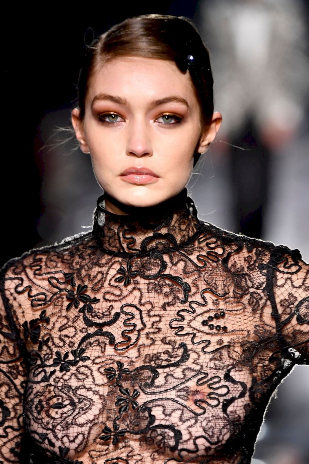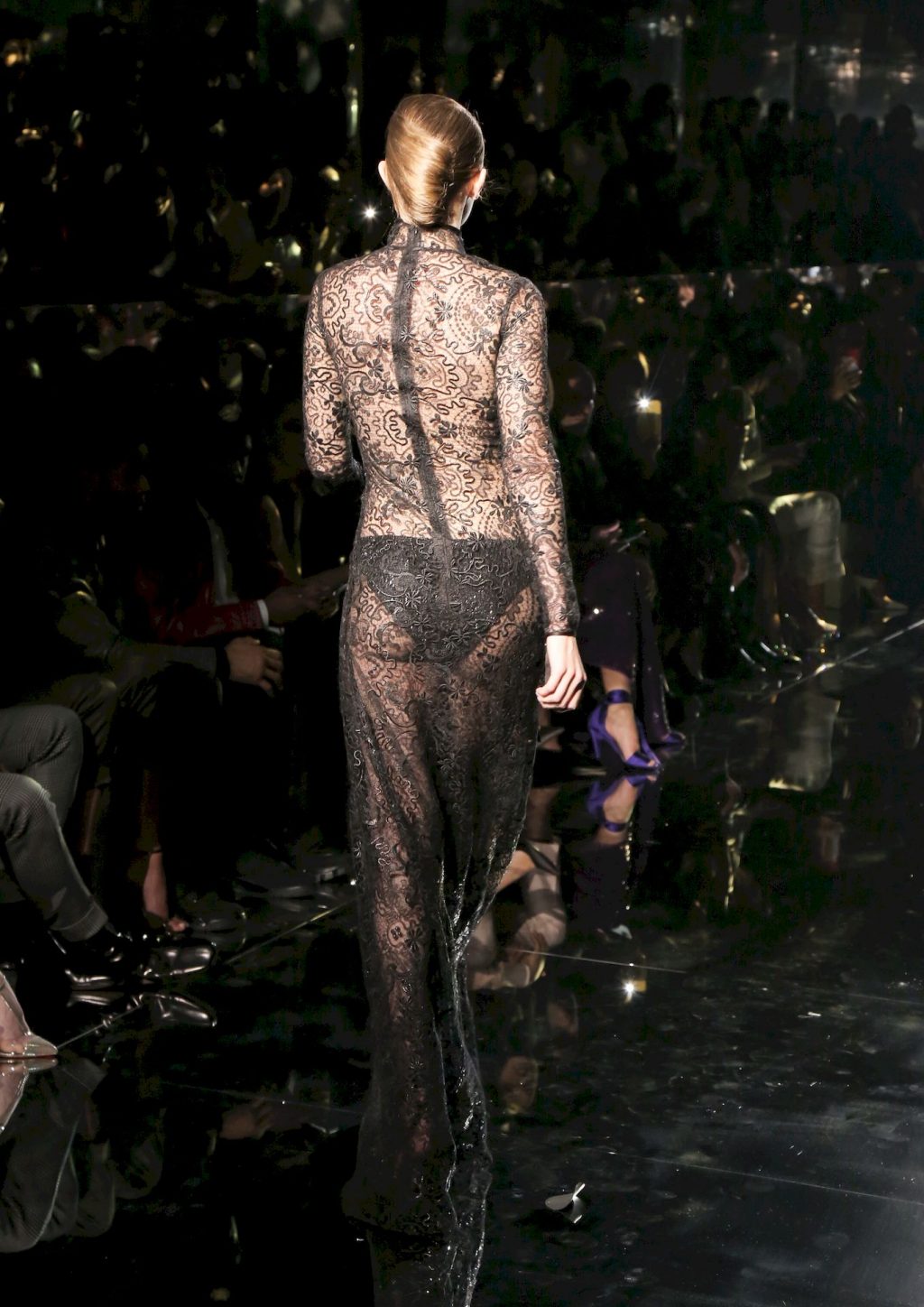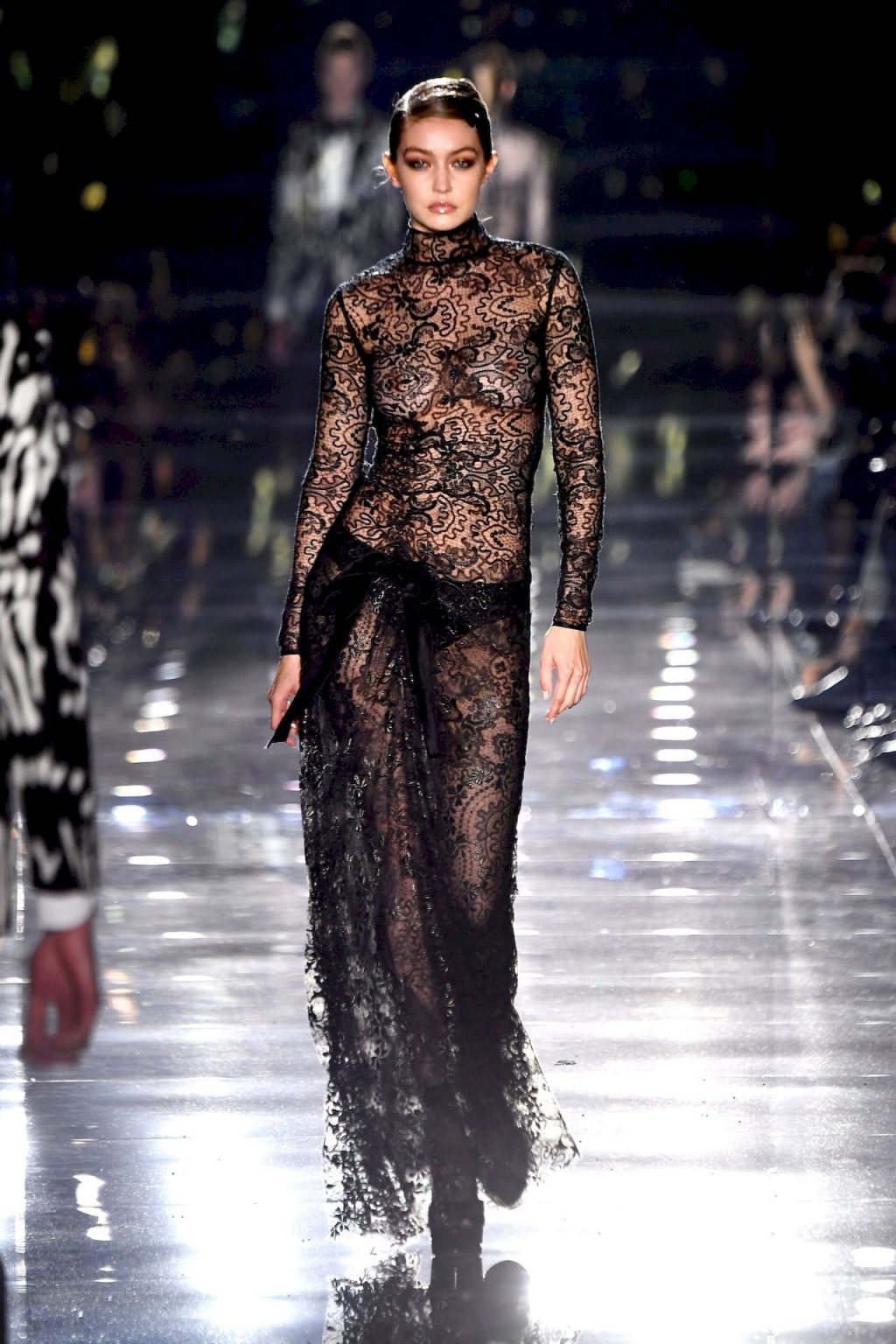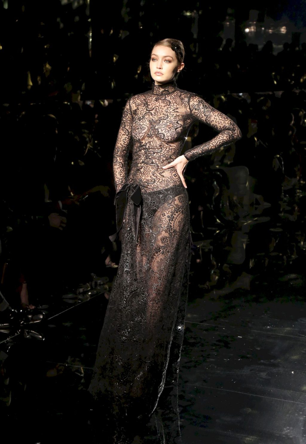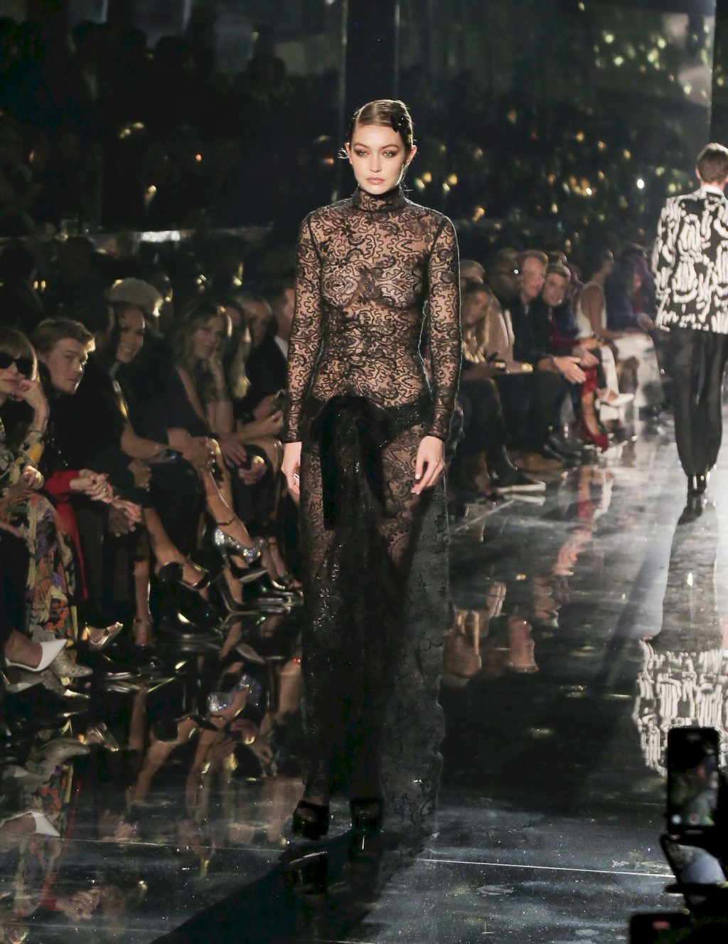 Джиджи Хадид выходит на подиум во время показа Tom Ford AW20 в Milk Studios 7 февраля 2020 года в Голливуде. Сестра Беллы также продемонстрировала свои груди, надев прозрачное платье.