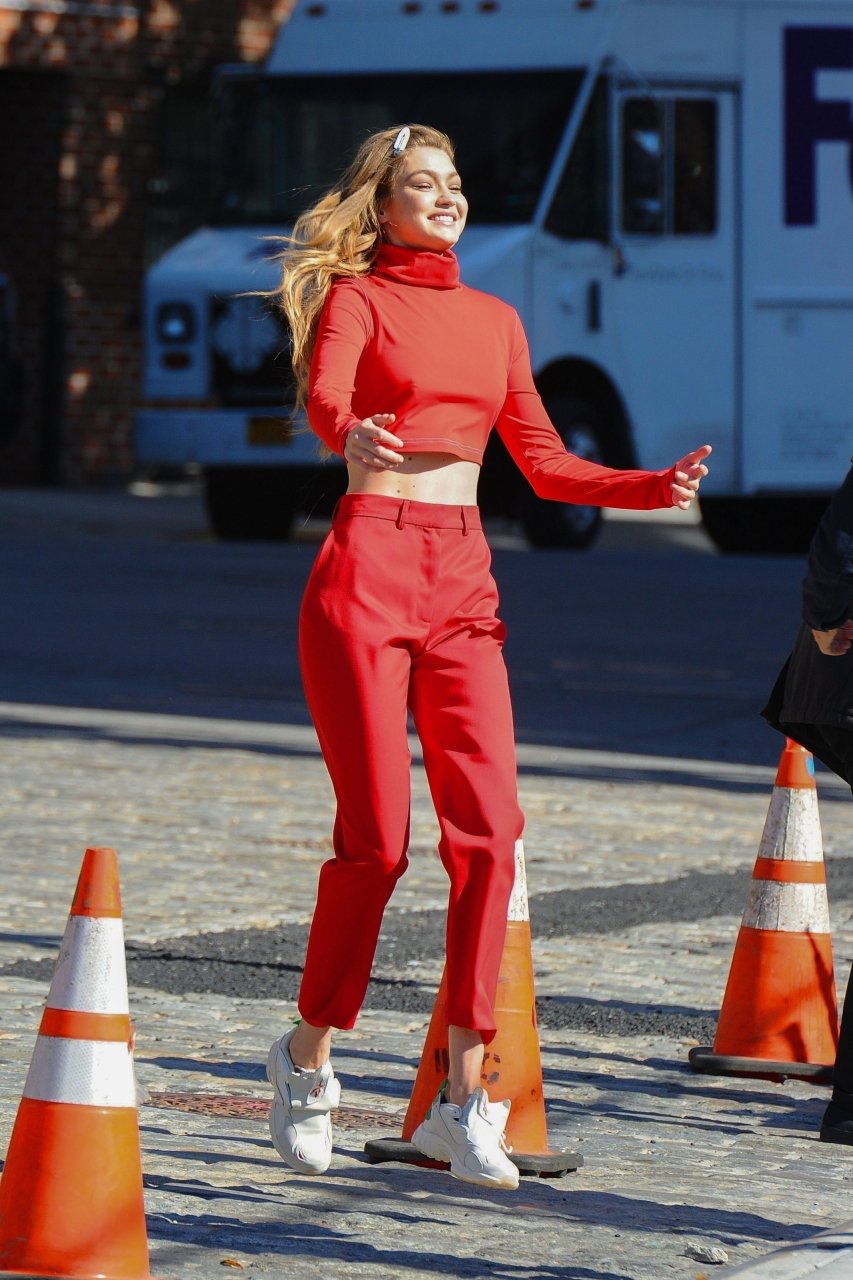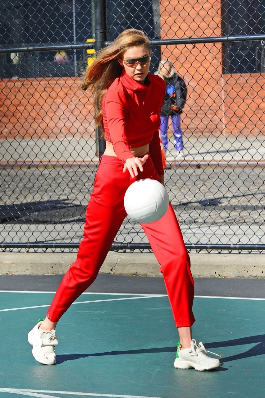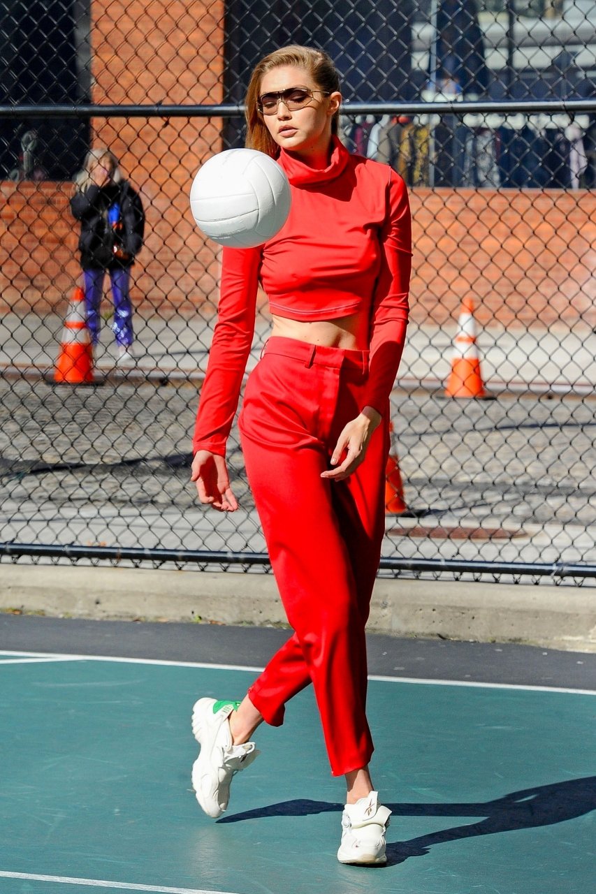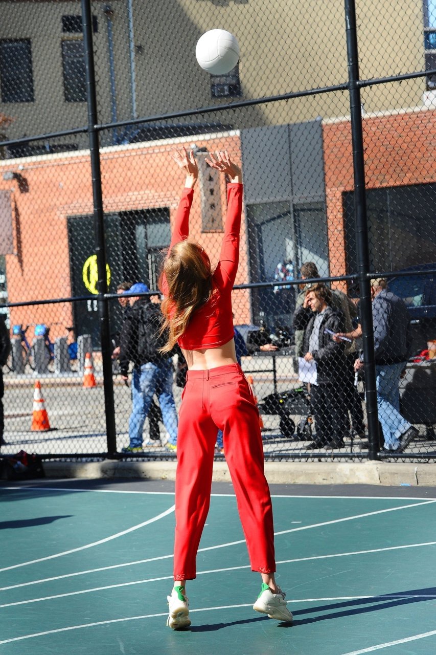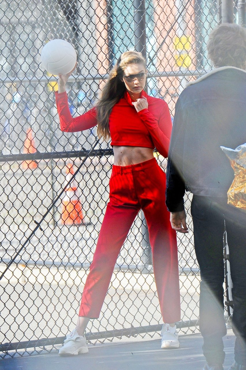 Модель Джиджи Хадид (23 года) играет в волейбол на съемочной площадке в Нью-Йорке, 17.10.2018. Джиджи демонстрирует свой живот и формы в красном наряде с белыми кроссовками, играя с волейбольным мячом во время перерыва.
