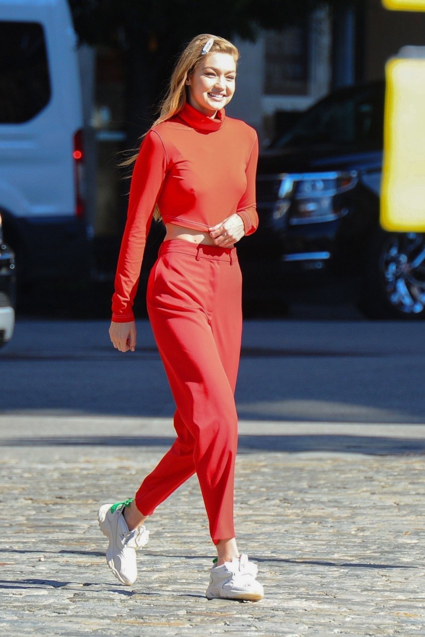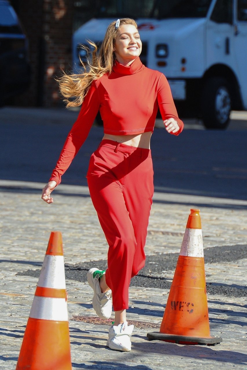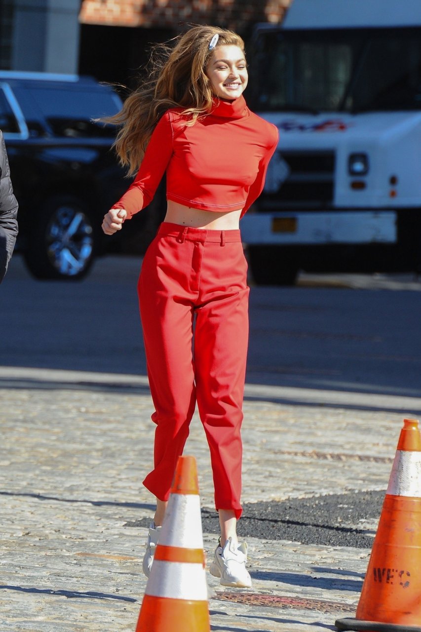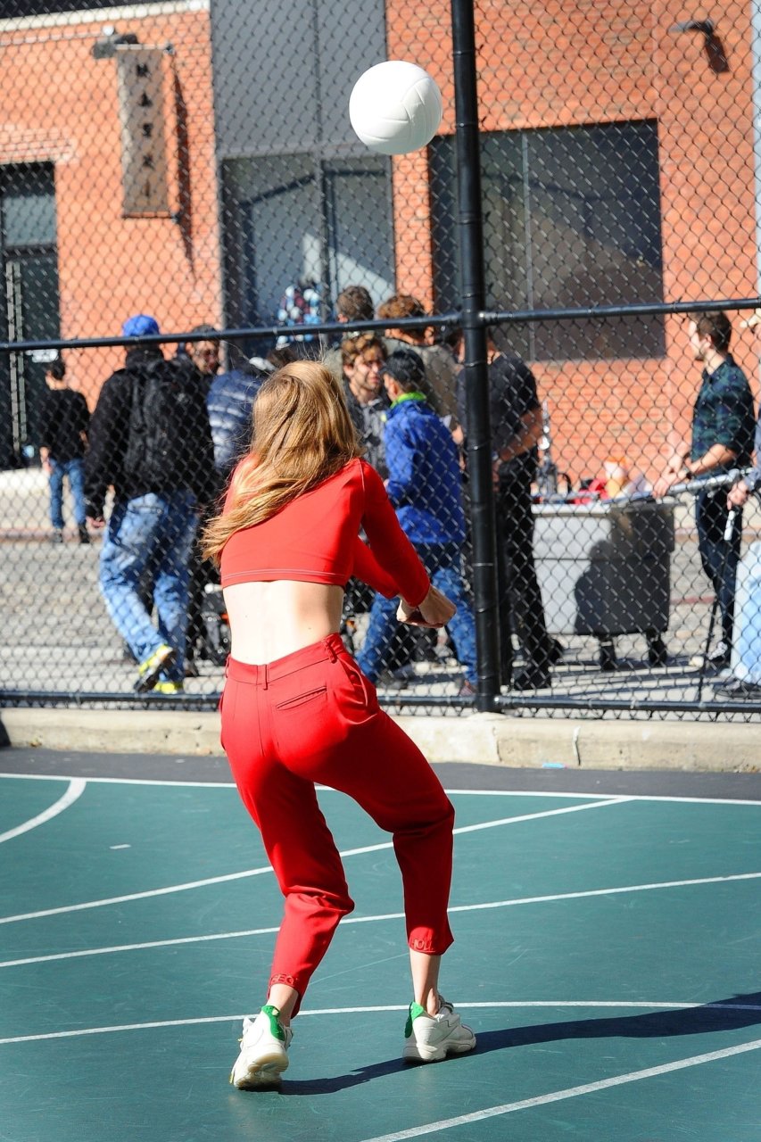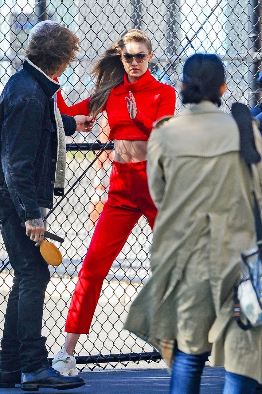 Модель Джиджи Хадид (23 года) играет в волейбол на съемочной площадке в Нью-Йорке, 17.10.2018. Джиджи демонстрирует свой живот и формы в красном наряде с белыми кроссовками, играя с волейбольным мячом во время перерыва.