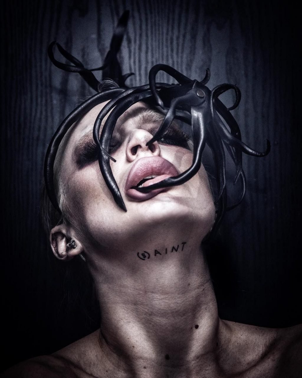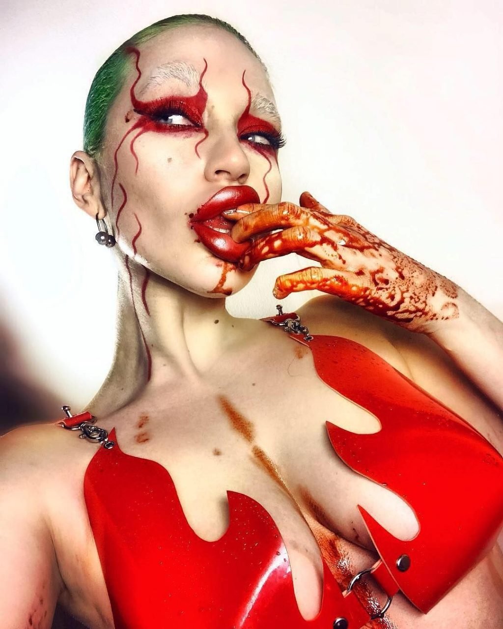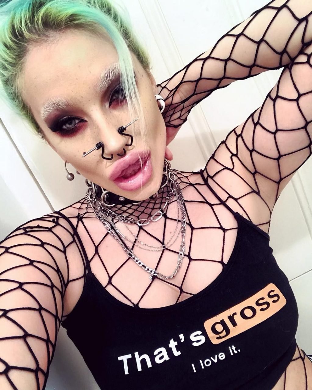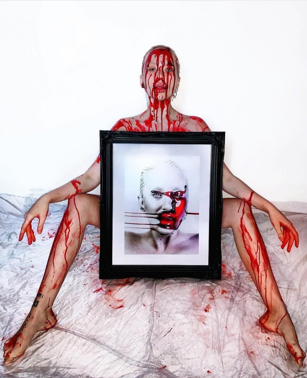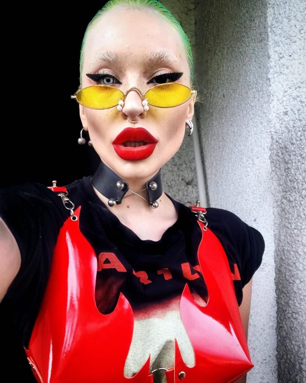 Гина известна своими шокирующими и провокационными фотосессиями. Эта женщина особенно сочетает красоту и бесчестие: странные наряды, загадочный макияж, зловещие татуировки. У Гины есть татуировка на языке. Внешность Гины Харрисон просто потрясающая. У неё большая грудь, сексуальная попа и невероятно тонкая талия, и она не скрывает от поклонников использование пластической хирургии.