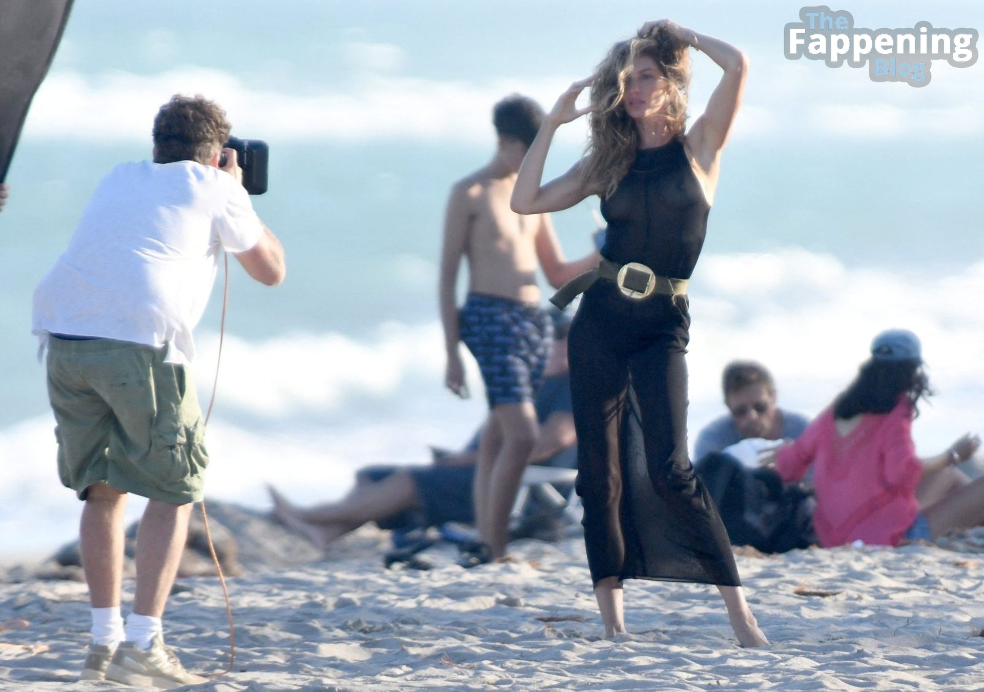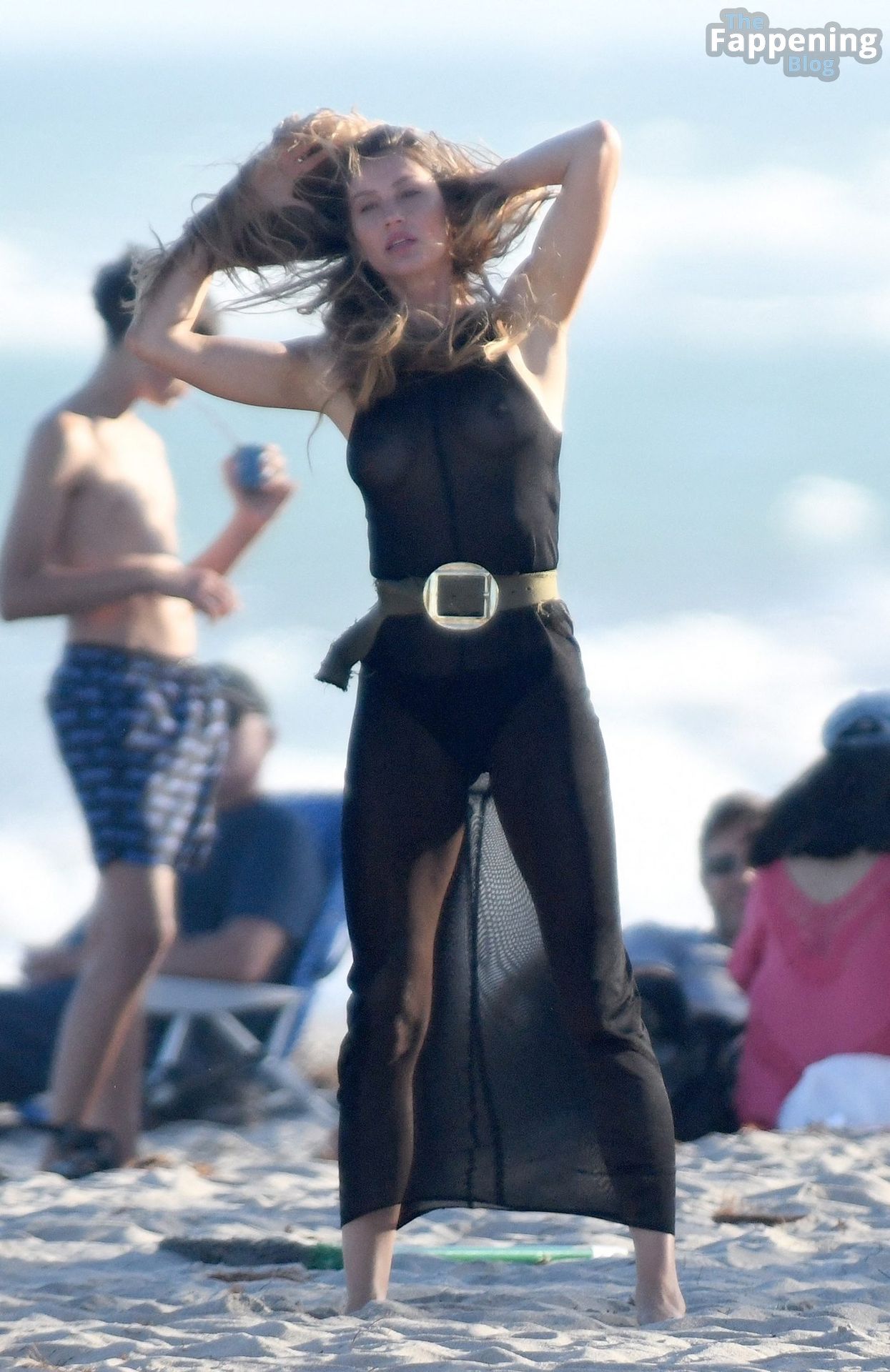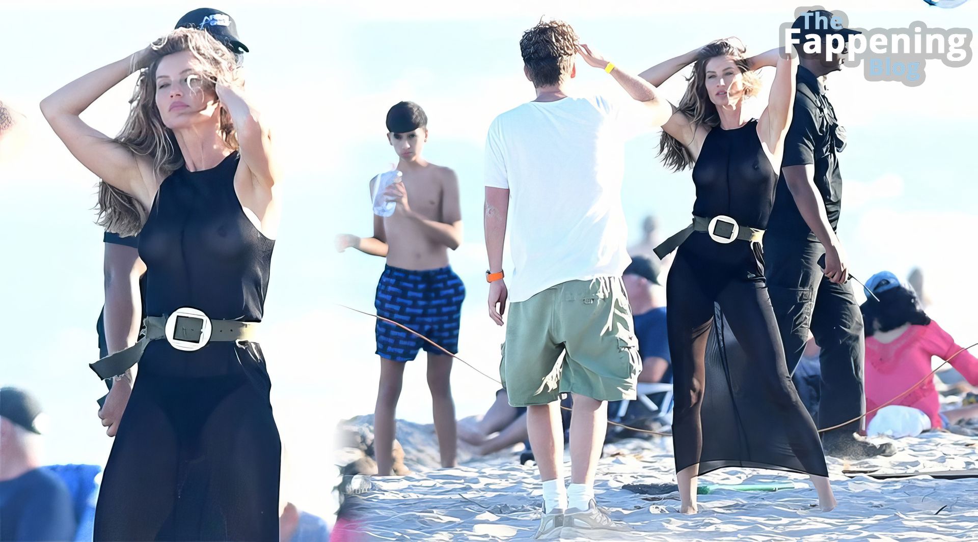 Жизель Бюндхен показывает свои груди и соски, позируя без бюстгальтера в прозрачном наряде во время фотосессии на Майами-Бич.