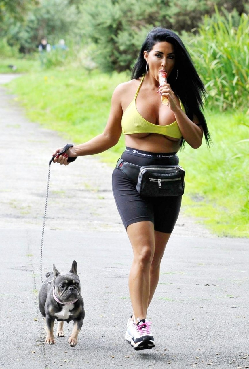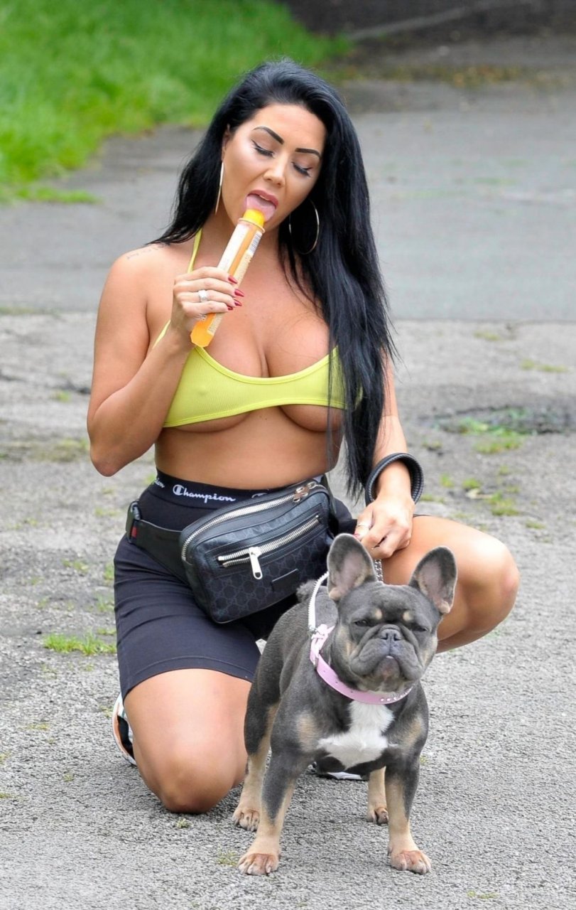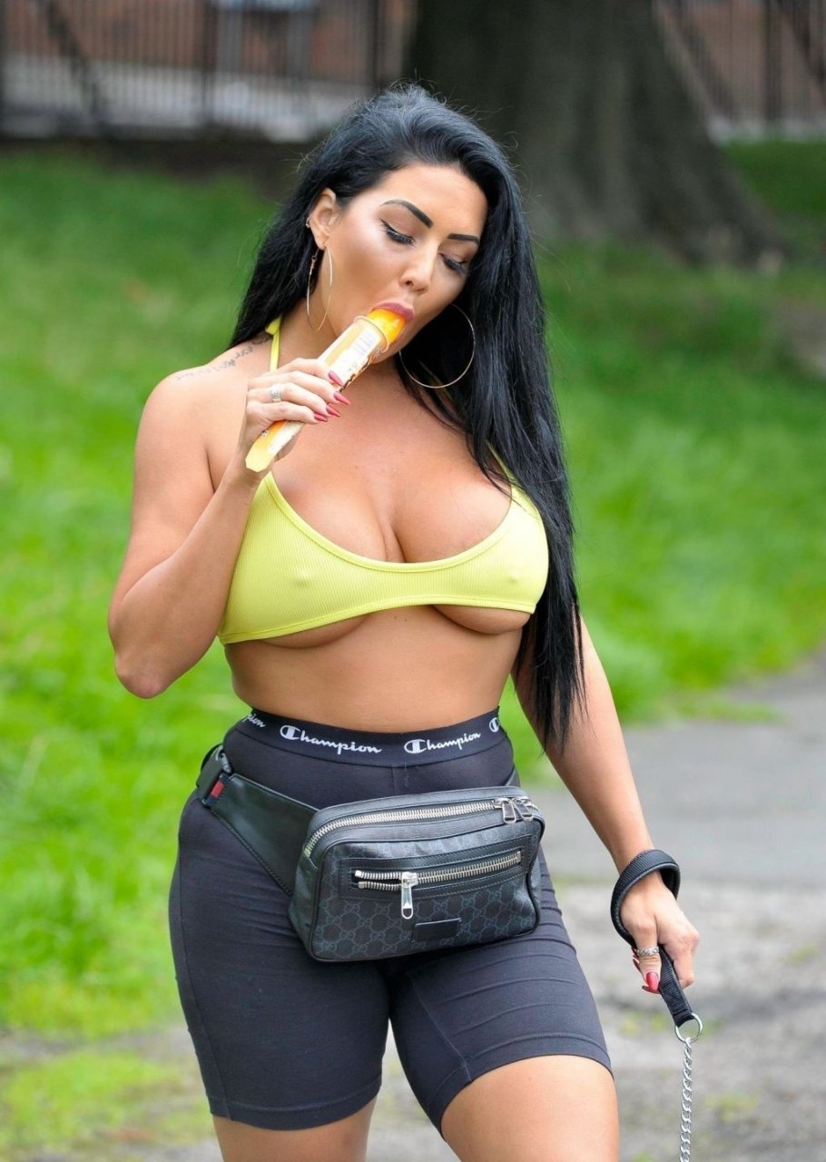 Гламурная модель Грейс Джей Тил была замечена в парке, когда выгуливала свою собаку Блу, демонстрируя очень пышные формы и попав в забавную ситуацию с мороженым Calippo в Манчестере, 24.08.2019.