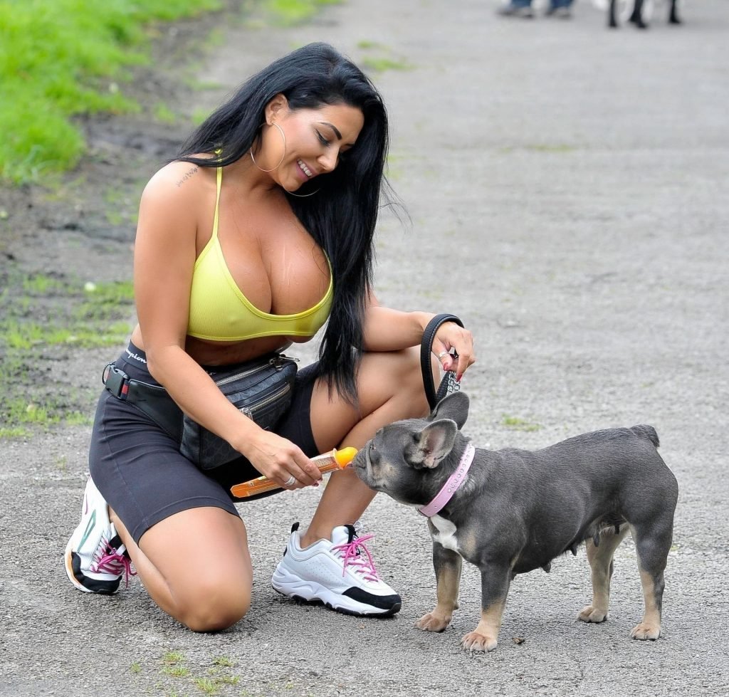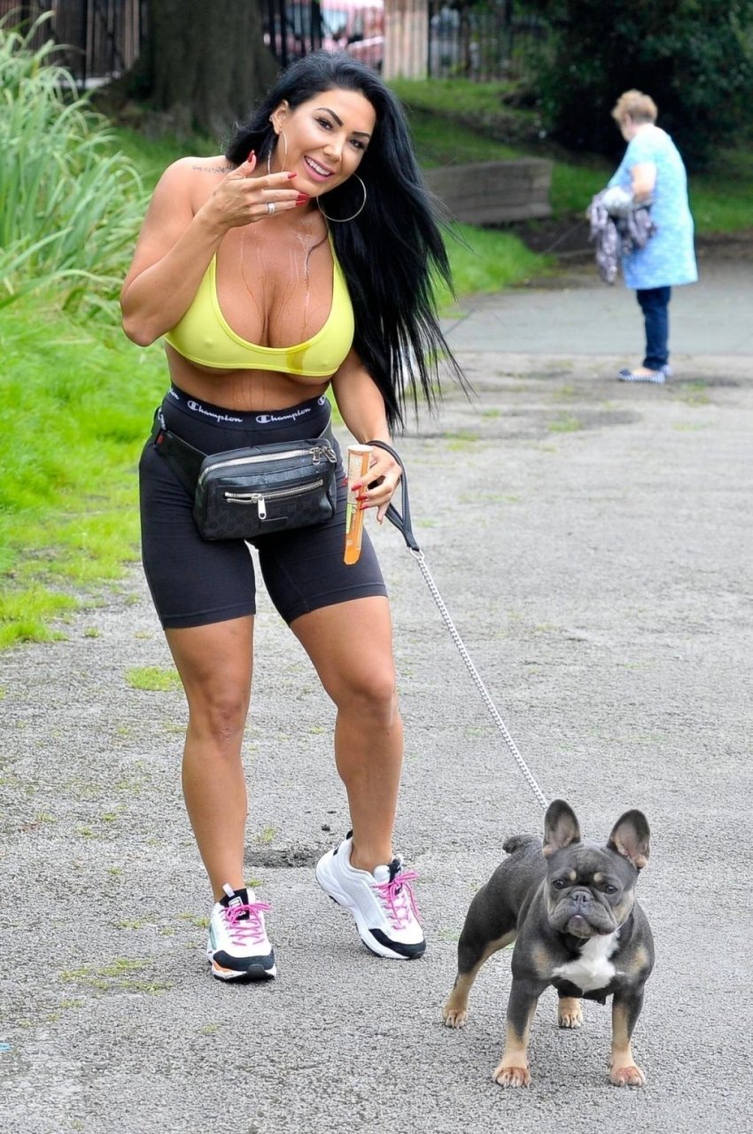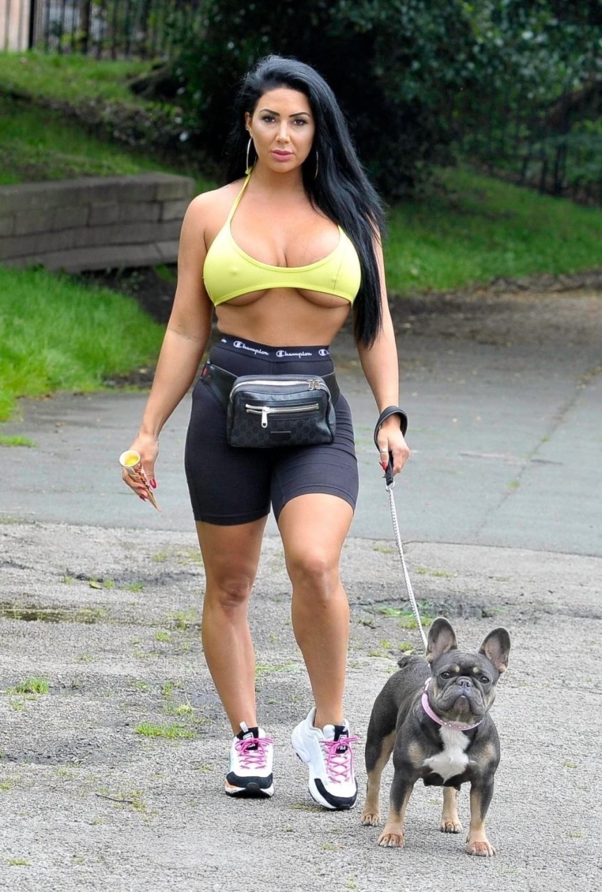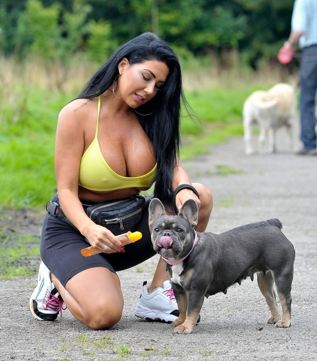 Гламурная модель Грейс Джей Тил была замечена в парке, когда выгуливала свою собаку Блу, демонстрируя очень пышные формы и попав в забавную ситуацию с мороженым Calippo в Манчестере, 24.08.2019.