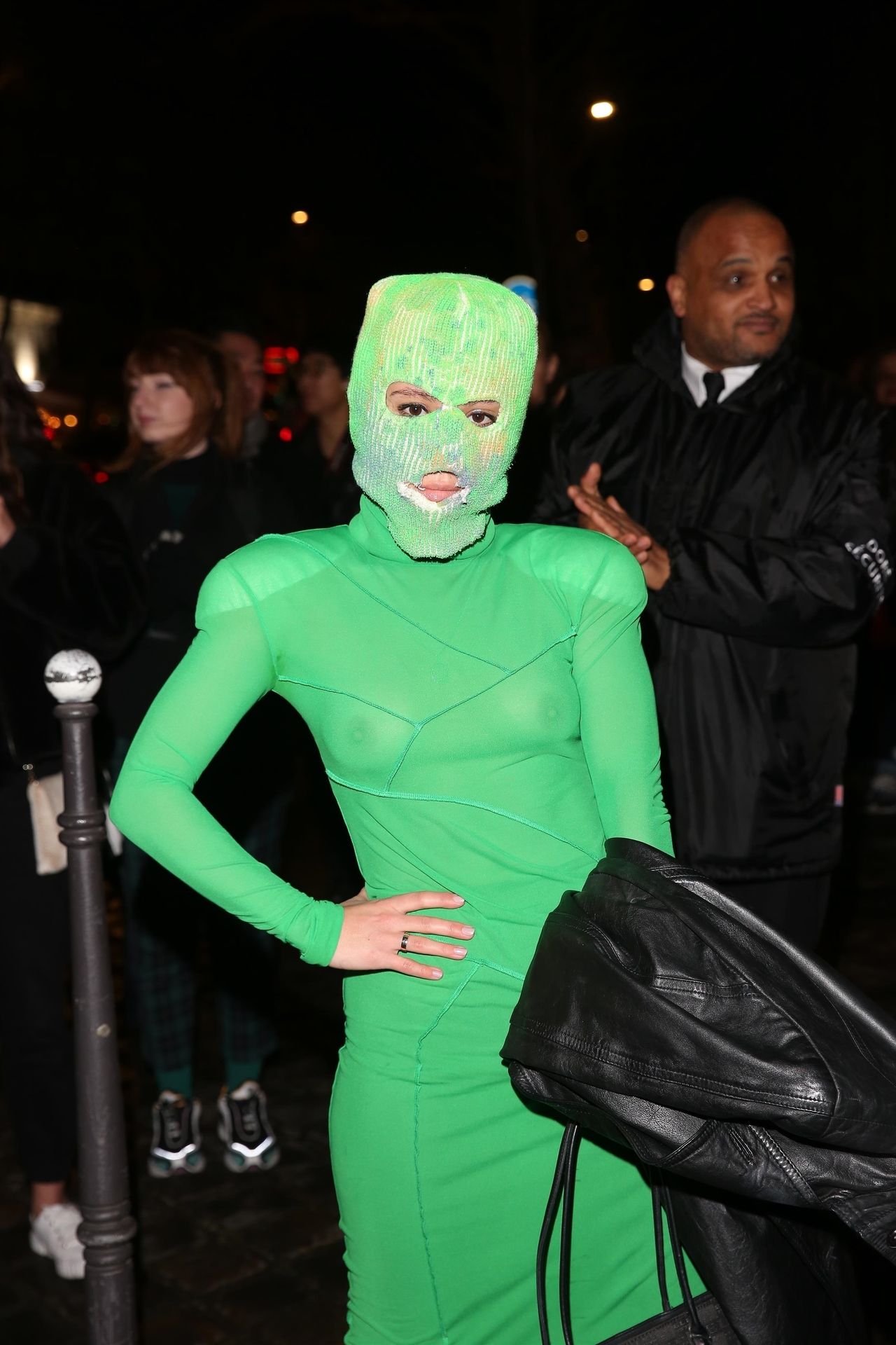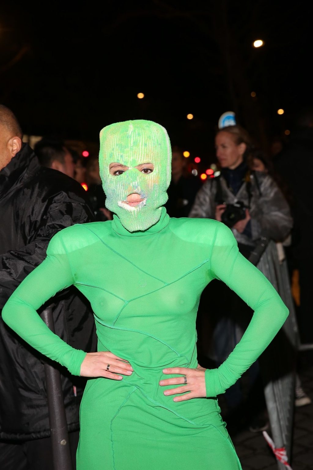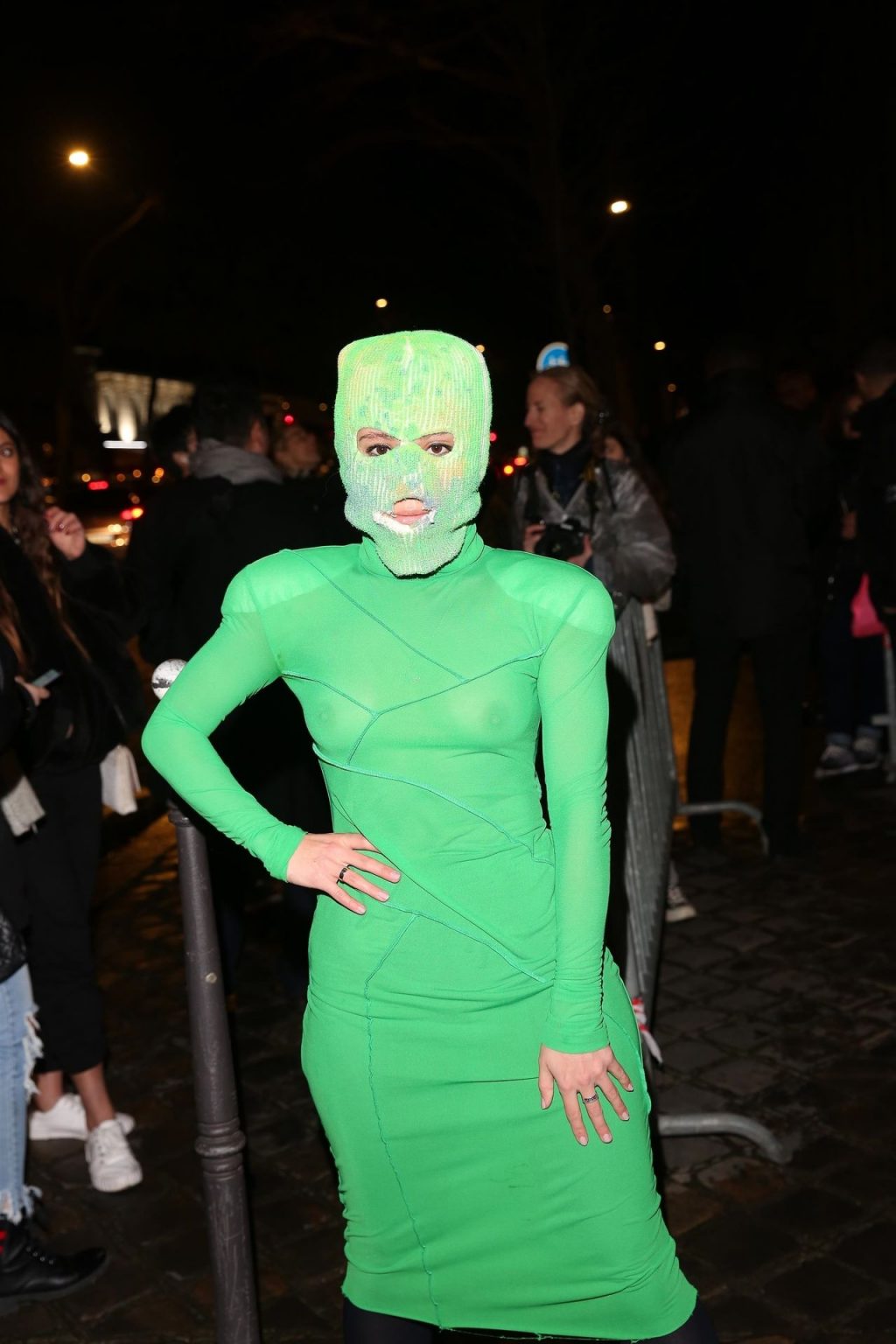Неизвестный гость-ниндзя был сфотографирован в прозрачном зелёном наряде без бюстгальтера при прибытии на показ мод Hermes в Париже, Франция, 29.02.2020.