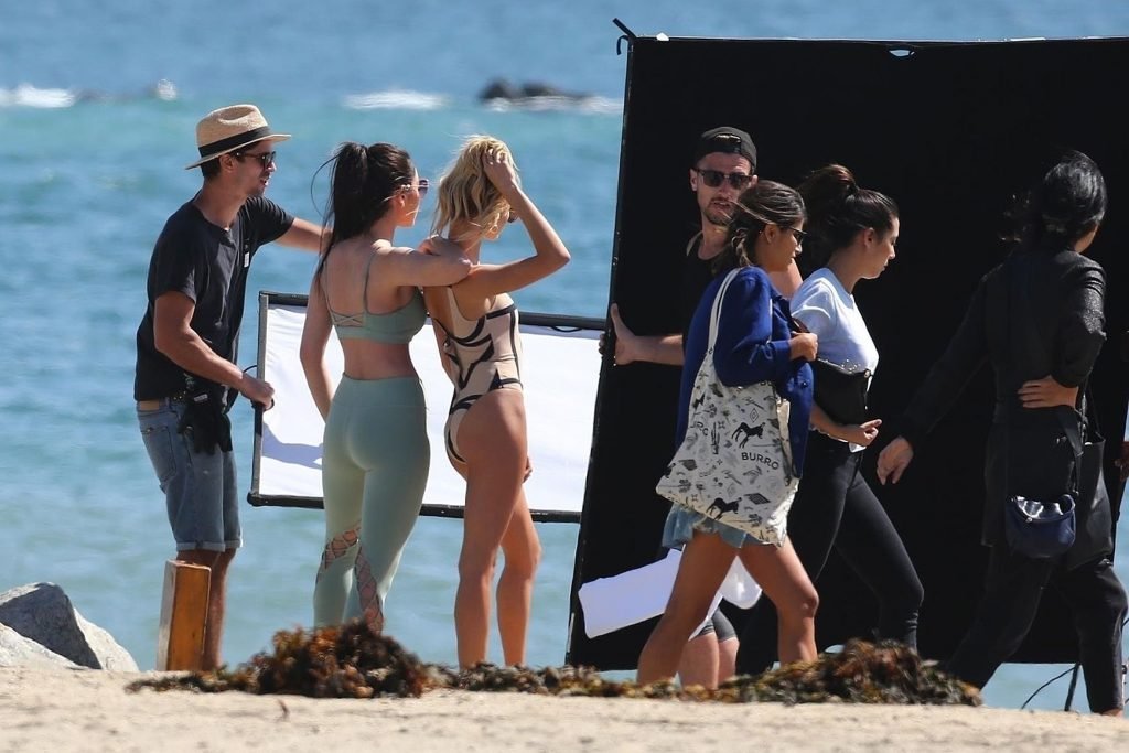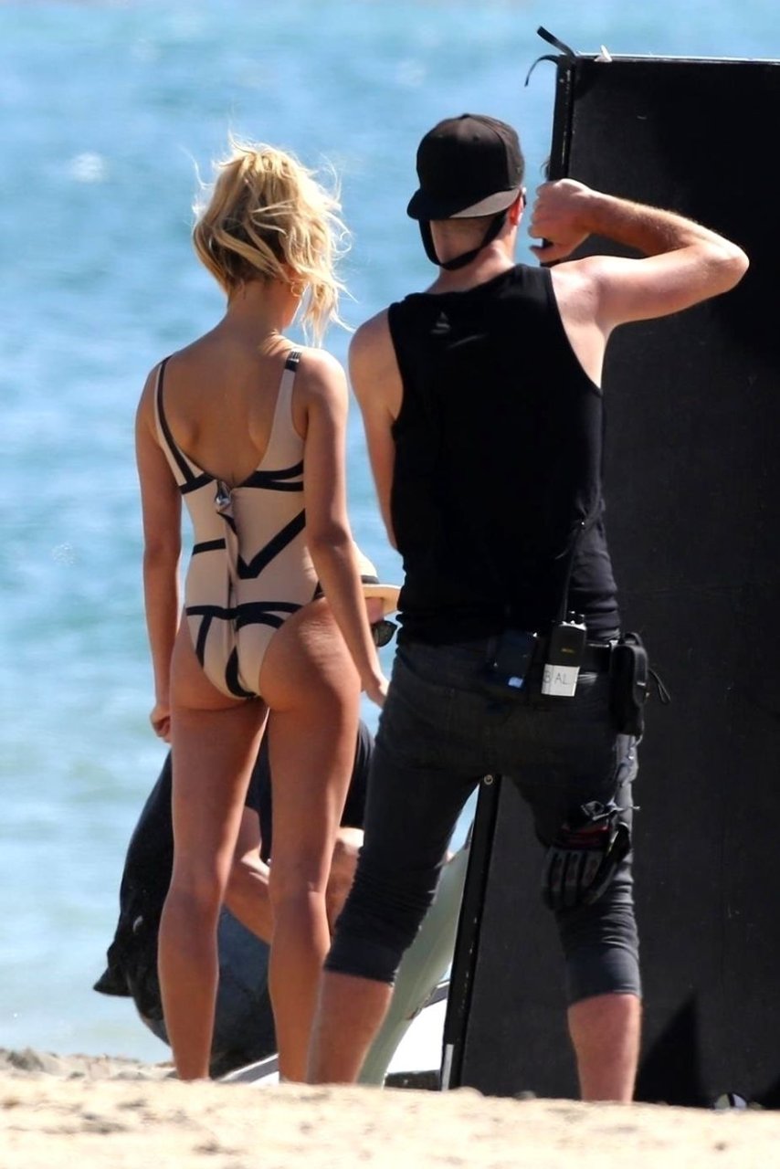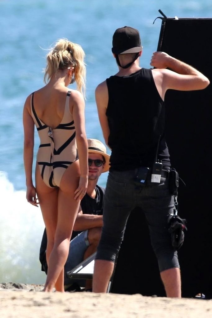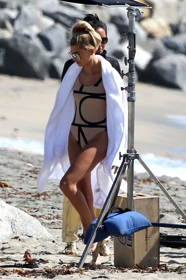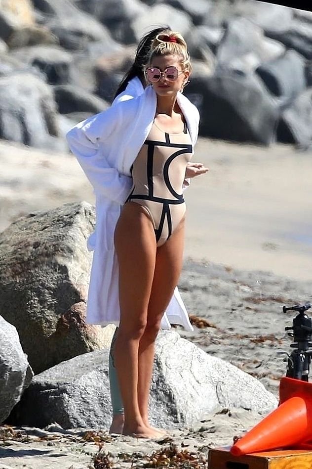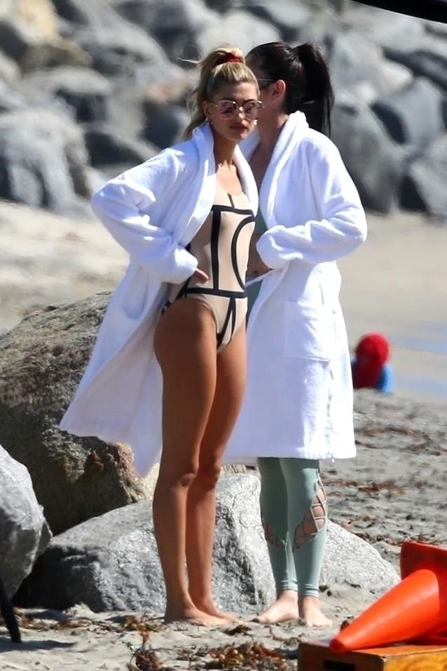 Модель Хейли Болдуин (20 лет) позирует в цельном купальнике для новой фотосессии на пляжах Лонг-Бич, 13.10.2017.