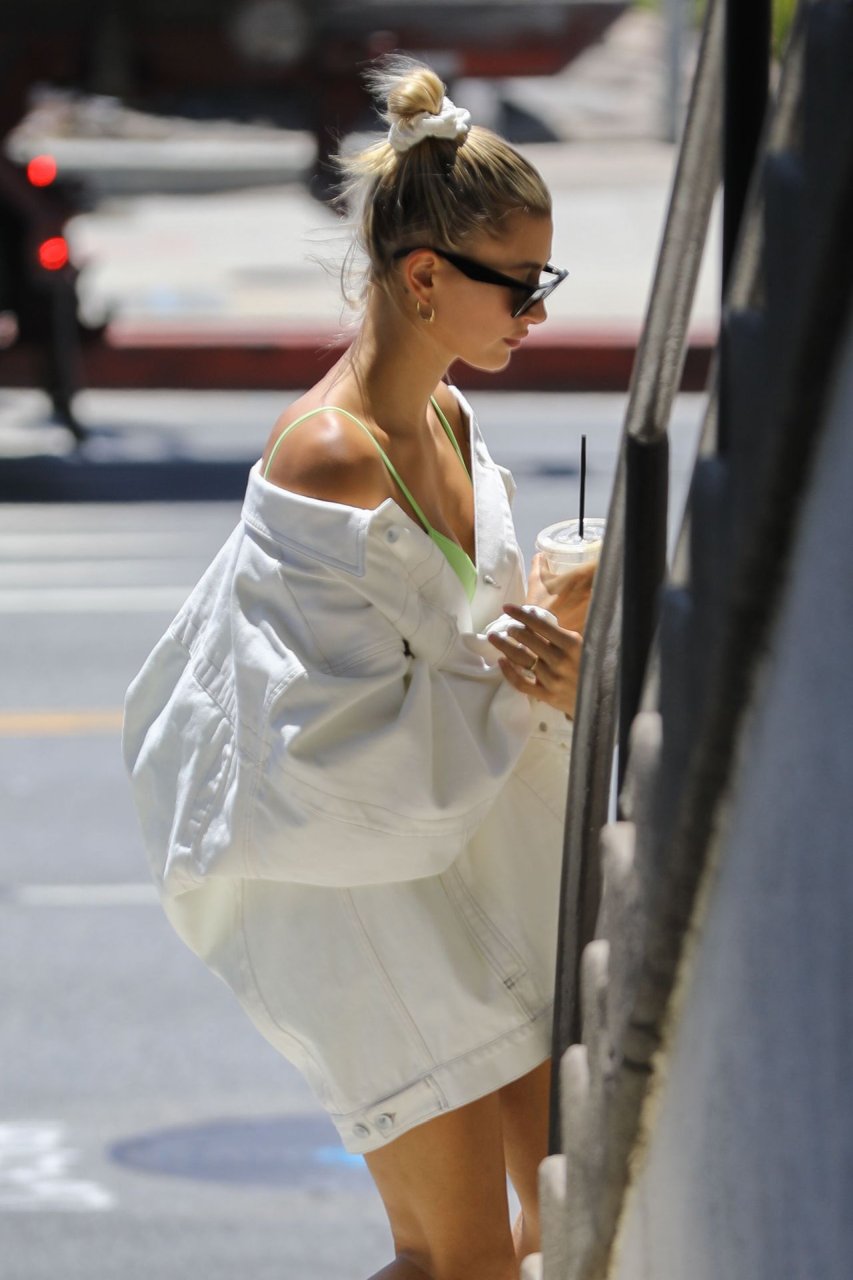 Что же у неё под этим?! Хейли Болдуин прикрывается оверсайз джинсовой курткой белого цвета и, по всей видимости, неоновым зелёным спортивным бюстгальтером или верхом купальника — Уэст-Голливуд, 20.08.2019.