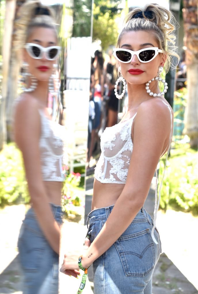 Хейли Болдуин носит прозрачный белый кружевной топ на бранче Levi’s Coachella в Палм-Спрингс, 14.04.2018. Хейли Роуд Болдуин — 21-летняя американская модель, телезвезда и актриса (Однажды в Голливуде (2018)).