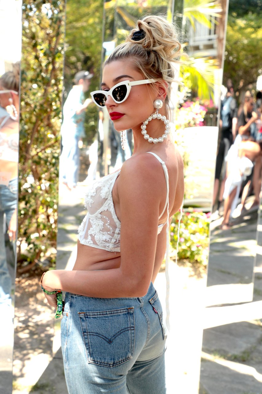 Хейли Болдуин носит прозрачный белый кружевной топ на бранче Levi’s Coachella в Палм-Спрингс, 14.04.2018. Хейли Роуд Болдуин — 21-летняя американская модель, телезвезда и актриса (Однажды в Голливуде (2018)).