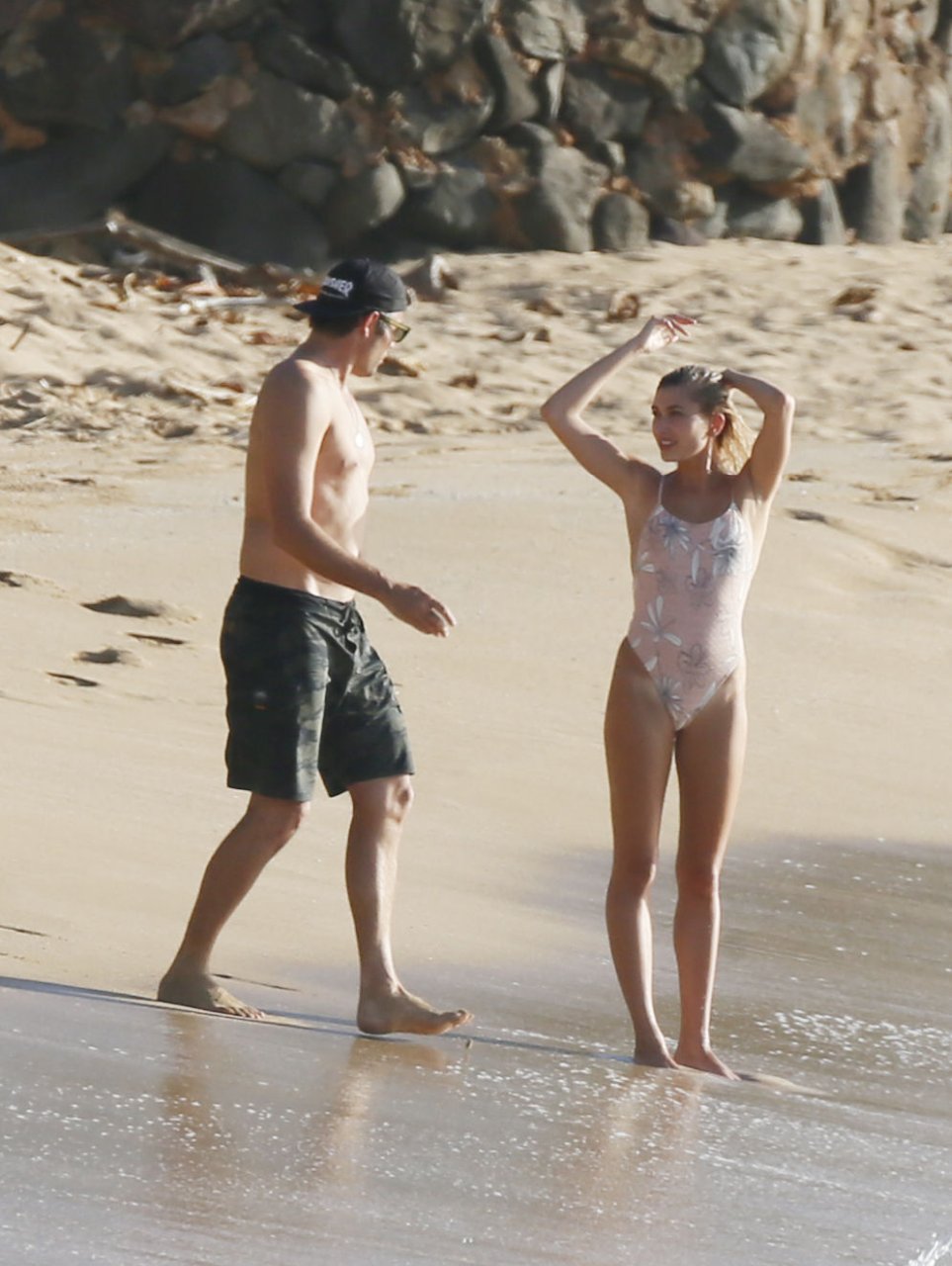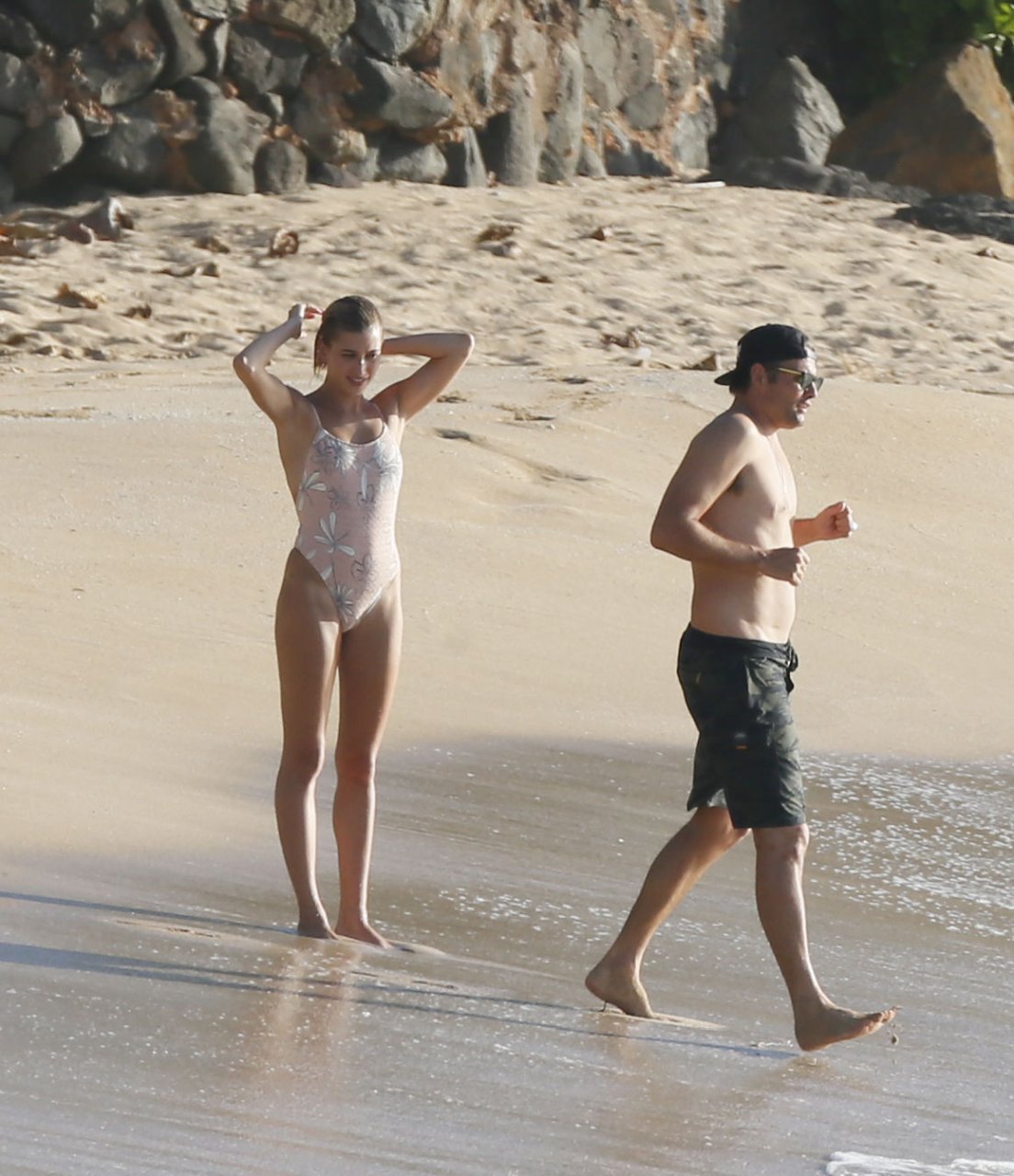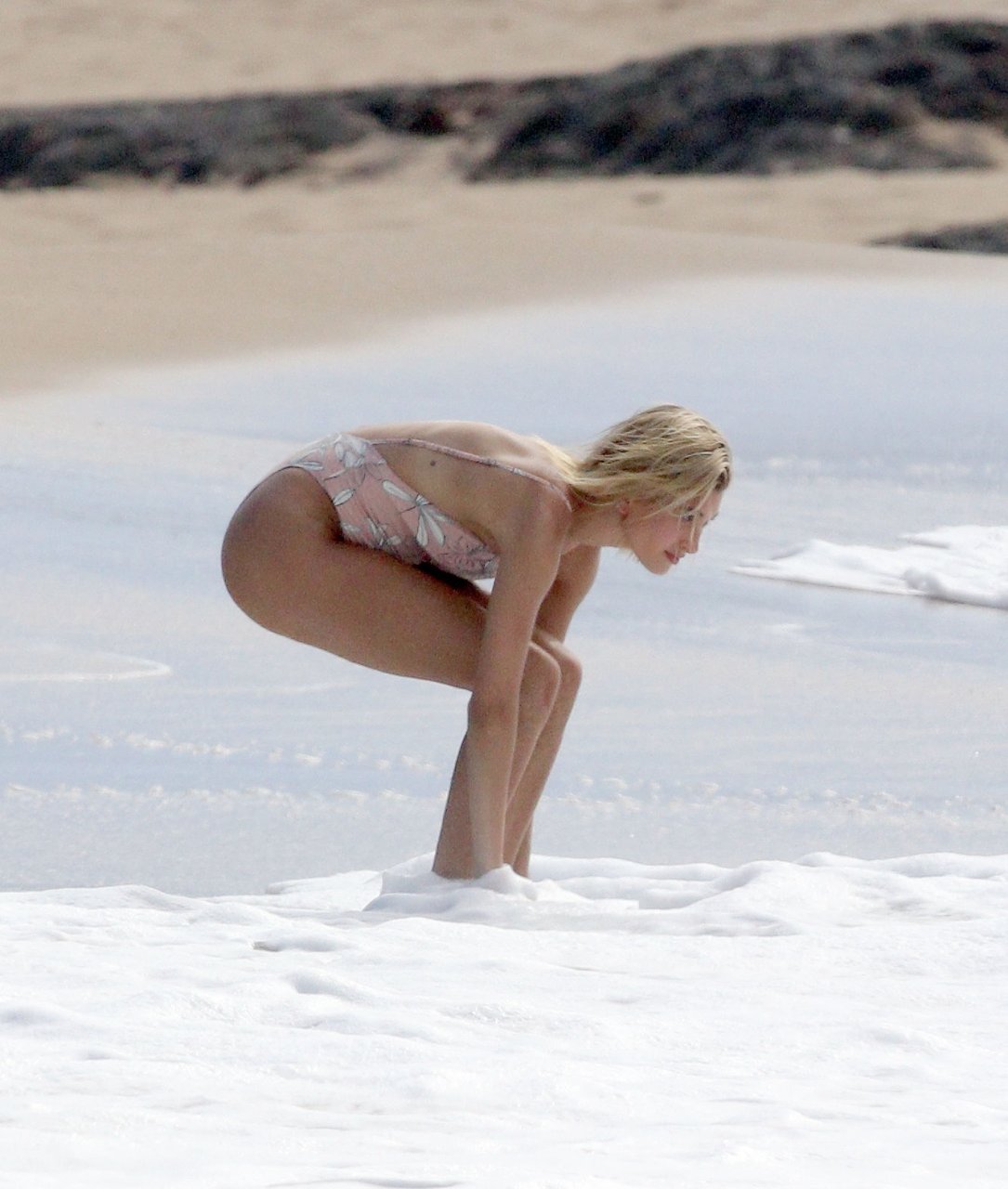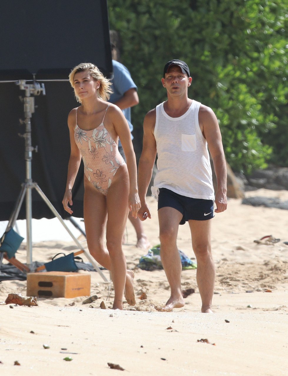 Хейли Болдуин отправилась на пляж на Гавайях для фотосессии, 30.05.2018. 21-летняя супермодель позировала в розовом слитном купальнике с цветочным принтом, резвясь в воде после съемок на пляже.
