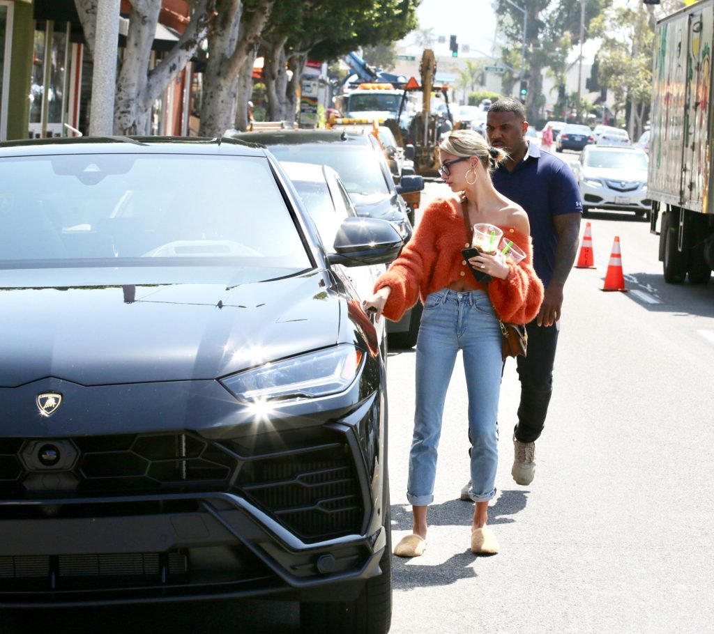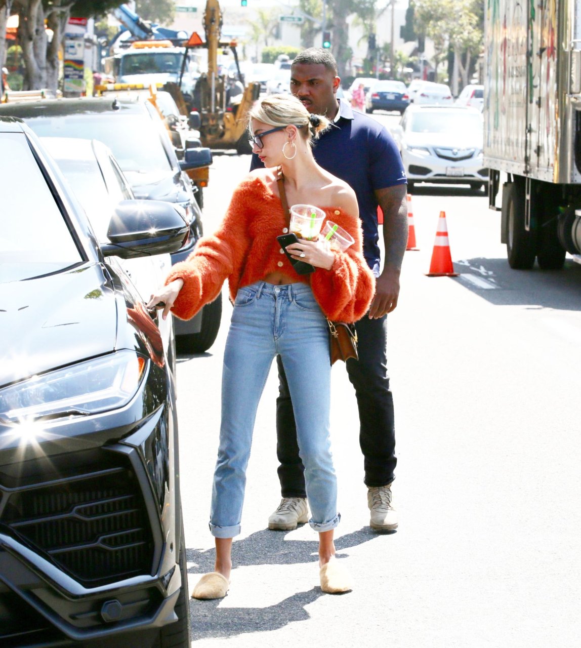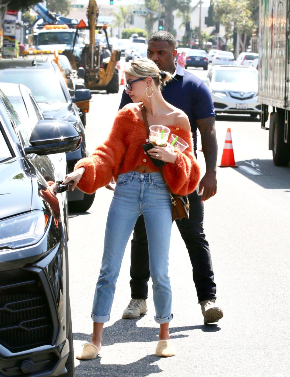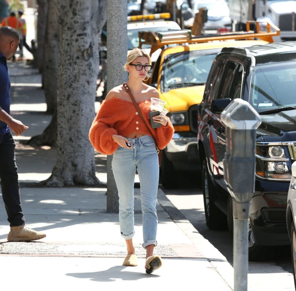 Хейли Болдуин делает перерыв от мужа Джастина Бибера, чтобы заняться делами и купить холодный кофе после возвращения из Южного Бэй в Лос-Анджелес, 25.04.2019. Топ-модель демонстрирует свои идеальные мышцы пресса, появляясь без бюстгальтера в пушистом оранжевом укороченном свитере с открытыми плечами, в сочетании с синими джинсами и нейтральными пушистыми шлепанцами.