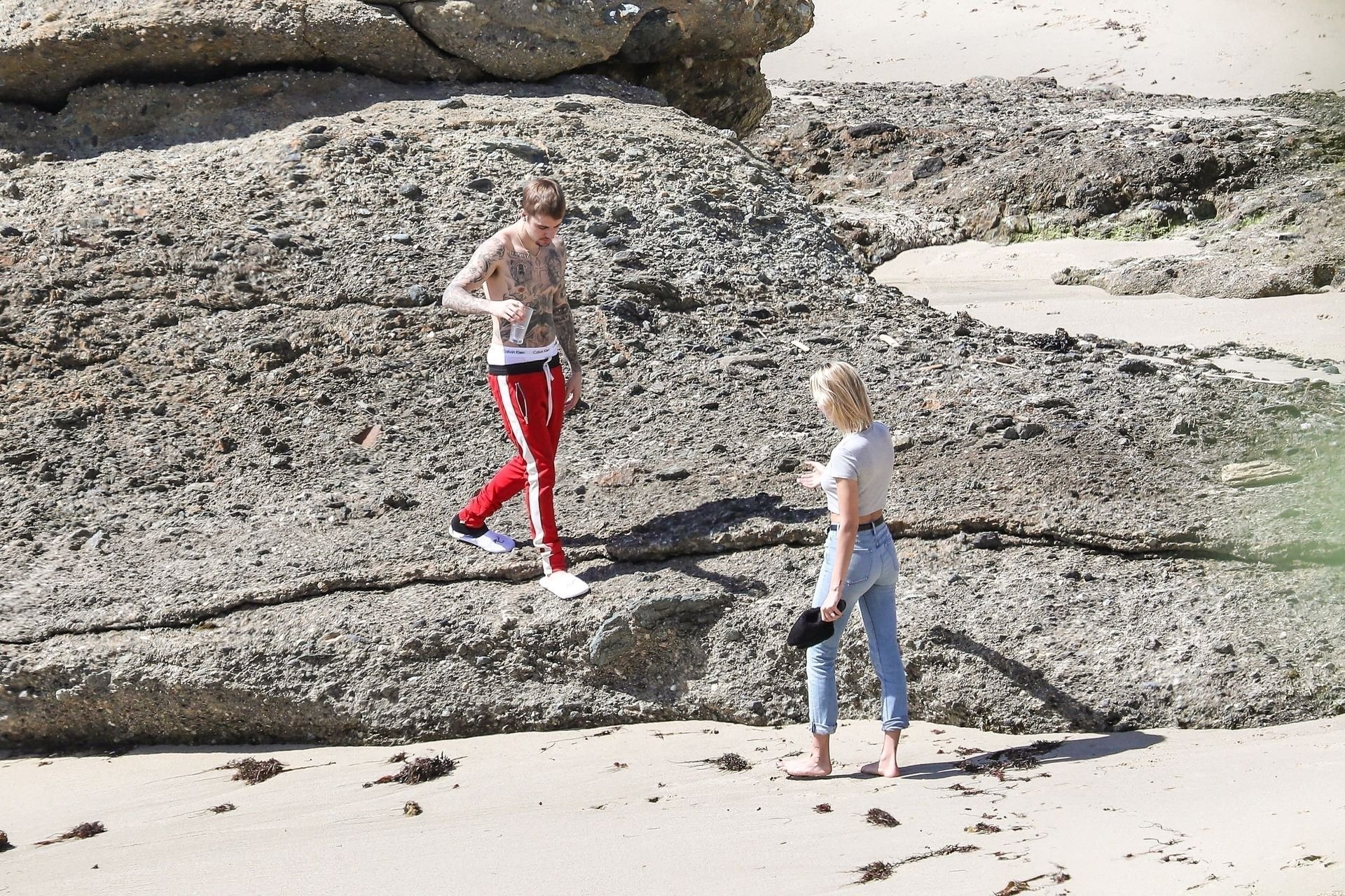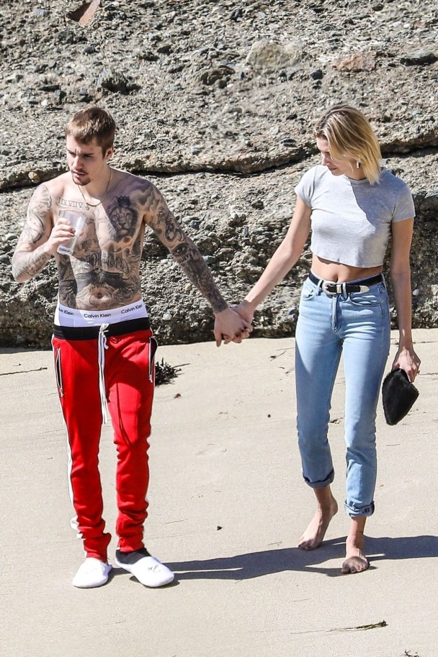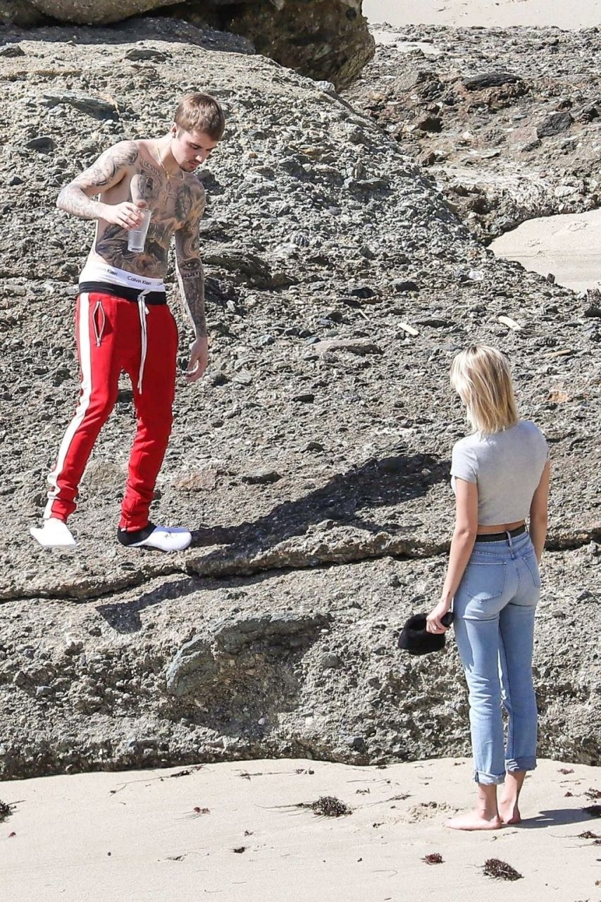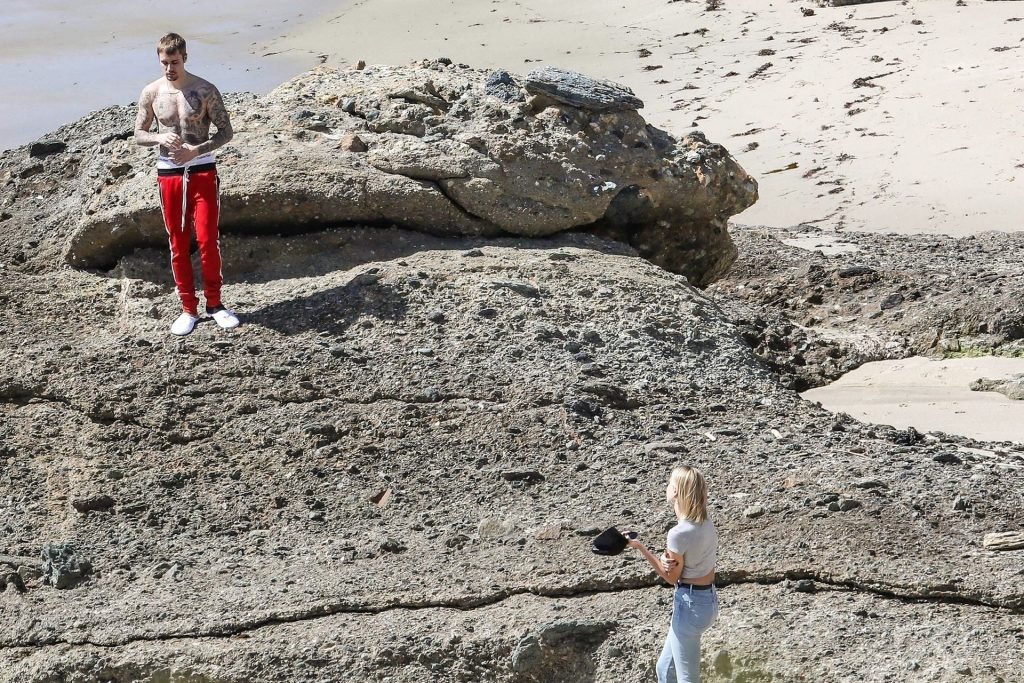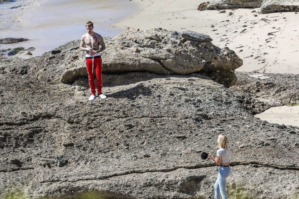 Пара прогуливается романтической тропой по утесам и песку, встречая поклонников, которых они приветствуют улыбками и селфи! В какой-то момент Джастин кажется задумчивым, стоя на маленьком утесе и глядя на разбивающиеся волны с опущенной головой. Джей Би был без рубашки на протяжении всей прогулки; тем временем его жена Хейли была одета в светлые джинсы и серый укороченный топ.