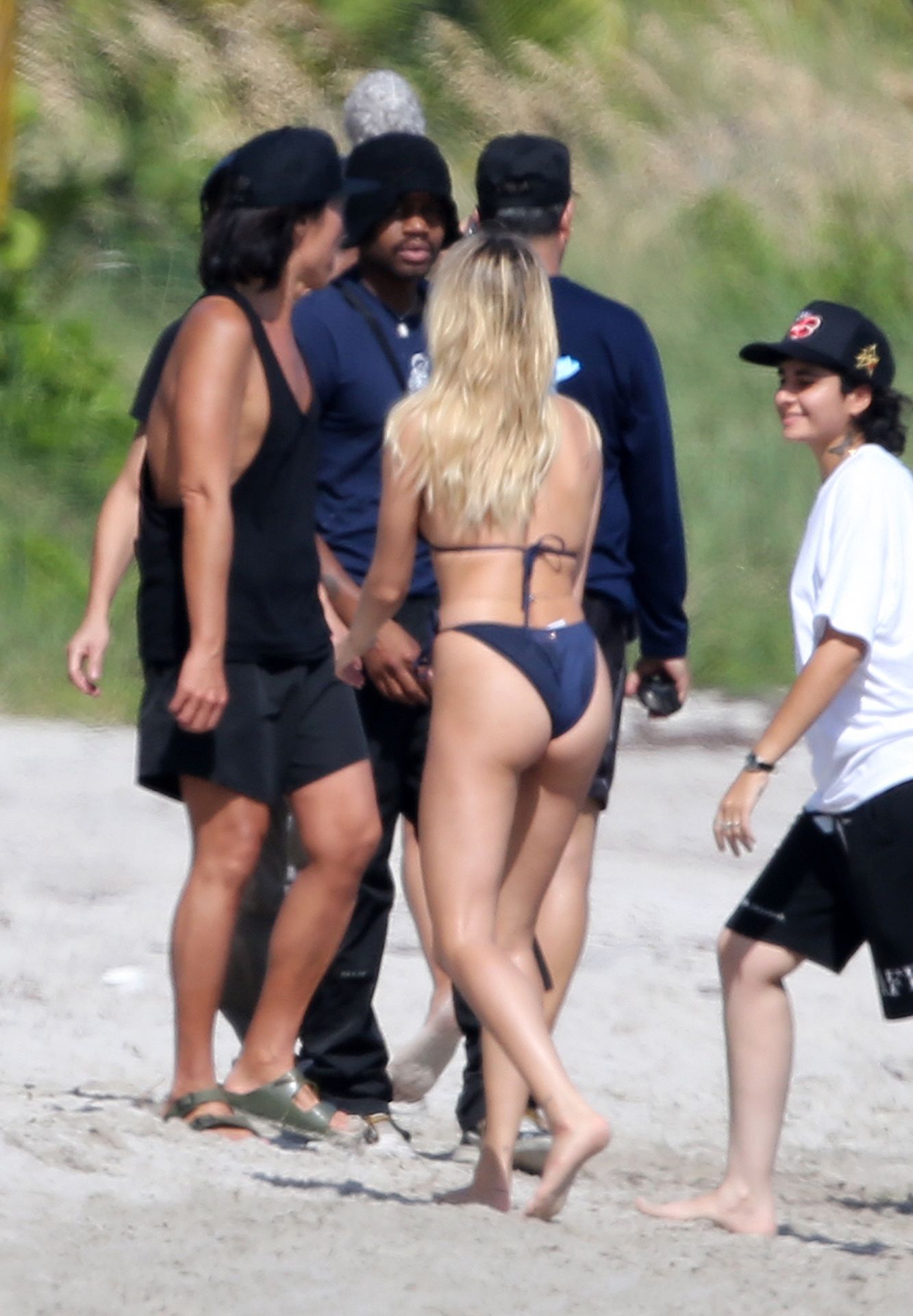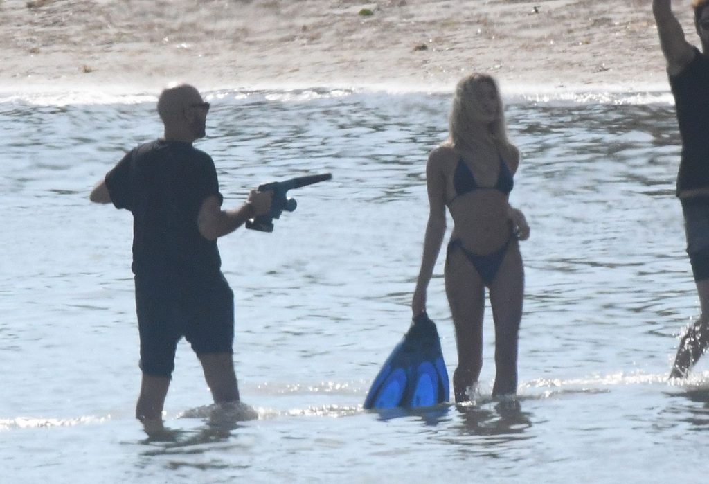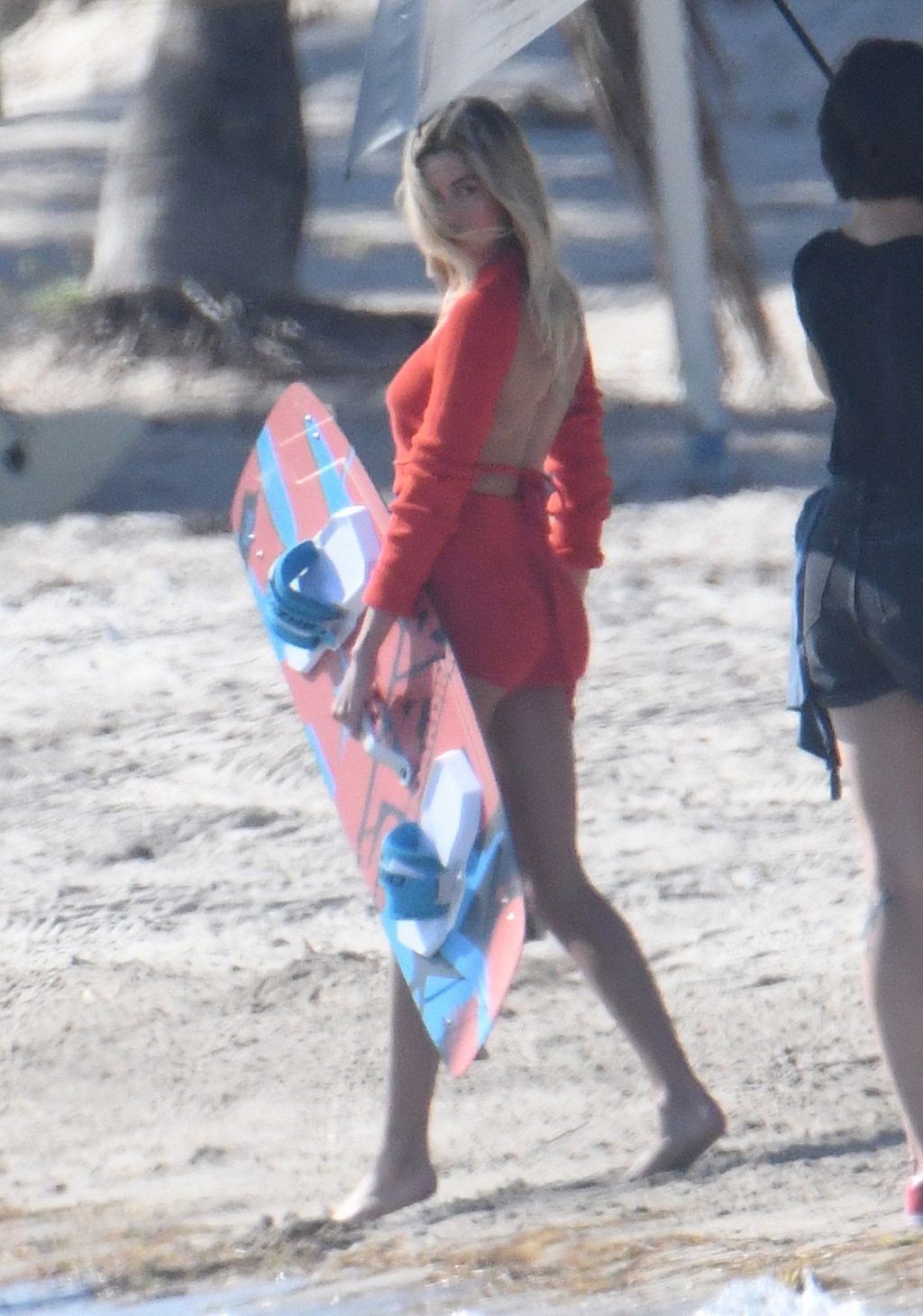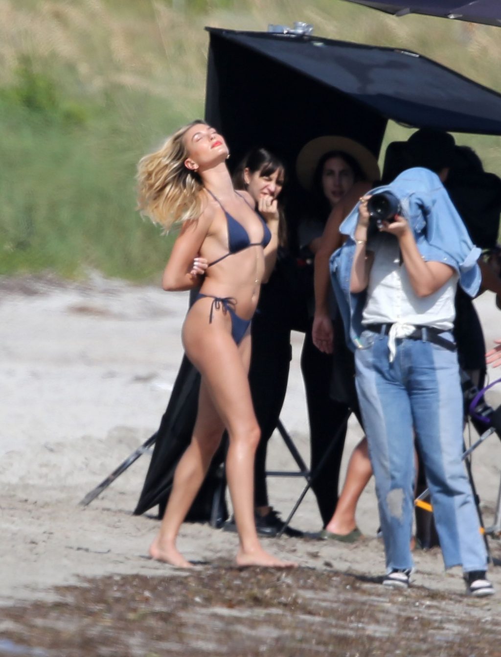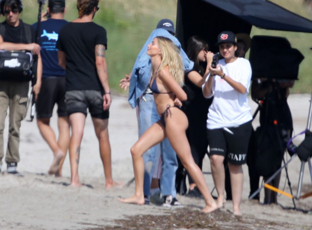Модель Хейли Бибер в синем, красном и жёлтом купальниках позирует во время фотосессии на пляже в Майами, 27.11.2019.