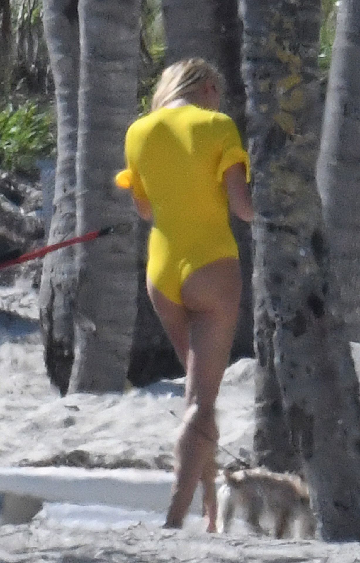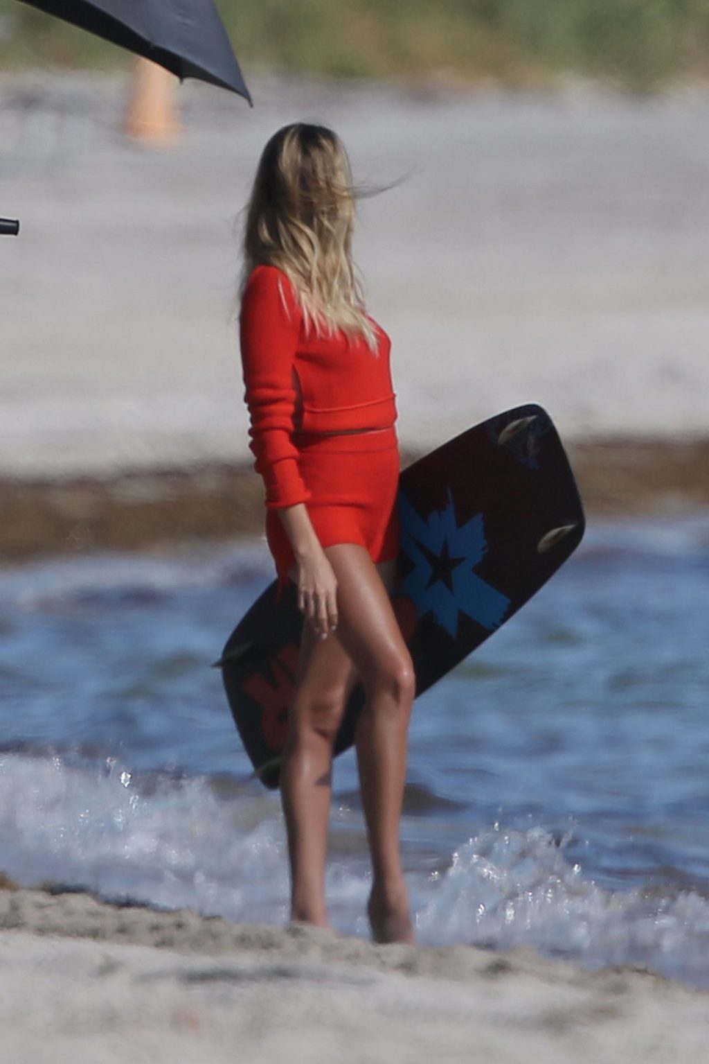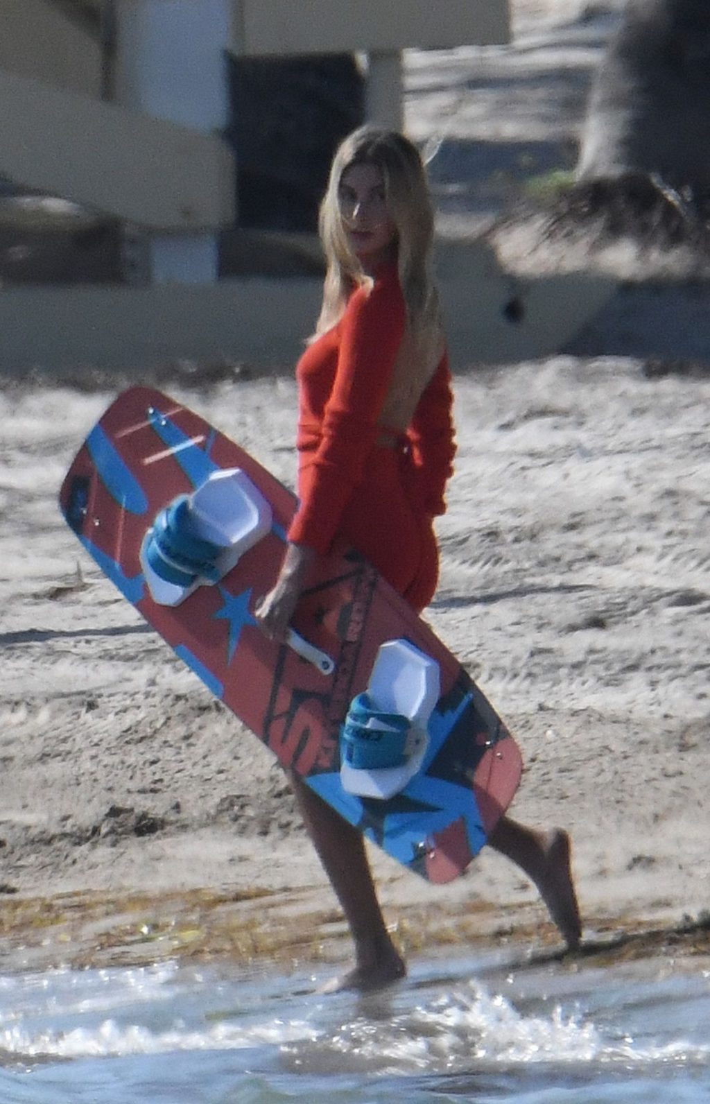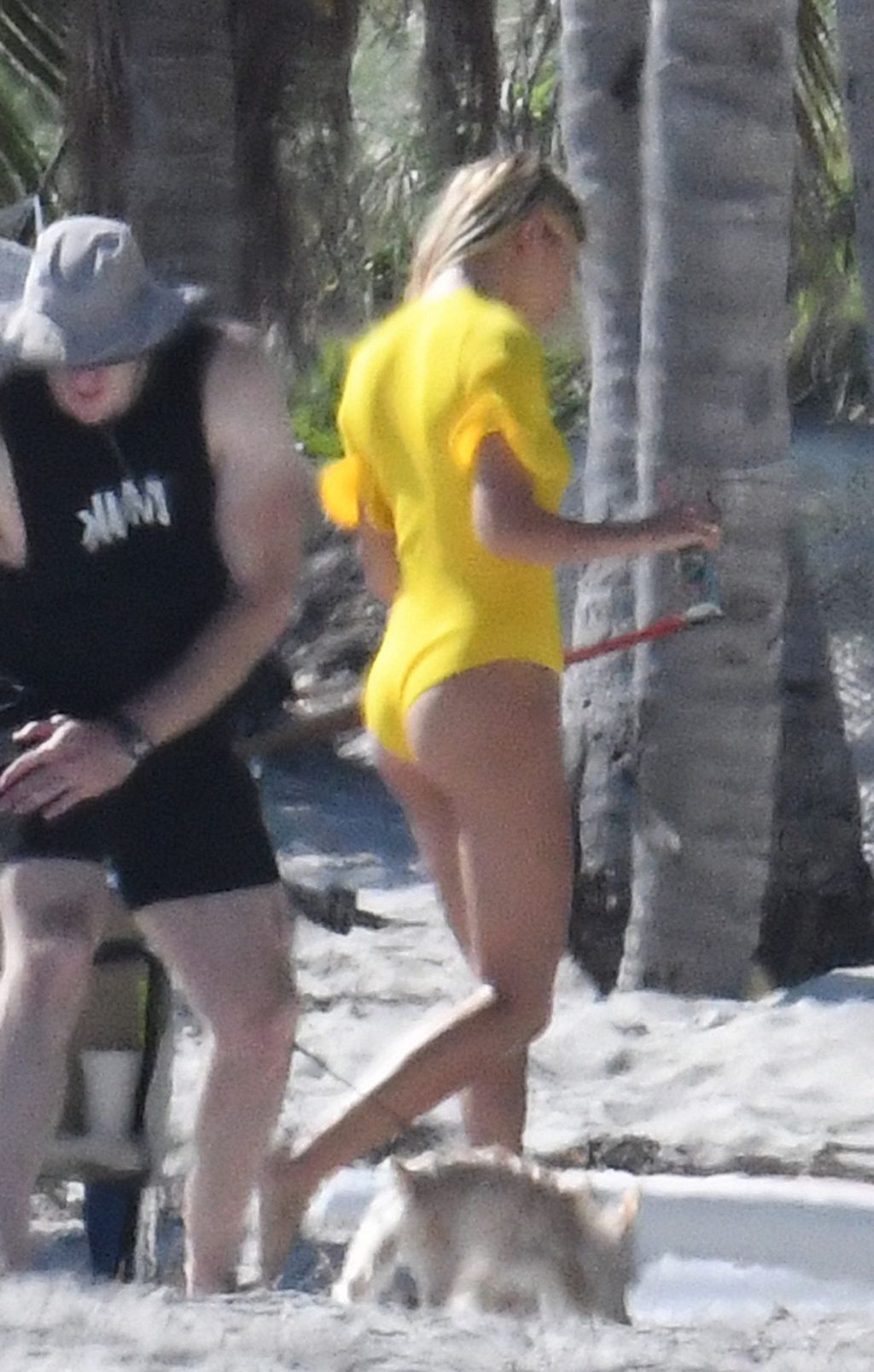 Модель Хейли Бибер в синем, красном и жёлтом купальниках позирует во время фотосессии на пляже в Майами, 27.11.2019.