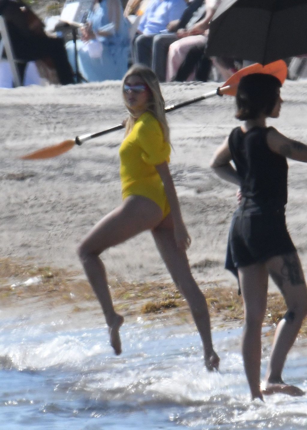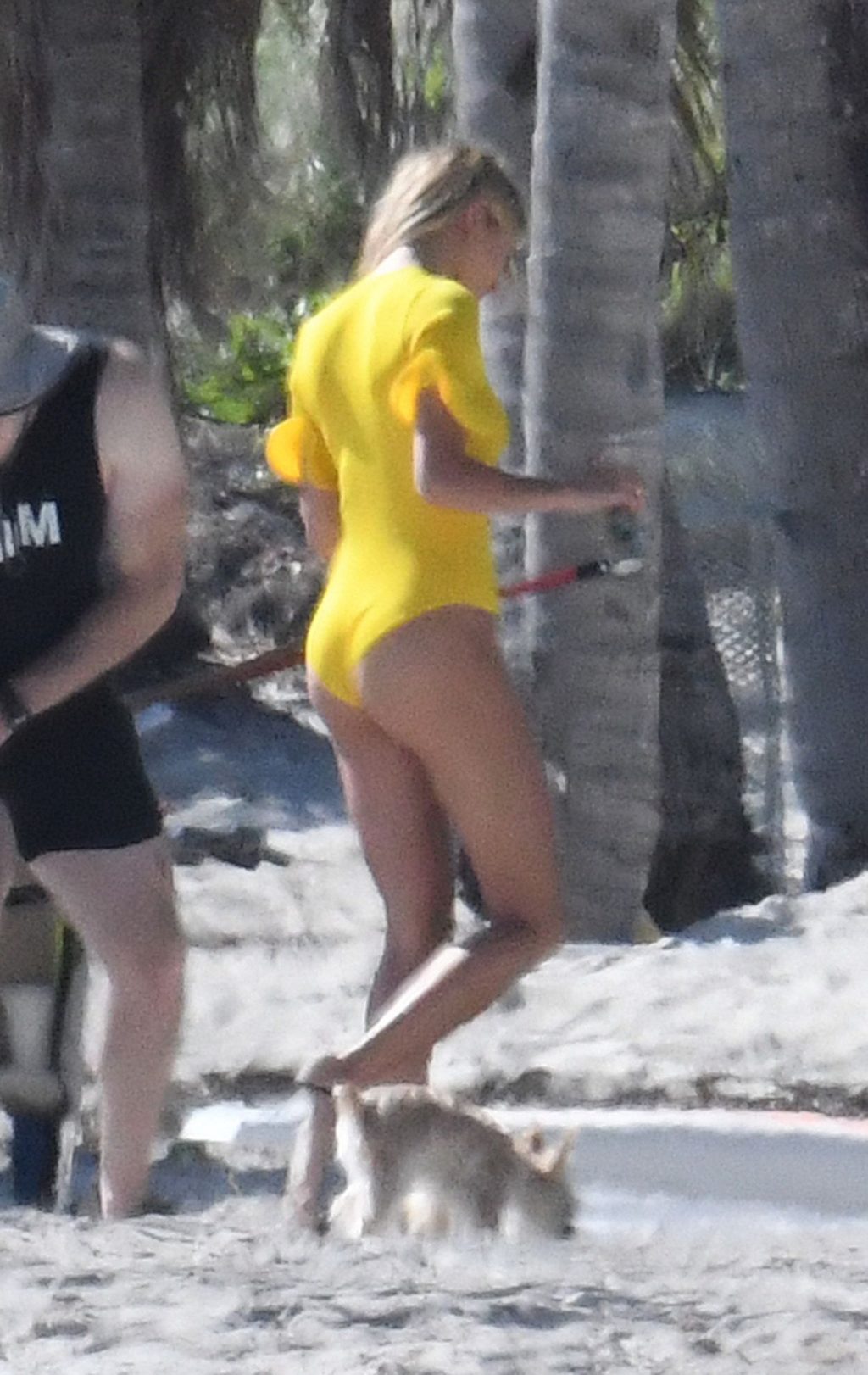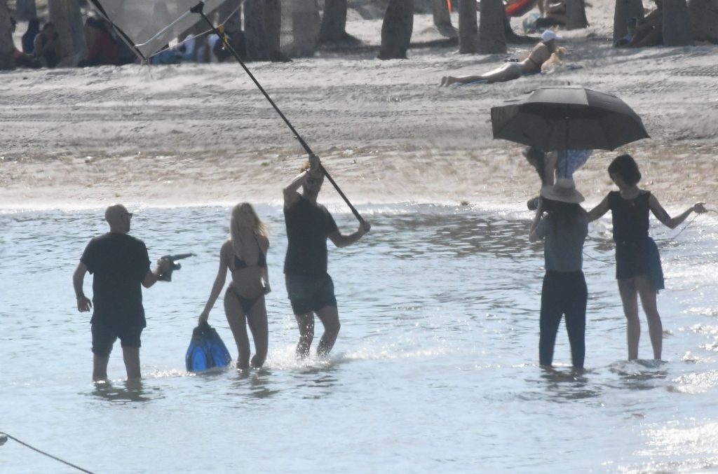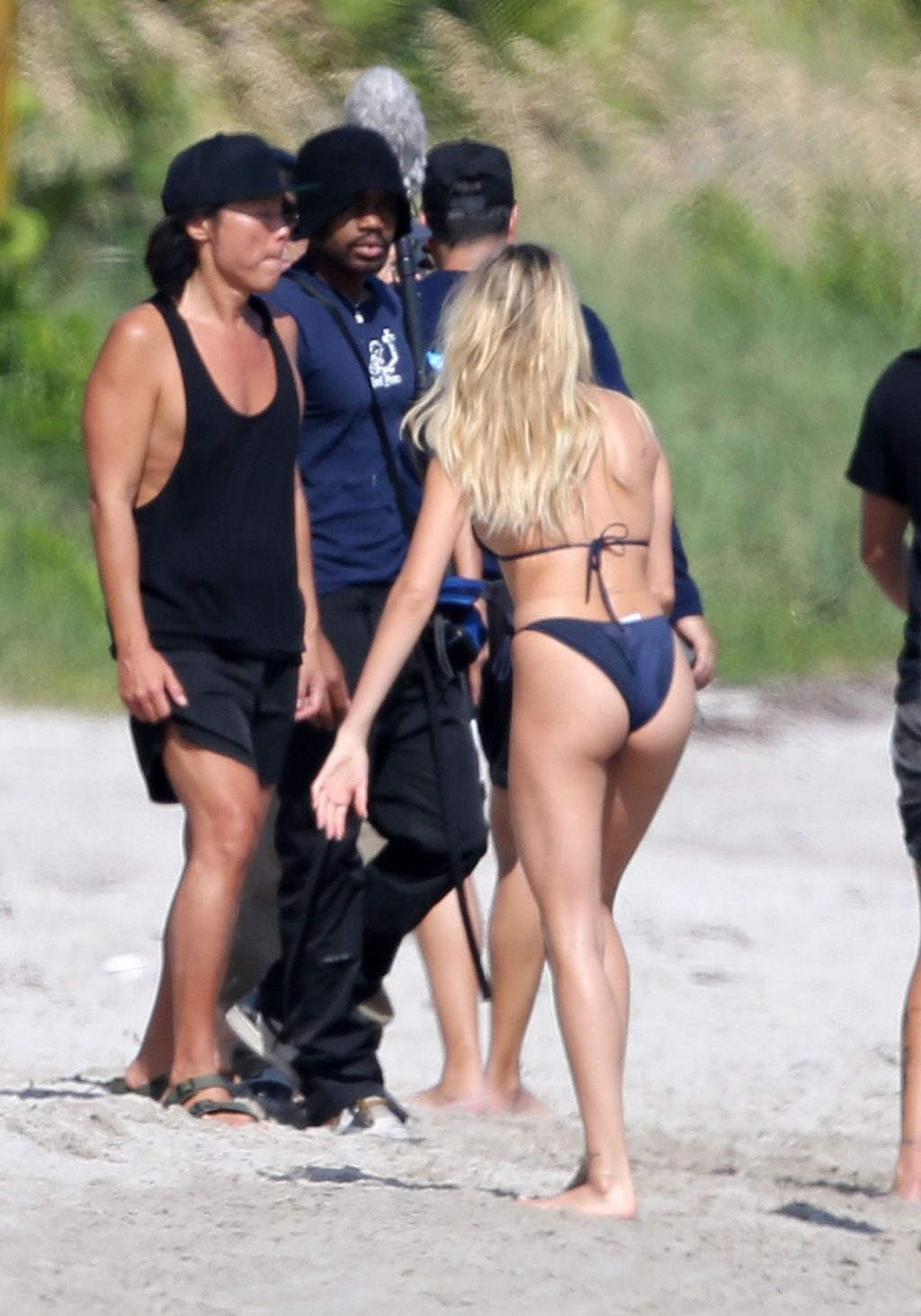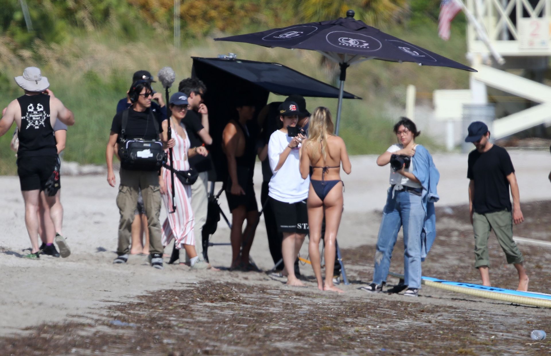 Модель Хейли Бибер в синем, красном и жёлтом купальниках позирует во время фотосессии на пляже в Майами, 27.11.2019.