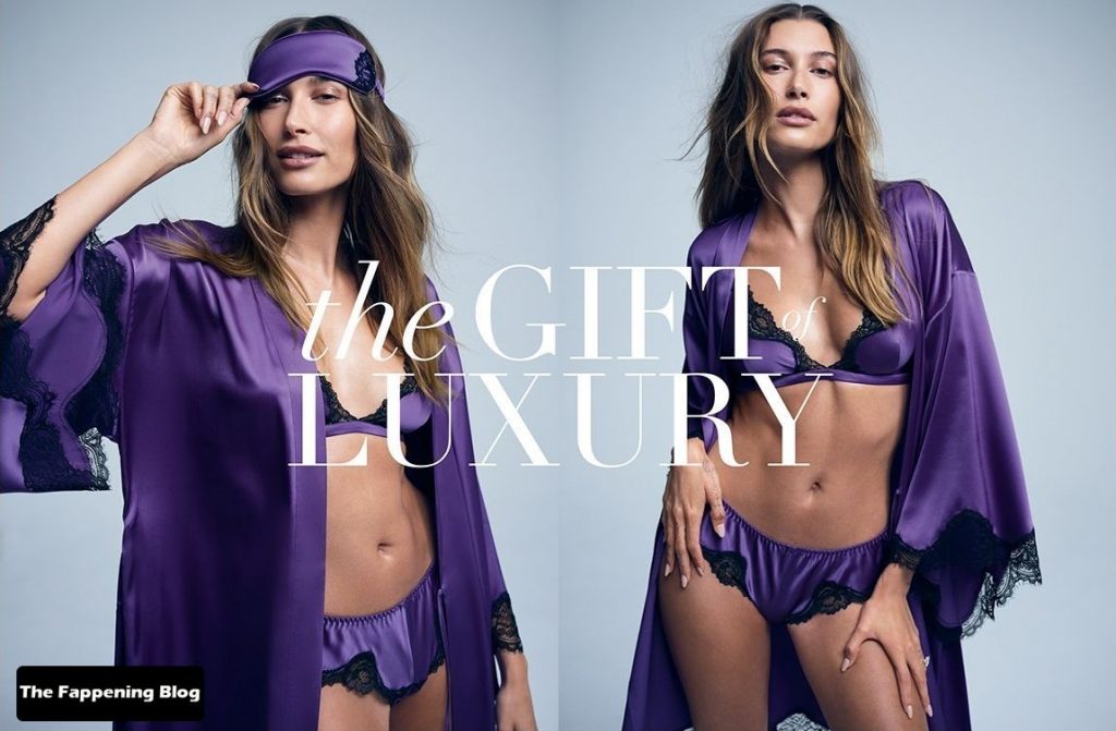 Модель Хейли Бибер демонстрирует свою сексуальную фигуру, позируя в различных шелковых комплектах, рекламируя новую коллекцию Victoria’s Secret (ноябрь 2021).