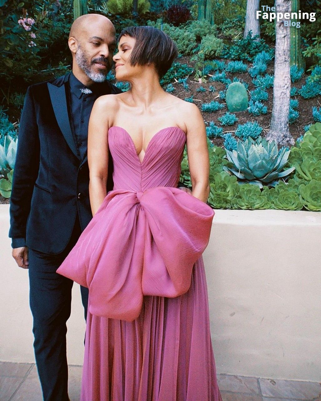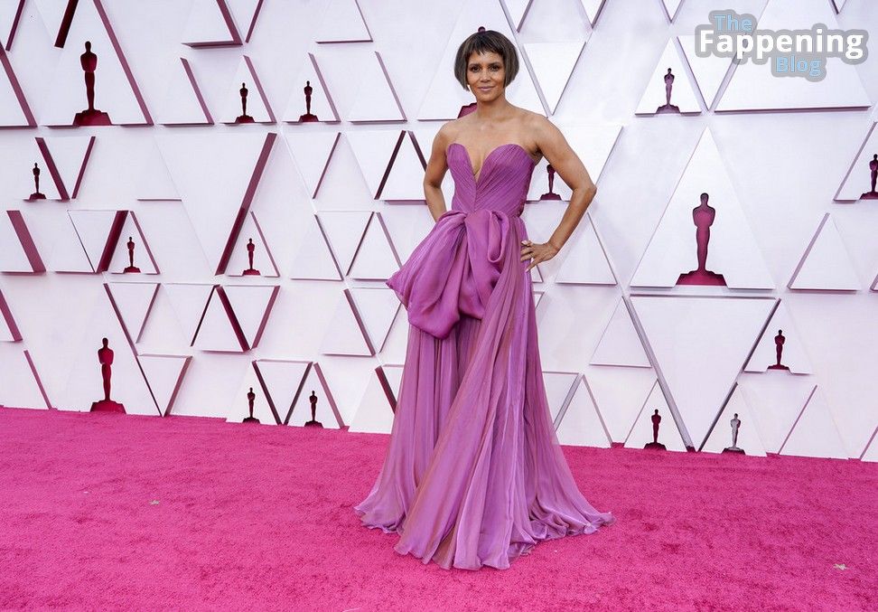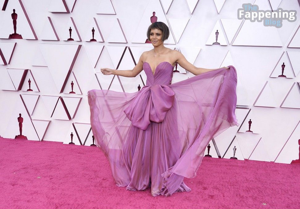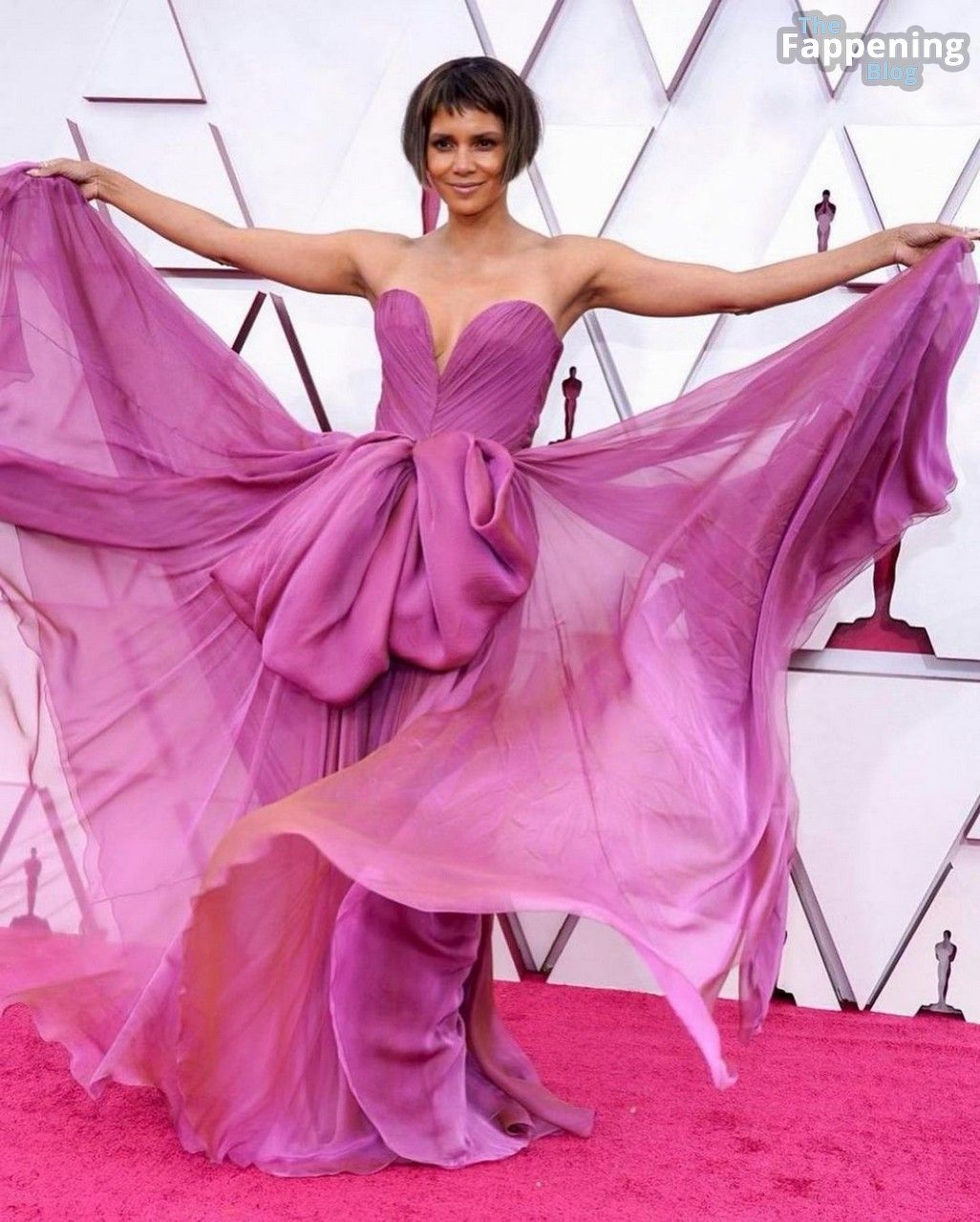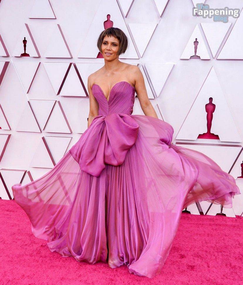 Найдите минутку, чтобы полюбоваться роскошным шелковым платьем Хэлли Берри: когда она кружится и играет с подолом, она напоминает редкую сиреневую бабочку, завораживающую и очаровывающую. Сочетание корсета и драпировки создаёт выигрышный и гламурный образ для любого особого случая. Это яркий и притягательный образ для красной дорожки, не оставляющий сомнений.
