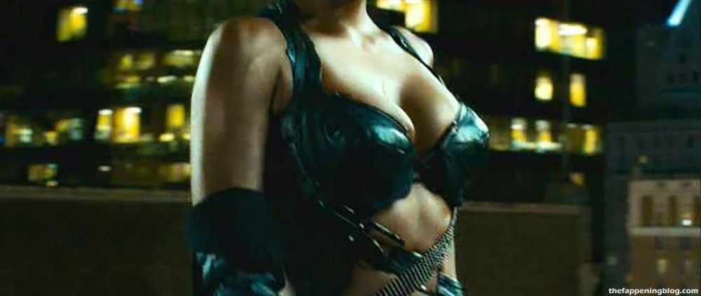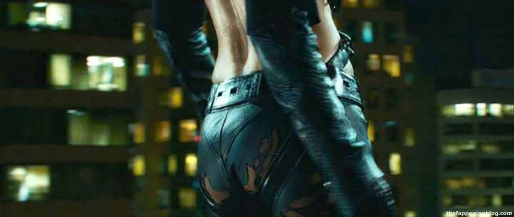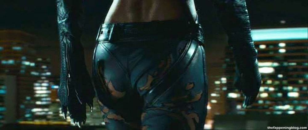 Halle Berry is sexy in tight leather pants and a top that shows lots of her cleavage. The camera is circling her while she walks across a rooftop. The scene is from the famous ‘Catwoman’ film.